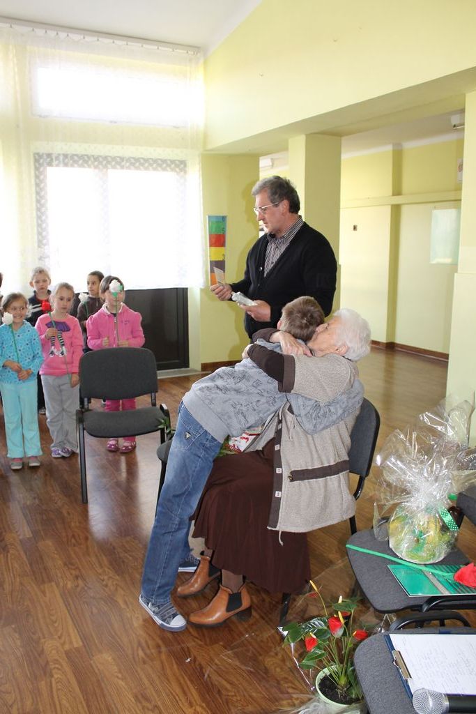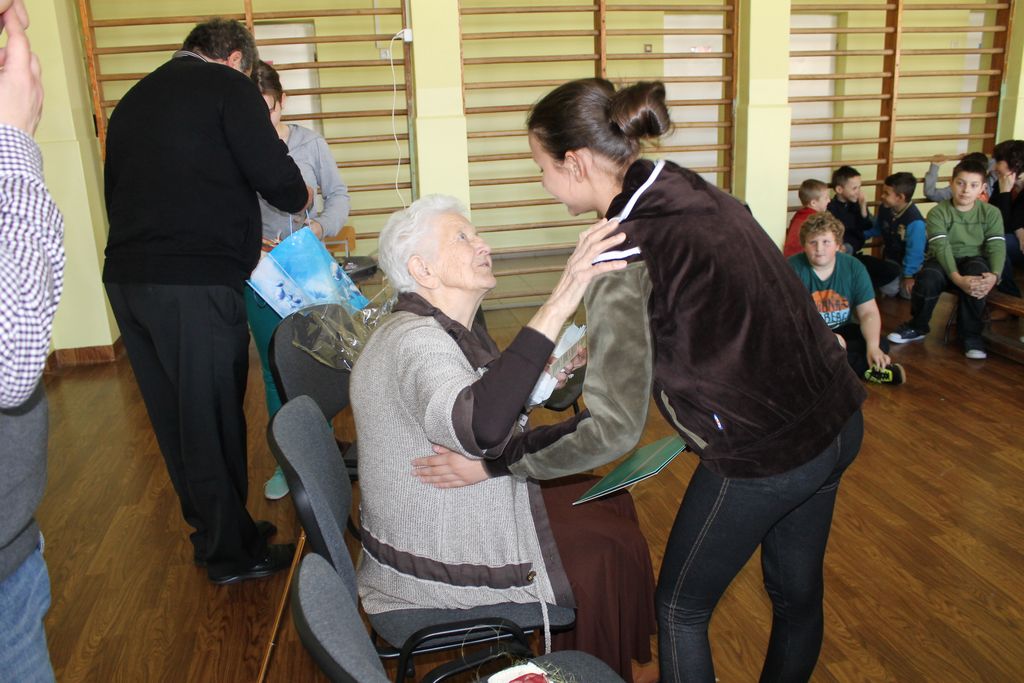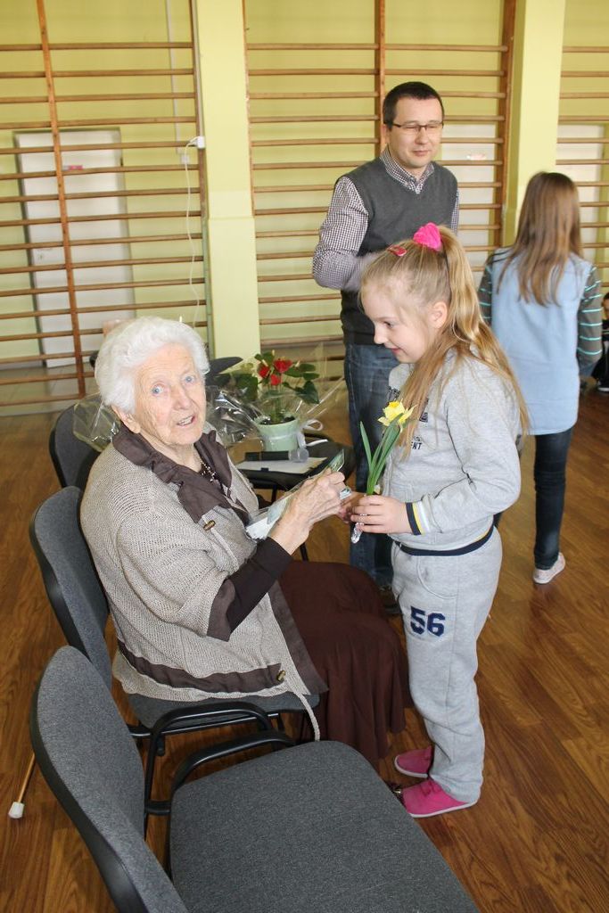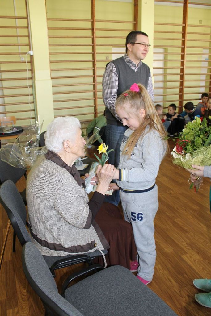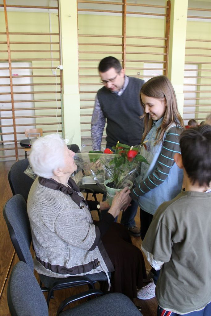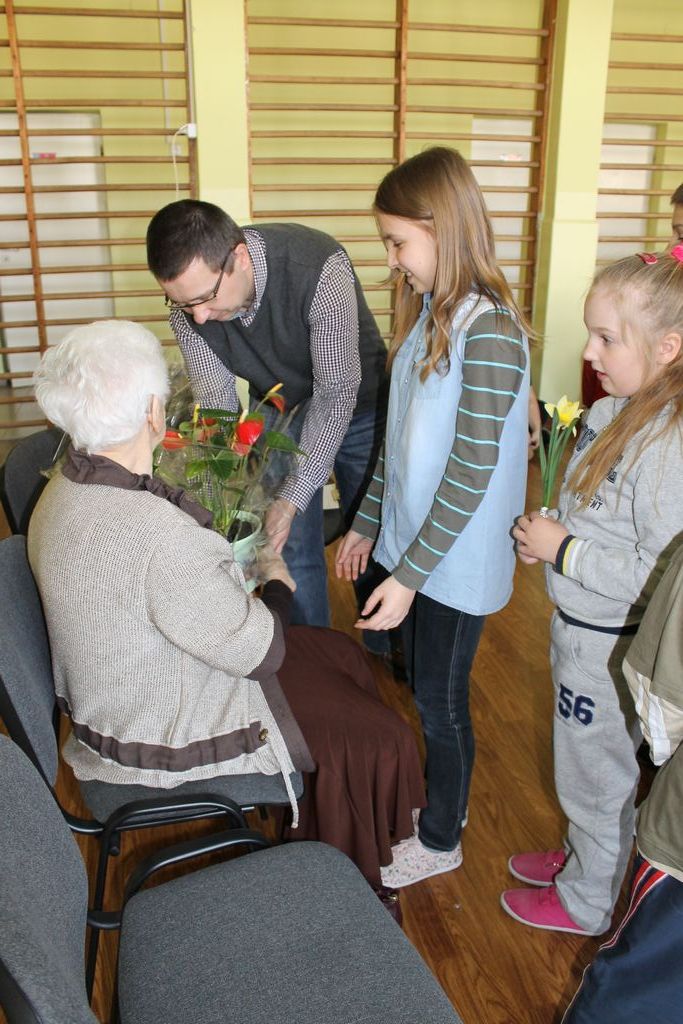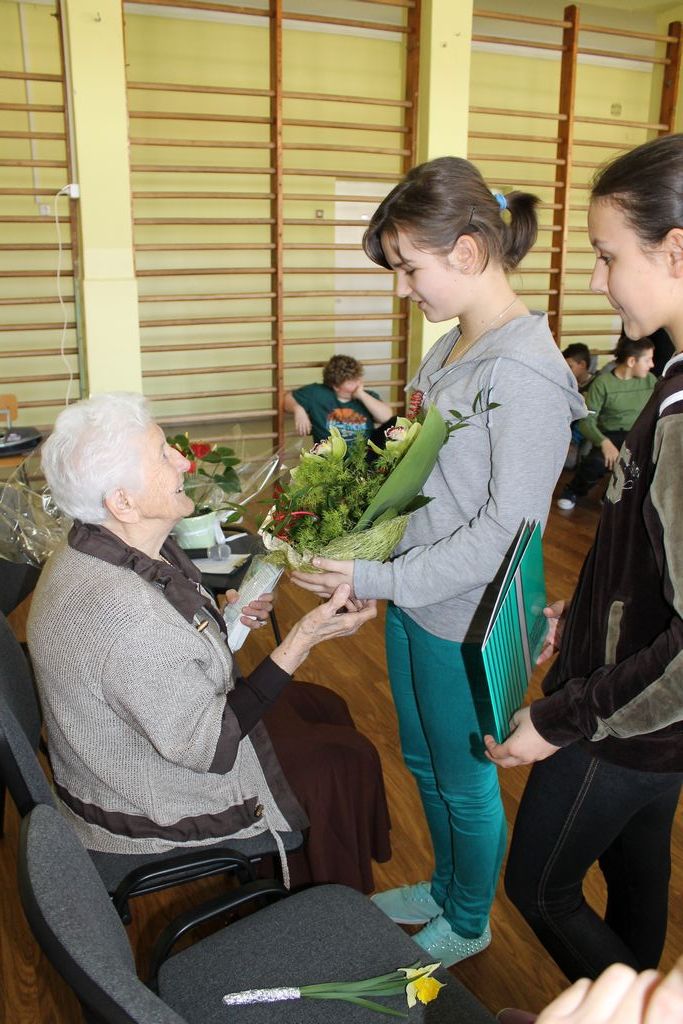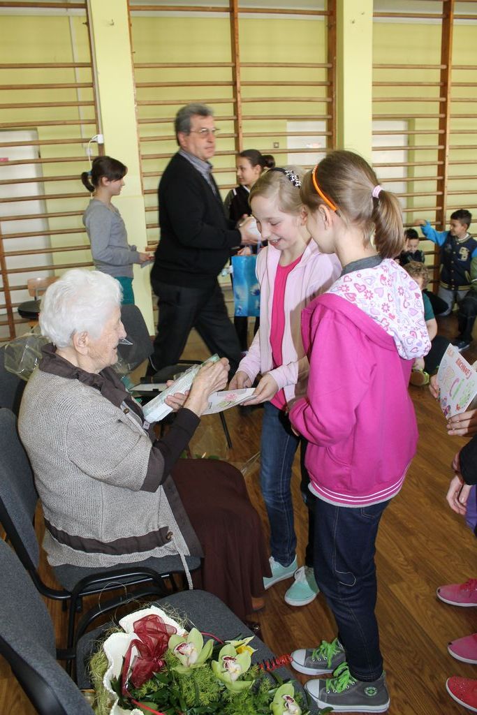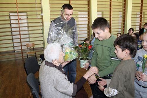 W następnej części spotkania wszyscy uczniowie chcieli osobiście przywitać się z babcią Stefanią, która wyściskała i wycałowała każdego z osobna. Dzieci wręczały jej kwiaty i własnoręcznie wykonane laurki. Uczniowie klasy szóstej podarowali jej zespołowe zdjęcie całej klasy, aby pamiętała o nich, gdy odejdą do gimnazjum. Uczniowie pierwszej klasy zaśpiewali brawurowo dwie piosenki, które wszystkim, a szczególnie gościom, bardzo się podobały. Również czwartoklasiści zaśpiewali piosenkę. Na koniec Emilka Zych z klasy piątej wyrecytowała wiersz Jana Brzechwy – „Kwoka”, za który otrzymała I miejsce w Konkursie Recytatorskim im. Marii Kozaczkowej.