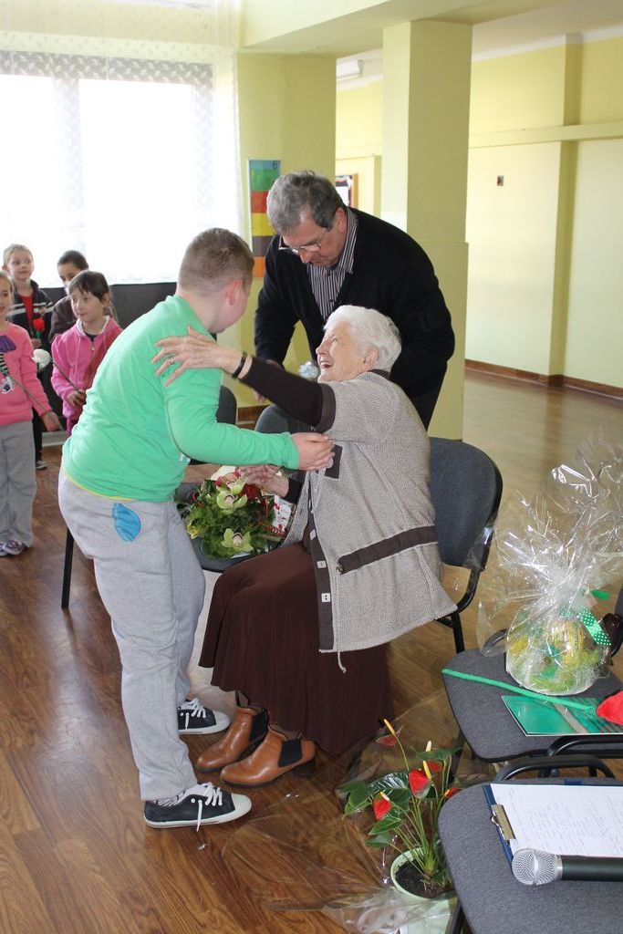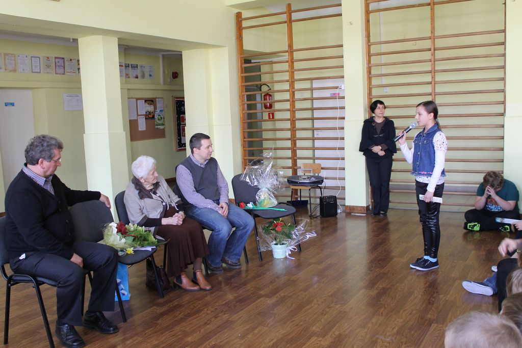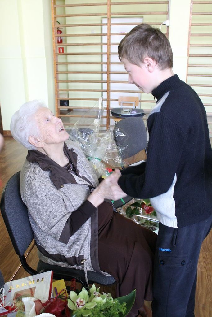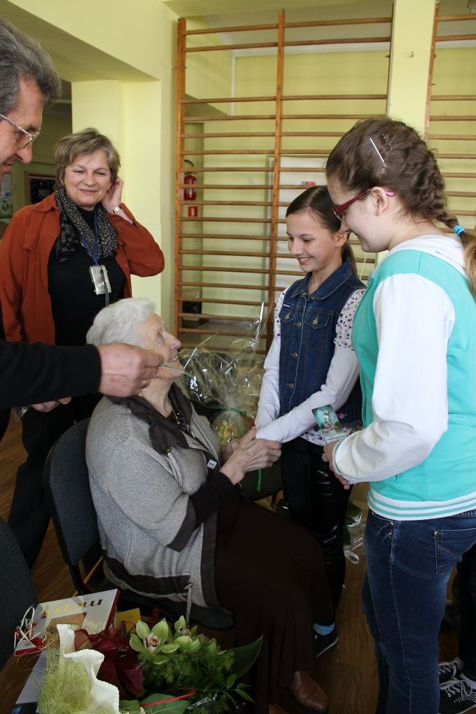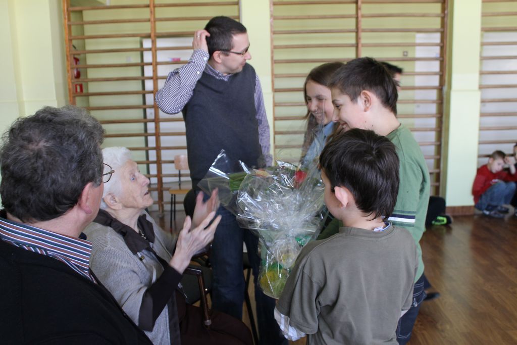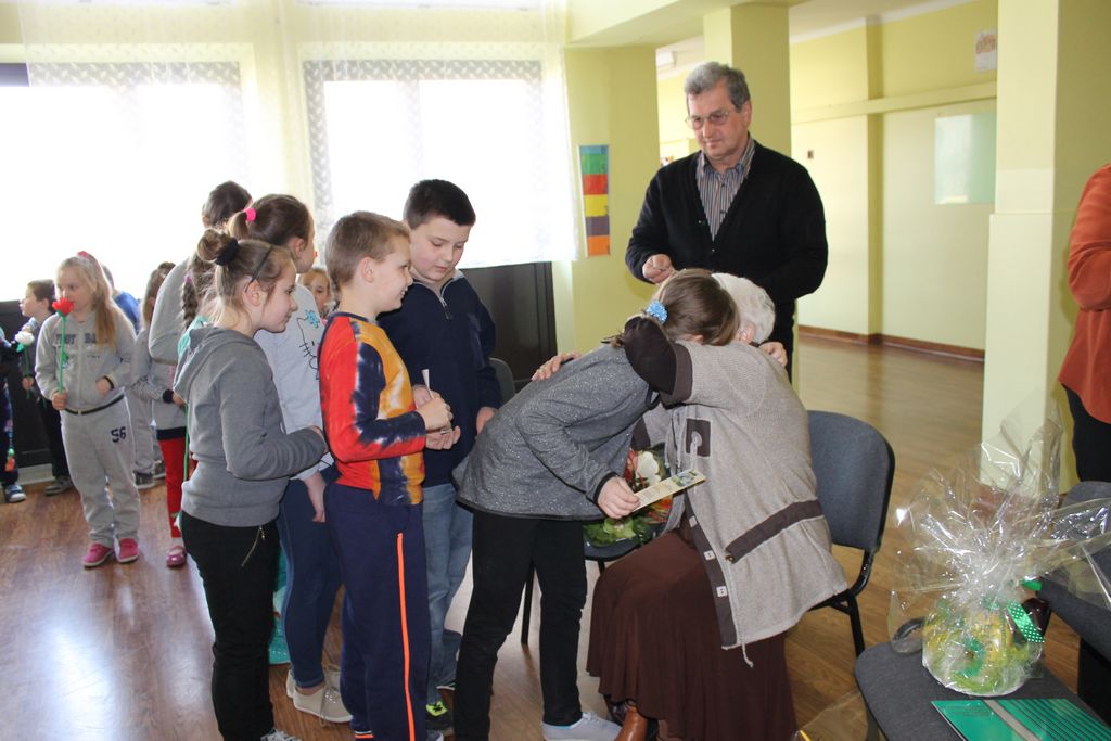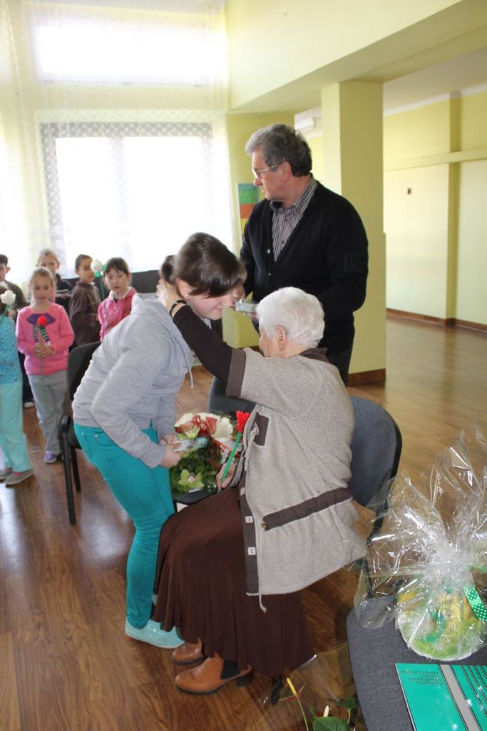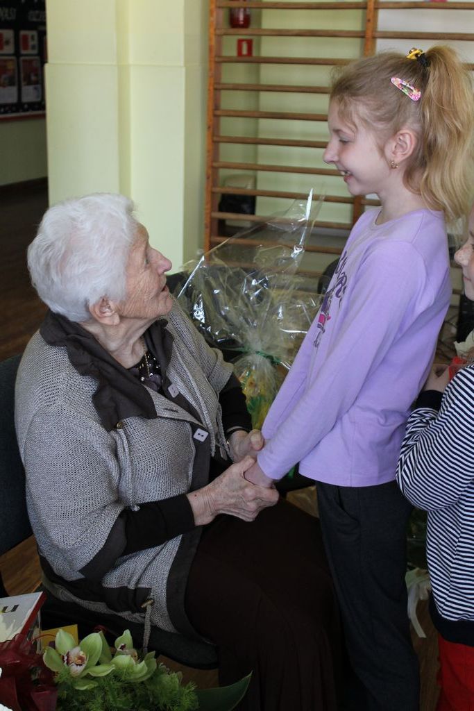 W następnej części spotkania wszyscy uczniowie chcieli osobiście przywitać się z babcią Stefanią, która wyściskała i wycałowała każdego z osobna. Dzieci wręczały jej kwiaty i własnoręcznie wykonane laurki. Uczniowie klasy szóstej podarowali jej zespołowe zdjęcie całej klasy, aby pamiętała o nich, gdy odejdą do gimnazjum. Uczniowie pierwszej klasy zaśpiewali brawurowo dwie piosenki, które wszystkim, a szczególnie gościom, bardzo się podobały. Również czwartoklasiści zaśpiewali piosenkę. Na koniec Emilka Zych z klasy piątej wyrecytowała wiersz Jana Brzechwy – „Kwoka”, za który otrzymała I miejsce w Konkursie Recytatorskim im. Marii Kozaczkowej.