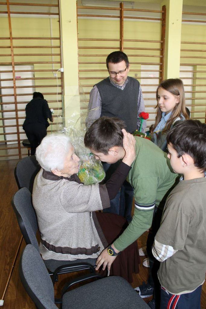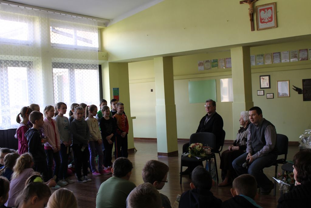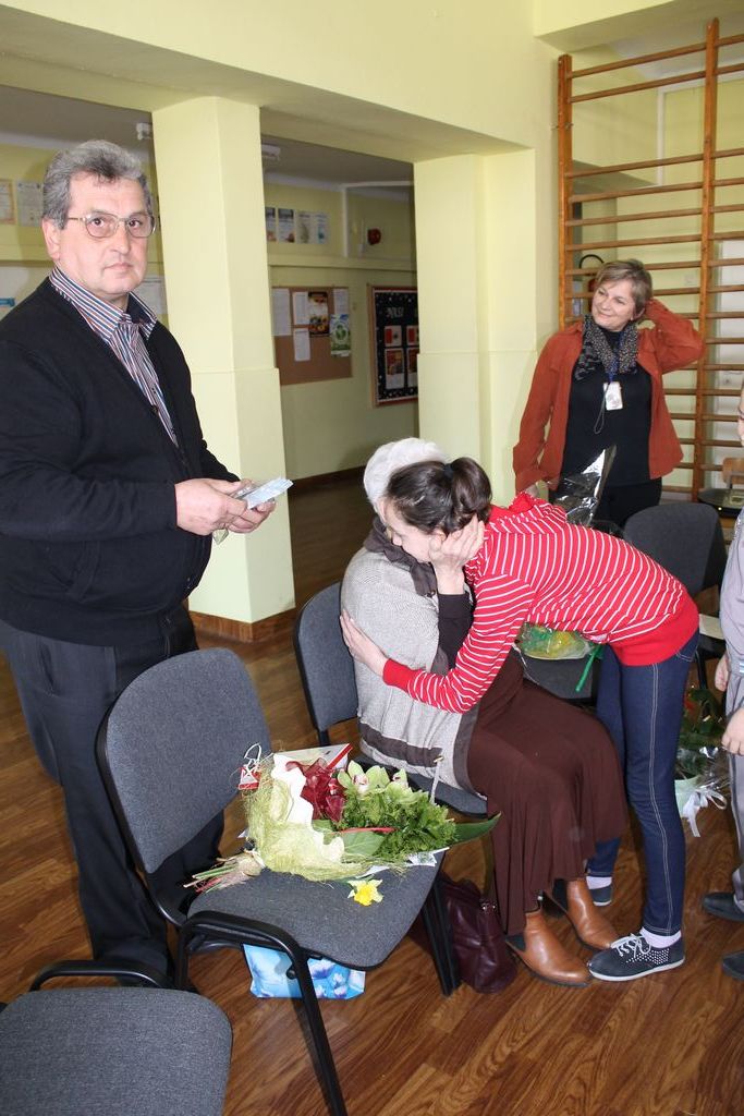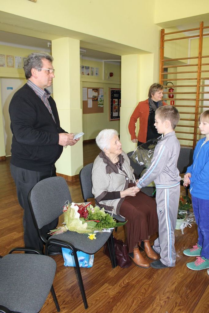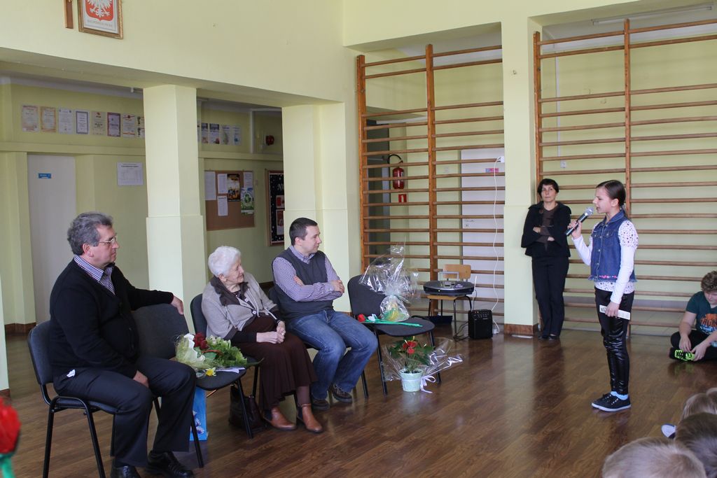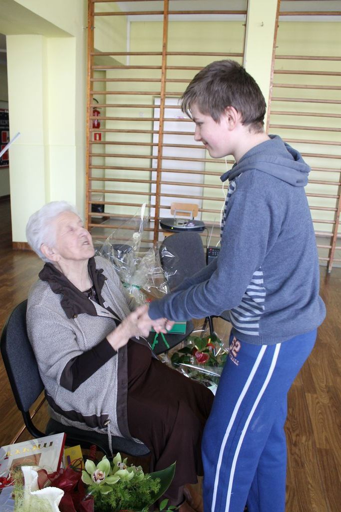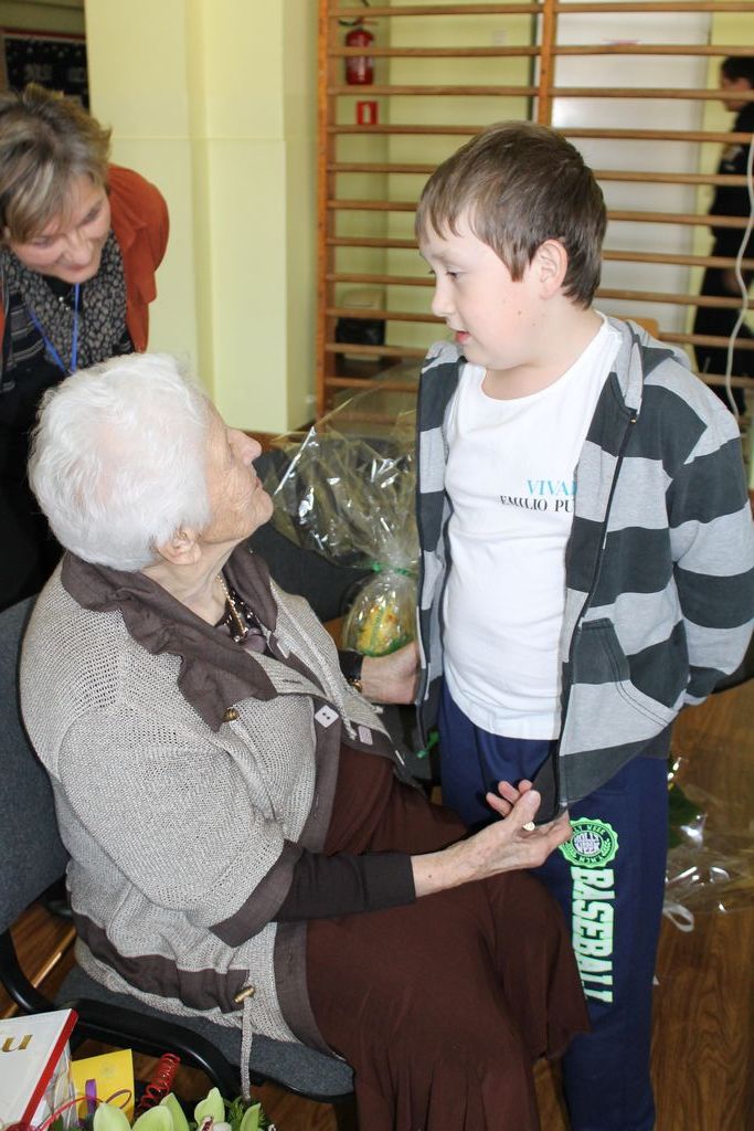 W następnej części spotkania wszyscy uczniowie chcieli osobiście przywitać się z babcią Stefanią, która wyściskała i wycałowała każdego z osobna. Dzieci wręczały jej kwiaty i własnoręcznie wykonane laurki. Uczniowie klasy szóstej podarowali jej zespołowe zdjęcie całej klasy, aby pamiętała o nich, gdy odejdą do gimnazjum. Uczniowie pierwszej klasy zaśpiewali brawurowo dwie piosenki, które wszystkim, a szczególnie gościom, bardzo się podobały. Również czwartoklasiści zaśpiewali piosenkę. Na koniec Emilka Zych z klasy piątej wyrecytowała wiersz Jana Brzechwy – „Kwoka”, za który otrzymała I miejsce w Konkursie Recytatorskim im. Marii Kozaczkowej.