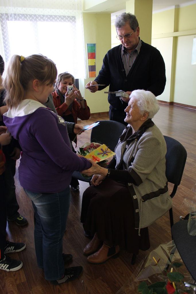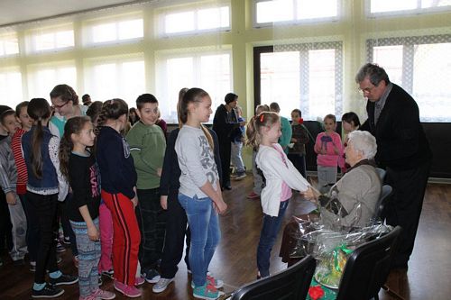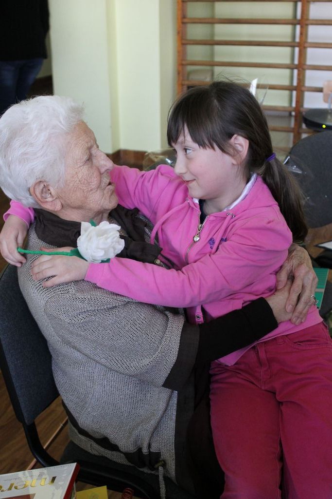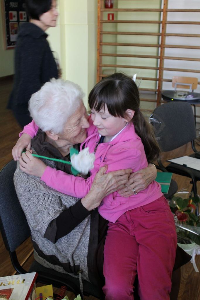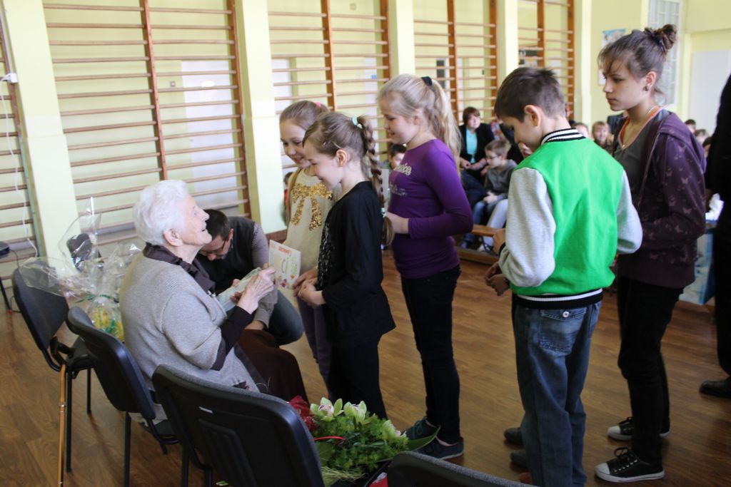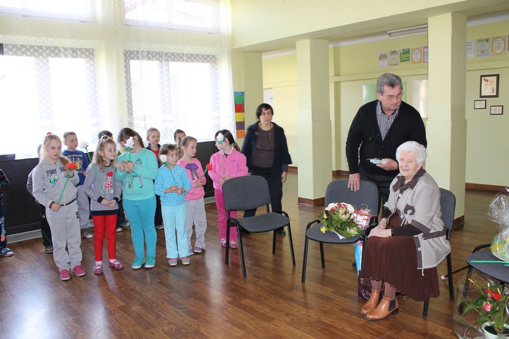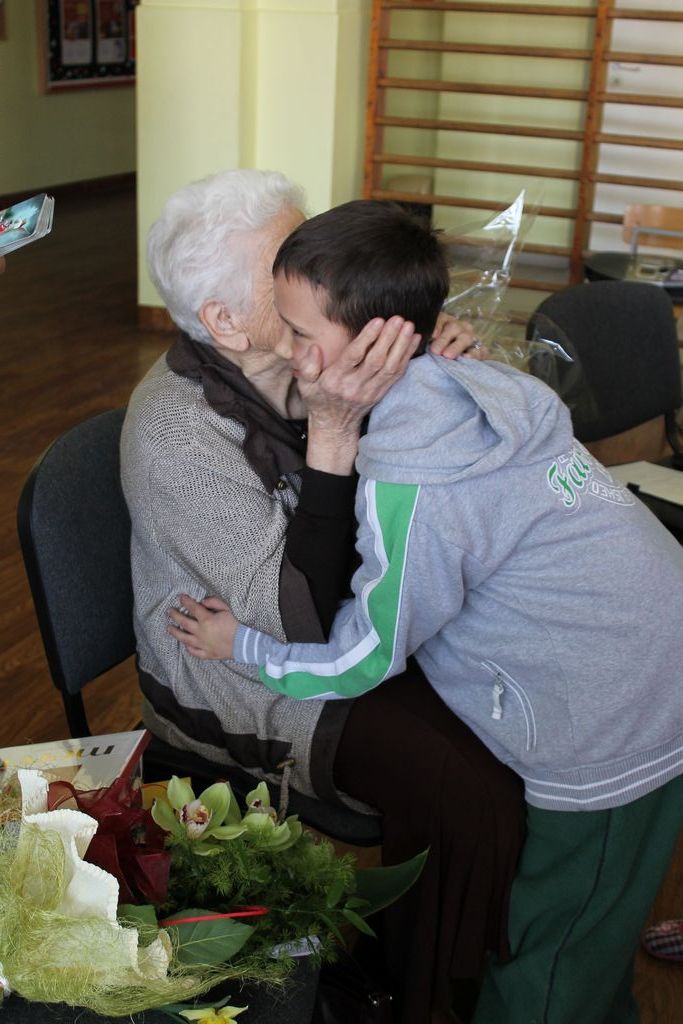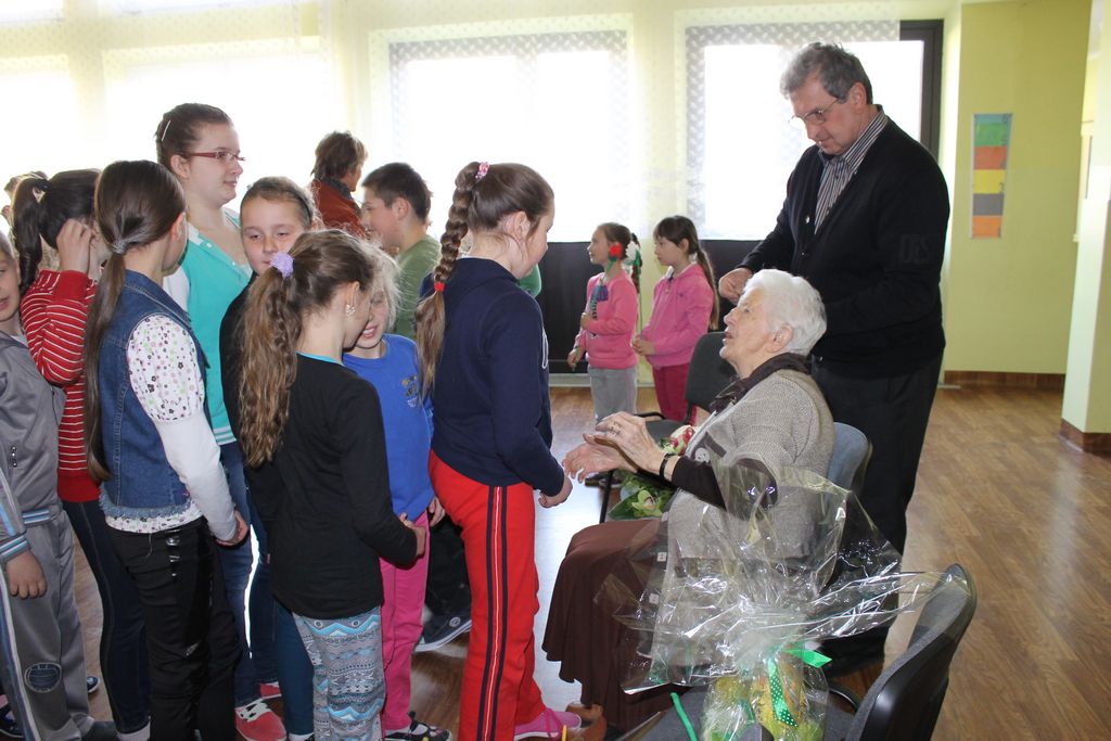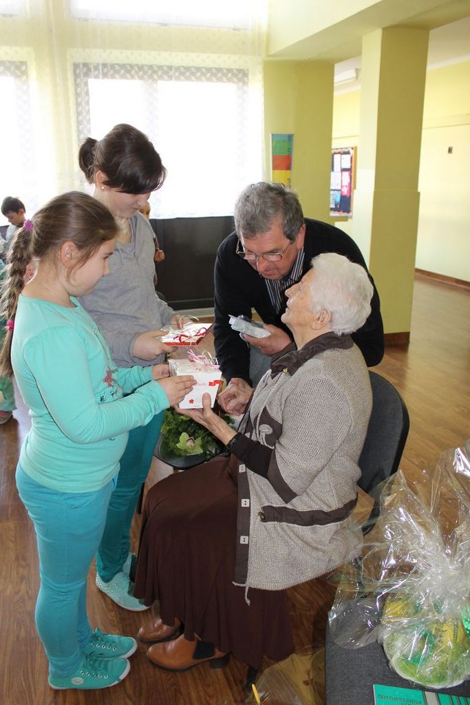 W następnej części spotkania wszyscy uczniowie chcieli osobiście przywitać się z babcią Stefanią, która wyściskała i wycałowała każdego z osobna. Dzieci wręczały jej kwiaty i własnoręcznie wykonane laurki. Uczniowie klasy szóstej podarowali jej zespołowe zdjęcie całej klasy, aby pamiętała o nich, gdy odejdą do gimnazjum. Uczniowie pierwszej klasy zaśpiewali brawurowo dwie piosenki, które wszystkim, a szczególnie gościom, bardzo się podobały. Również czwartoklasiści zaśpiewali piosenkę. Na koniec Emilka Zych z klasy piątej wyrecytowała wiersz Jana Brzechwy – „Kwoka”, za który otrzymała I miejsce w Konkursie Recytatorskim im. Marii Kozaczkowej.