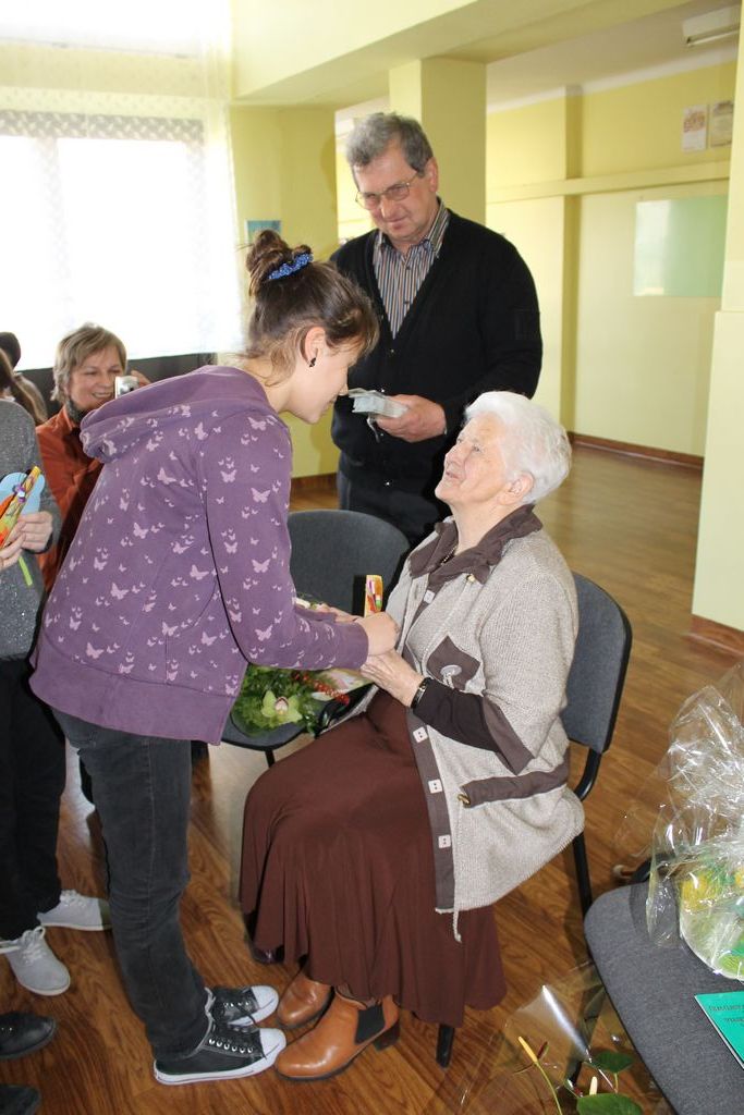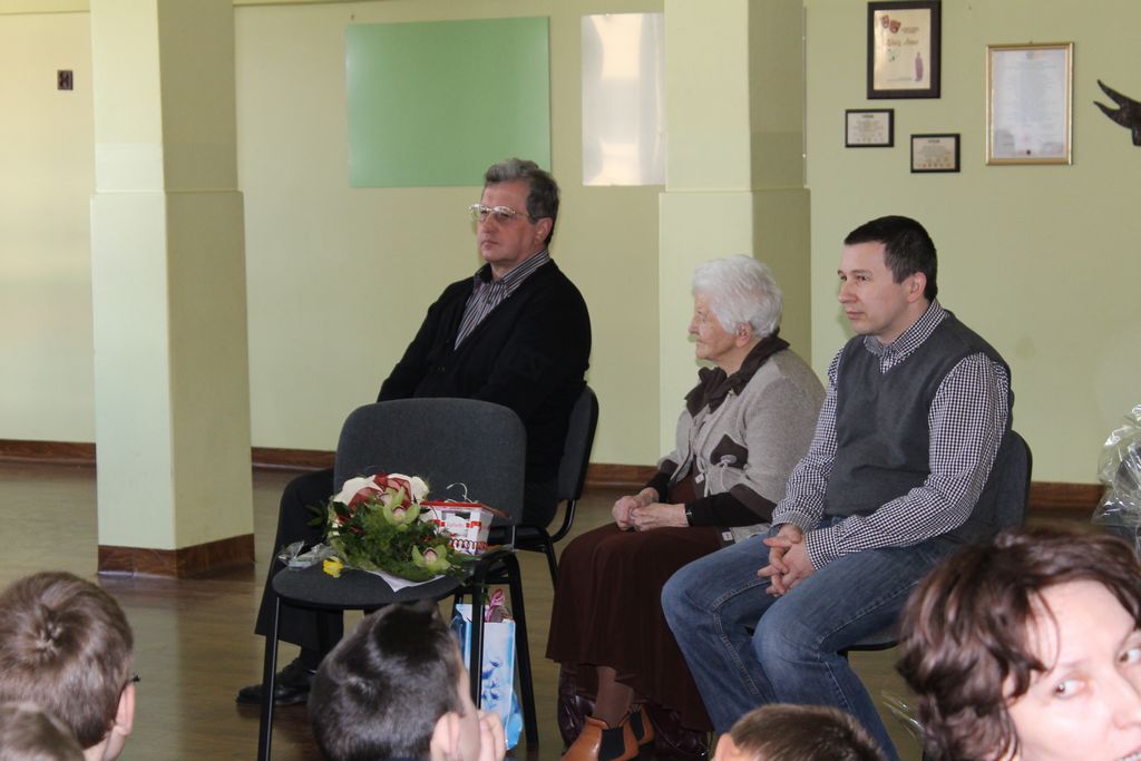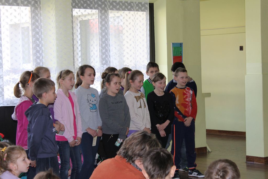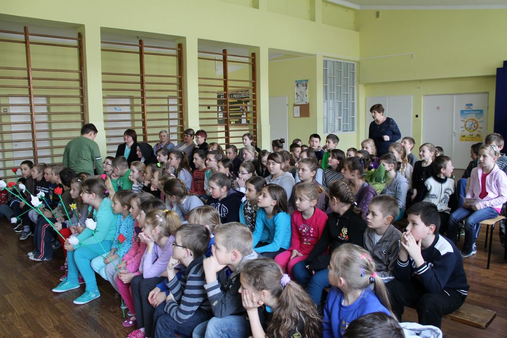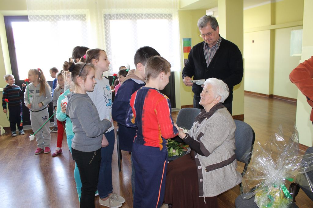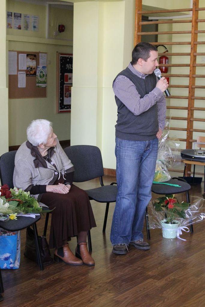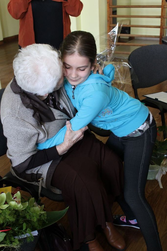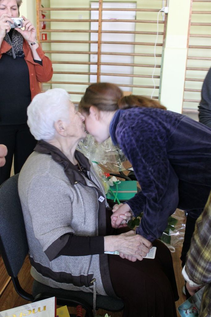 W następnej części spotkania wszyscy uczniowie chcieli osobiście przywitać się z babcią Stefanią, która wyściskała i wycałowała każdego z osobna. Dzieci wręczały jej kwiaty i własnoręcznie wykonane laurki. Uczniowie klasy szóstej podarowali jej zespołowe zdjęcie całej klasy, aby pamiętała o nich, gdy odejdą do gimnazjum. Uczniowie pierwszej klasy zaśpiewali brawurowo dwie piosenki, które wszystkim, a szczególnie gościom, bardzo się podobały. Również czwartoklasiści zaśpiewali piosenkę. Na koniec Emilka Zych z klasy piątej wyrecytowała wiersz Jana Brzechwy – „Kwoka”, za który otrzymała I miejsce w Konkursie Recytatorskim im. Marii Kozaczkowej.