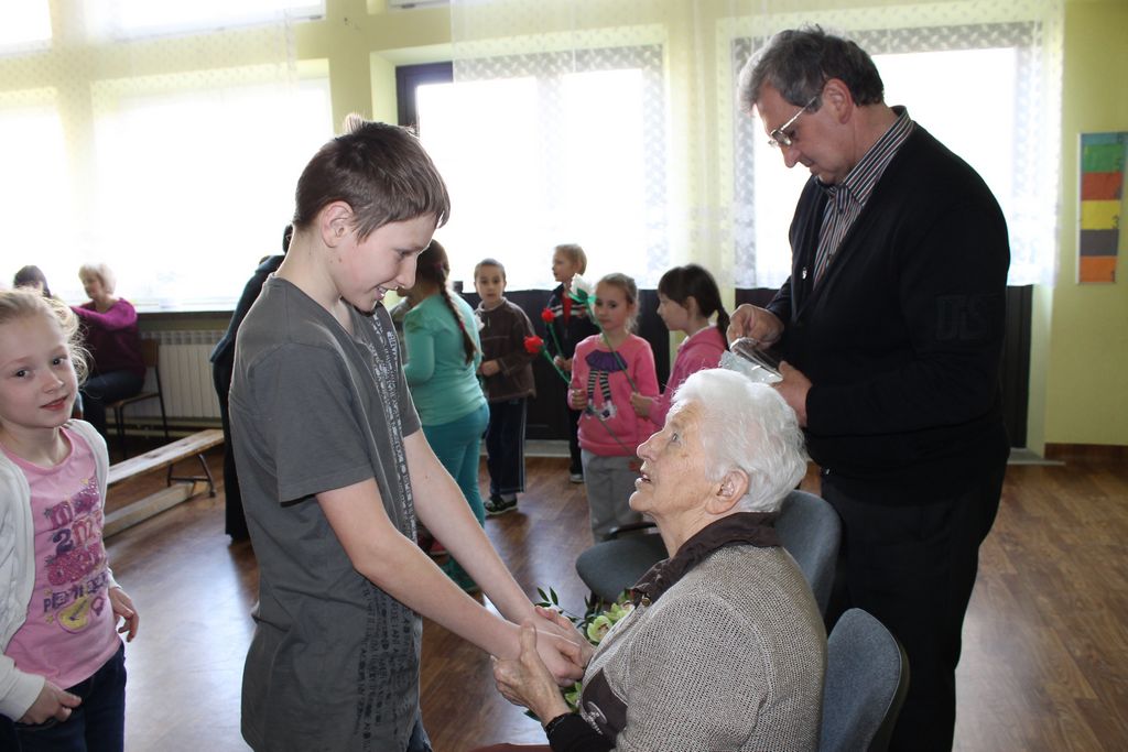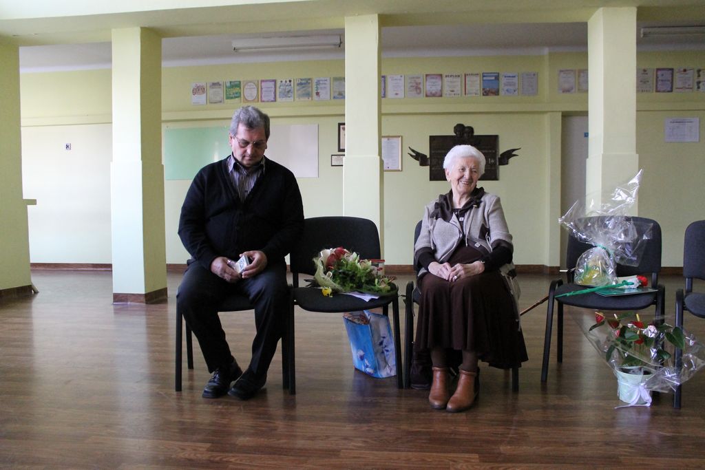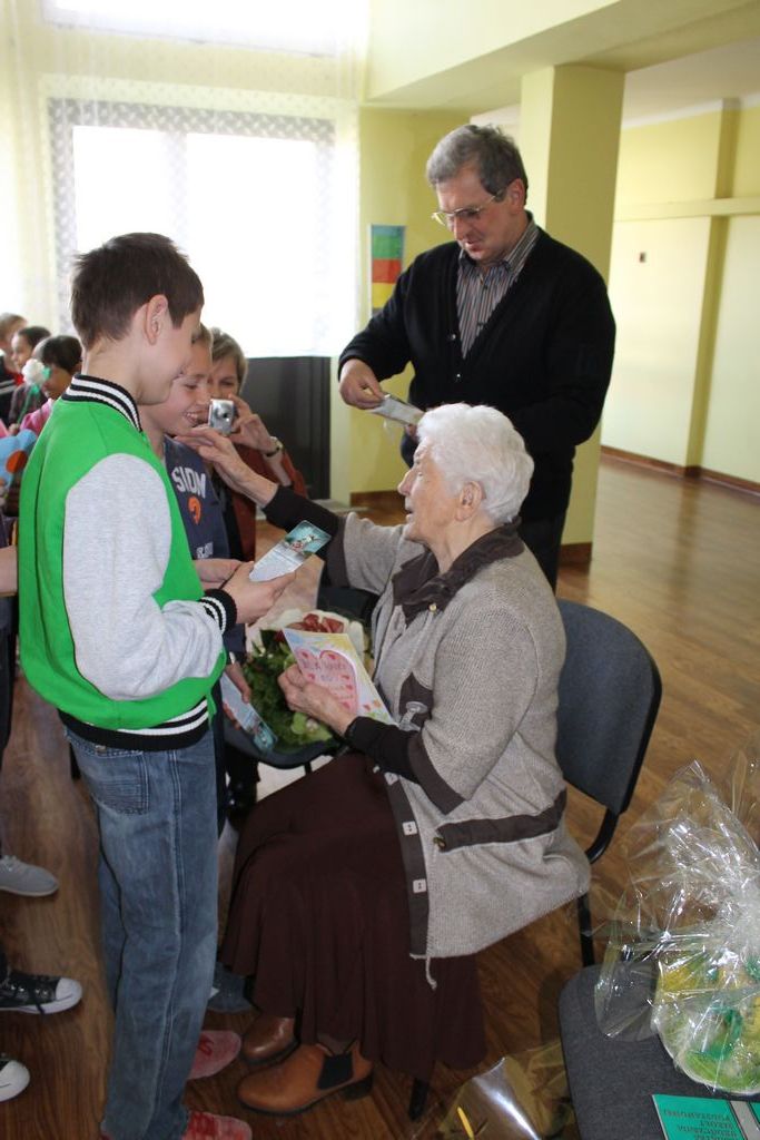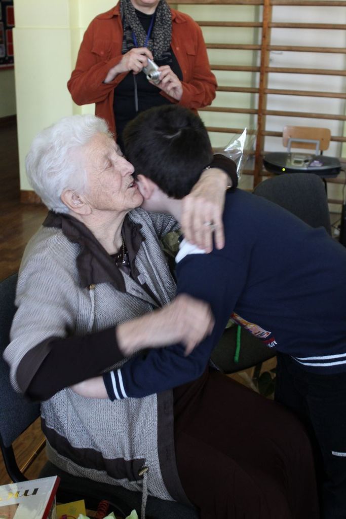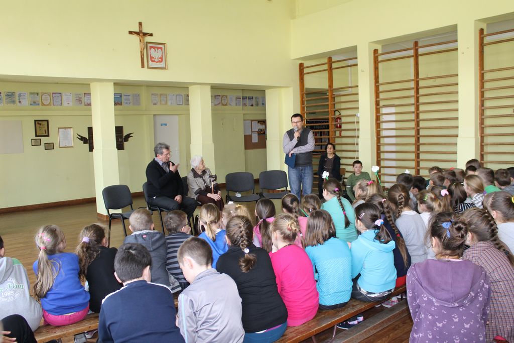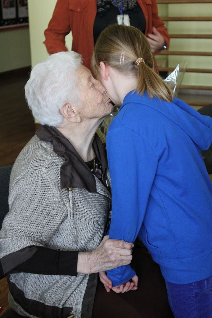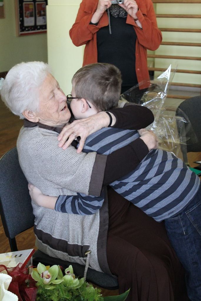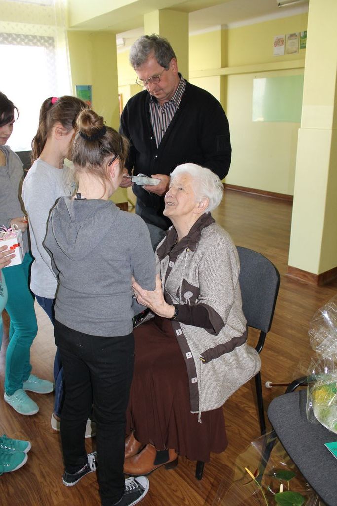 W następnej części spotkania wszyscy uczniowie chcieli osobiście przywitać się z babcią Stefanią, która wyściskała i wycałowała każdego z osobna. Dzieci wręczały jej kwiaty i własnoręcznie wykonane laurki. Uczniowie klasy szóstej podarowali jej zespołowe zdjęcie całej klasy, aby pamiętała o nich, gdy odejdą do gimnazjum. Uczniowie pierwszej klasy zaśpiewali brawurowo dwie piosenki, które wszystkim, a szczególnie gościom, bardzo się podobały. Również czwartoklasiści zaśpiewali piosenkę. Na koniec Emilka Zych z klasy piątej wyrecytowała wiersz Jana Brzechwy – „Kwoka”, za który otrzymała I miejsce w Konkursie Recytatorskim im. Marii Kozaczkowej.