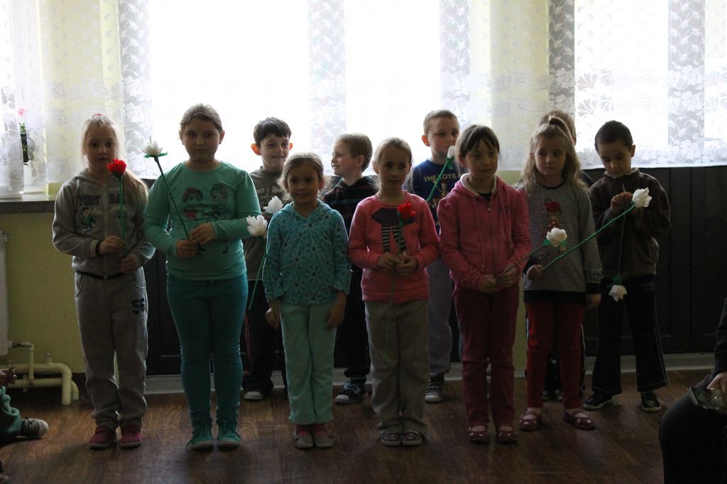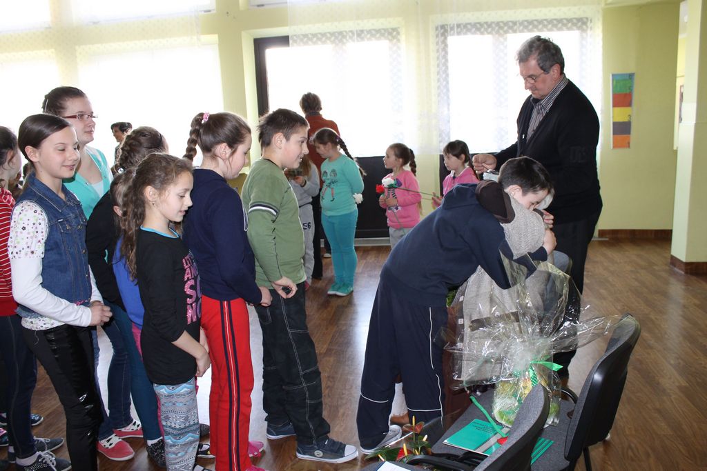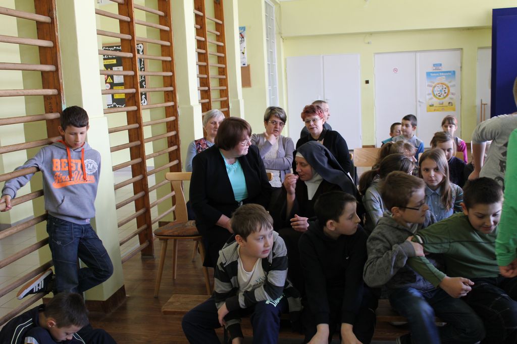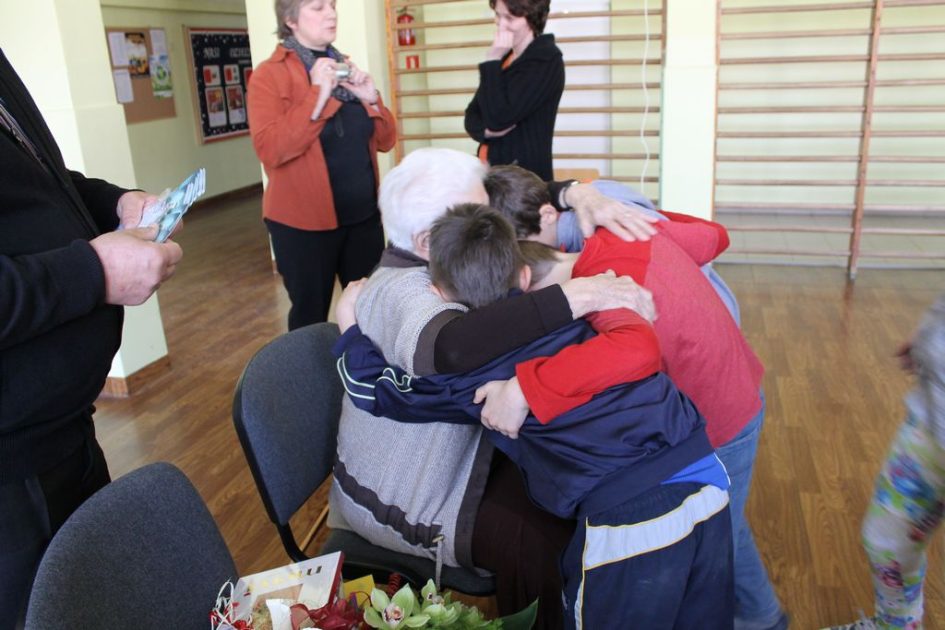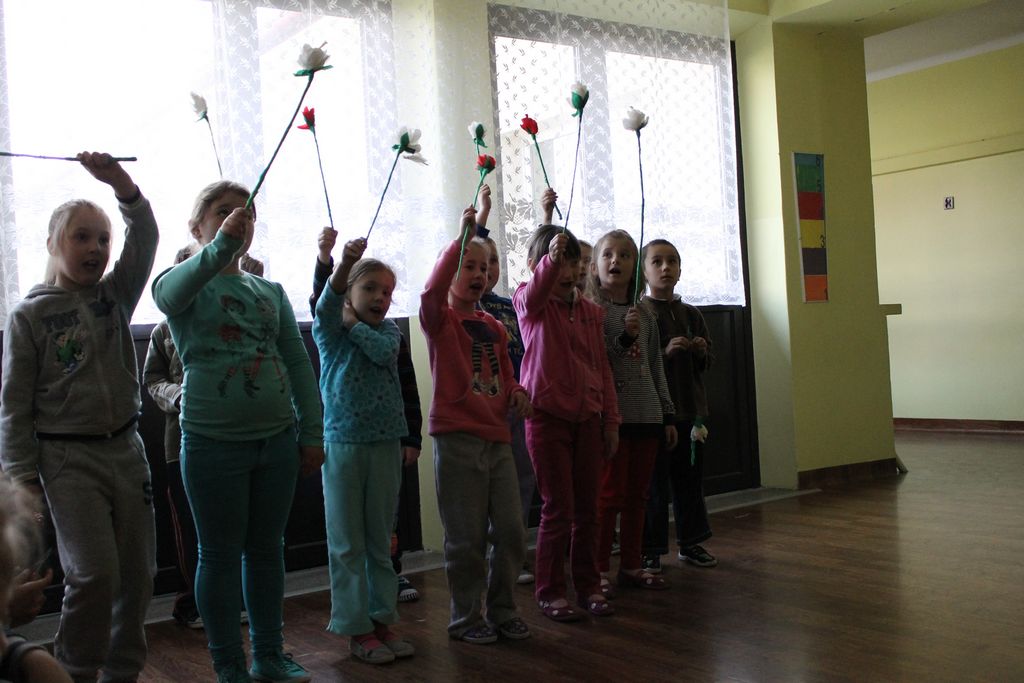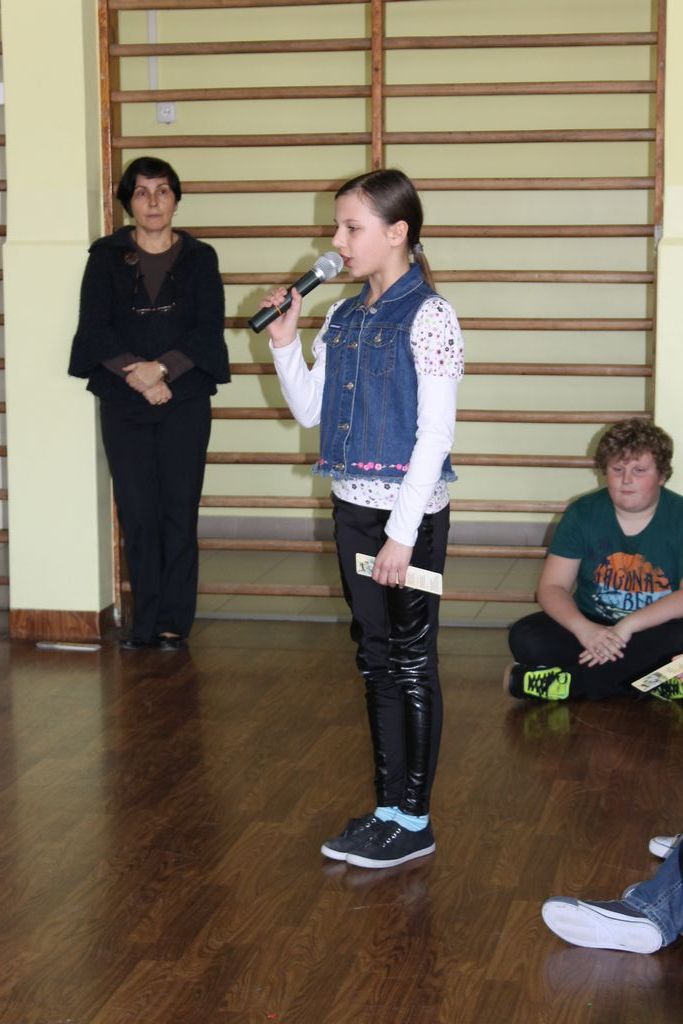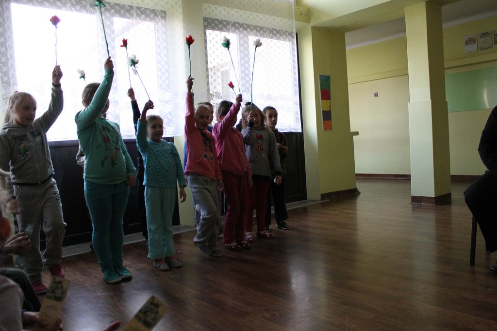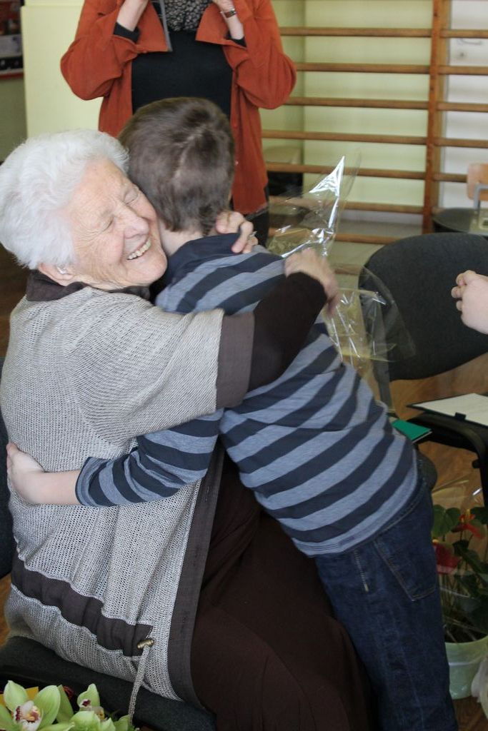 W następnej części spotkania wszyscy uczniowie chcieli osobiście przywitać się z babcią Stefanią, która wyściskała i wycałowała każdego z osobna. Dzieci wręczały jej kwiaty i własnoręcznie wykonane laurki. Uczniowie klasy szóstej podarowali jej zespołowe zdjęcie całej klasy, aby pamiętała o nich, gdy odejdą do gimnazjum. Uczniowie pierwszej klasy zaśpiewali brawurowo dwie piosenki, które wszystkim, a szczególnie gościom, bardzo się podobały. Również czwartoklasiści zaśpiewali piosenkę. Na koniec Emilka Zych z klasy piątej wyrecytowała wiersz Jana Brzechwy – „Kwoka”, za który otrzymała I miejsce w Konkursie Recytatorskim im. Marii Kozaczkowej.