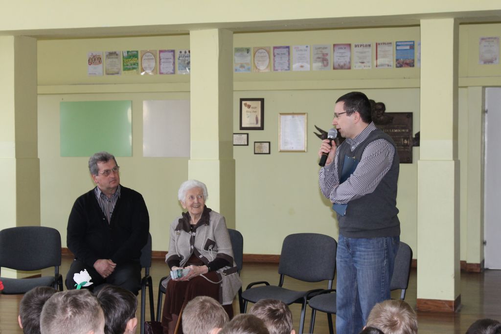 Następnie dyrektor szkoły poprosił Panią Stefanię, aby opowiedziała wszystkim o sobie, ponieważ wielu uczniów nie zna historii jej życia i działalności na rzecz innych. Jest ona jednak bardzo skromną osobą i powiedziała tylko kilka słów o swoim mężu Aleksandrze, ich wojennej tułaczce po wielu krajach Europy i ostatecznym osiedleniu się na kanadyjskiej ziemi. Mimo, że nie mieli własnych dzieci, potrafili okazać serce i pomoc dzieciom i młodzieży, fundując im stypendia naukowe, budując bibliotekę przy Uniwersytecie w Oshawie, przekazując cały swój majątek uniwersytetowi, a wreszcie okazując szczodrość wobec uczniów naszej szkoły. Pani Stefania Dulembowa jest dla nas wszystkich przykładem człowieka serdecznego, empatycznego i szczodrego. Potrafiła wraz ze swoim mężem podzielić się z innymi tym wszystkim, co z trudem i wysiłkiem zdobyli ciężką pracą.