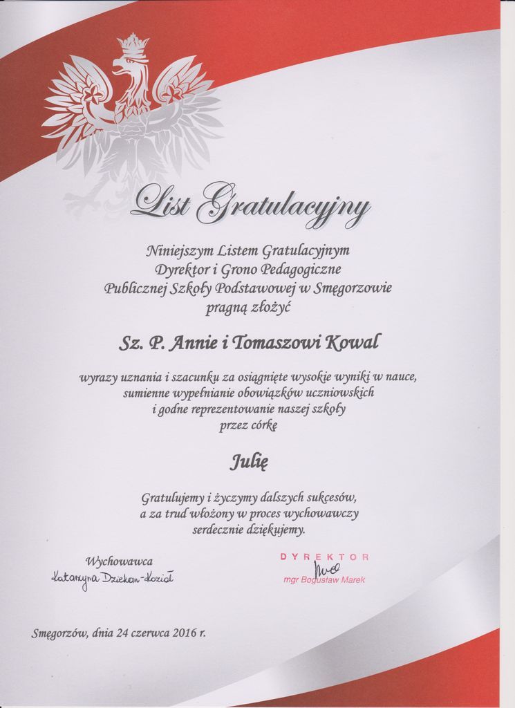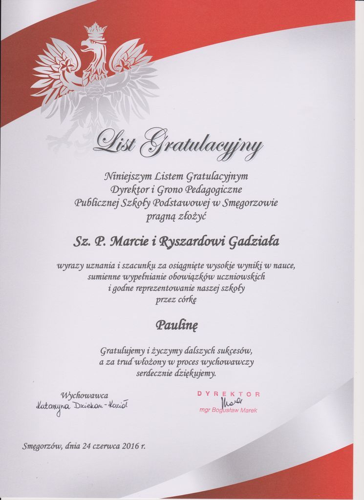 I rodzice tych trzech naszych uczennic – Pauliny Gadziały, Julii Kowal i Moniki Ryczek – zostali wyróżnieni listami gratulacyjnymi. A dziewczęta – pamiątkowymi „sowami”.