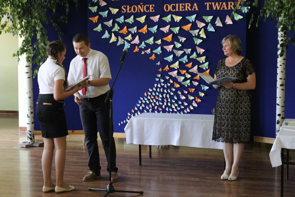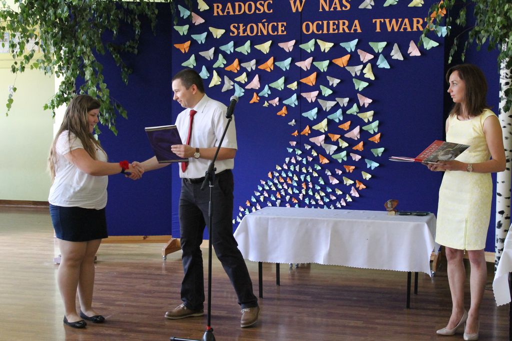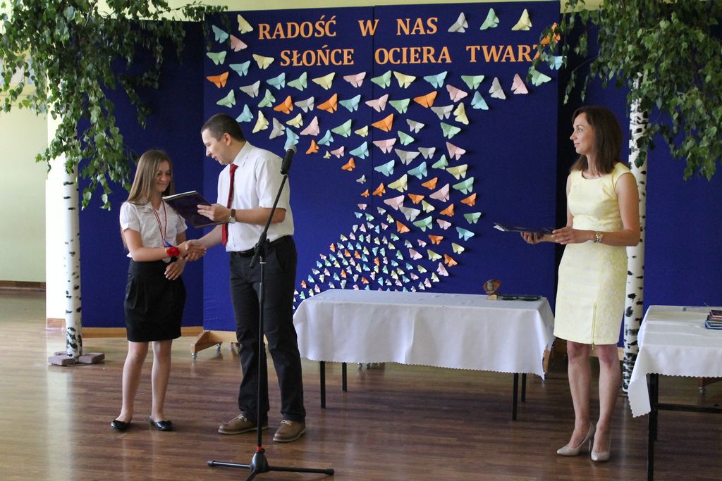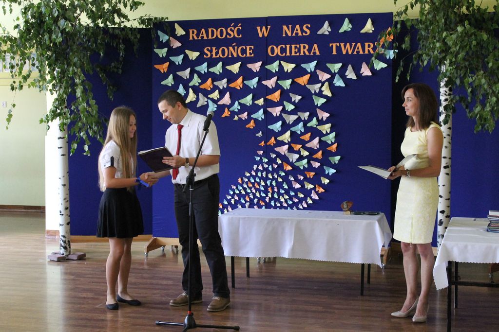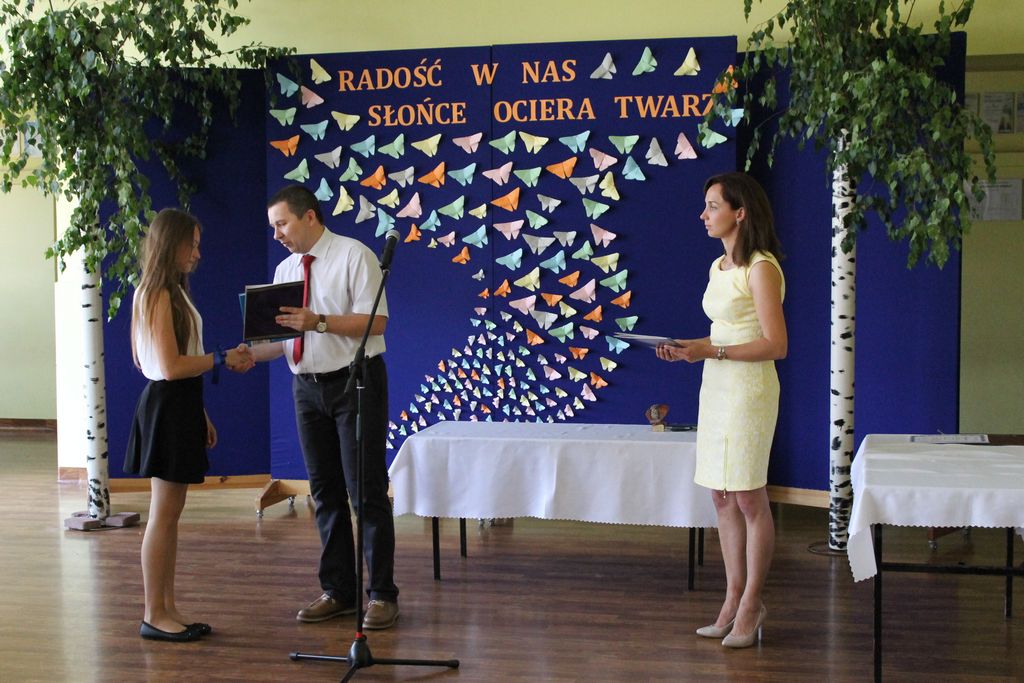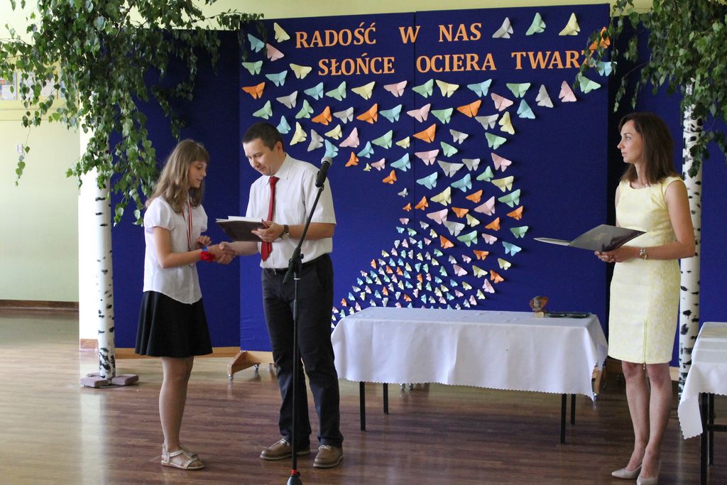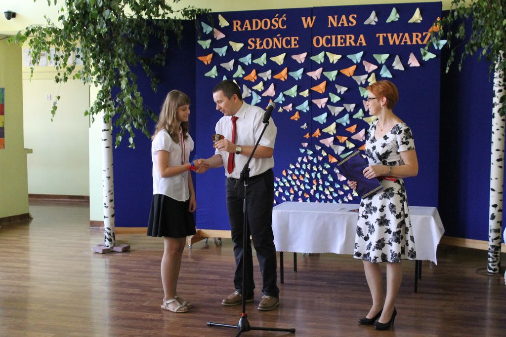 Najwyższe trofeum przypadło jednakże najlepszym absolwentom (absolwentkom). Nasza finalistka Małopolskiego Konkursu Humanistycznego – Paulina Gadziała – otrzymała stypendium Burmistrza Dąbrowy Tarnowskiej dla uzdolnionych uczniów za wybitne osiągnięcia naukowe w roku szkolnym 2015/2016”. Natomiast nasze najlepsze uczennice, z najwyższą średnią ocen (taką samą) – Julka Kowal i Monika Ryczek – otrzymały od Burmistrza Dąbrowy Tarnowskiej statuetki dla najlepszych uczniów w szkole.