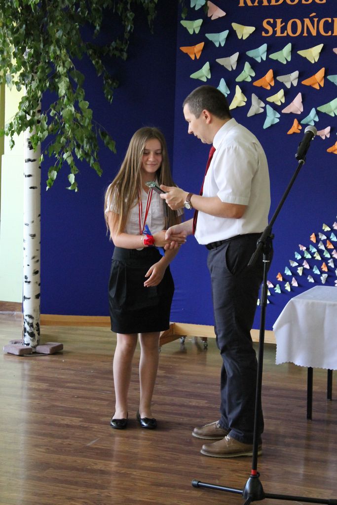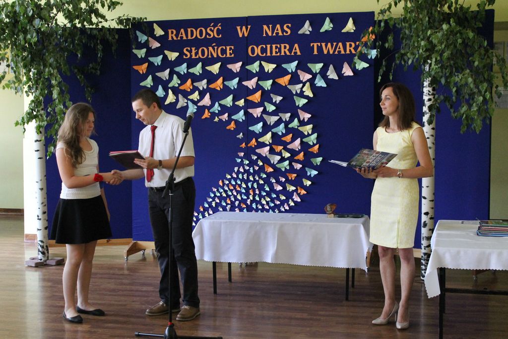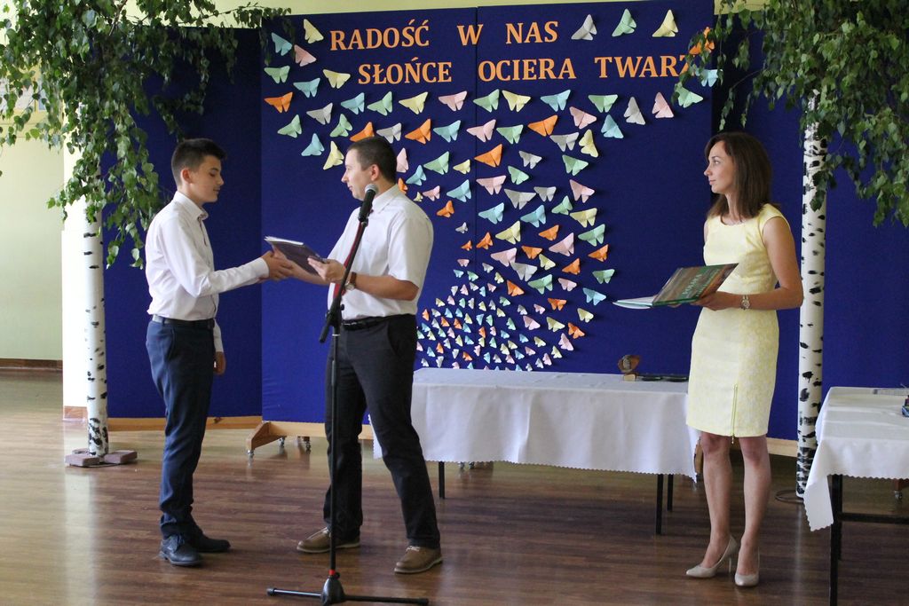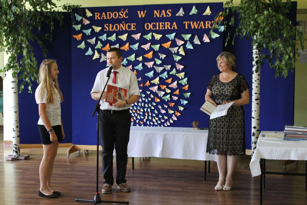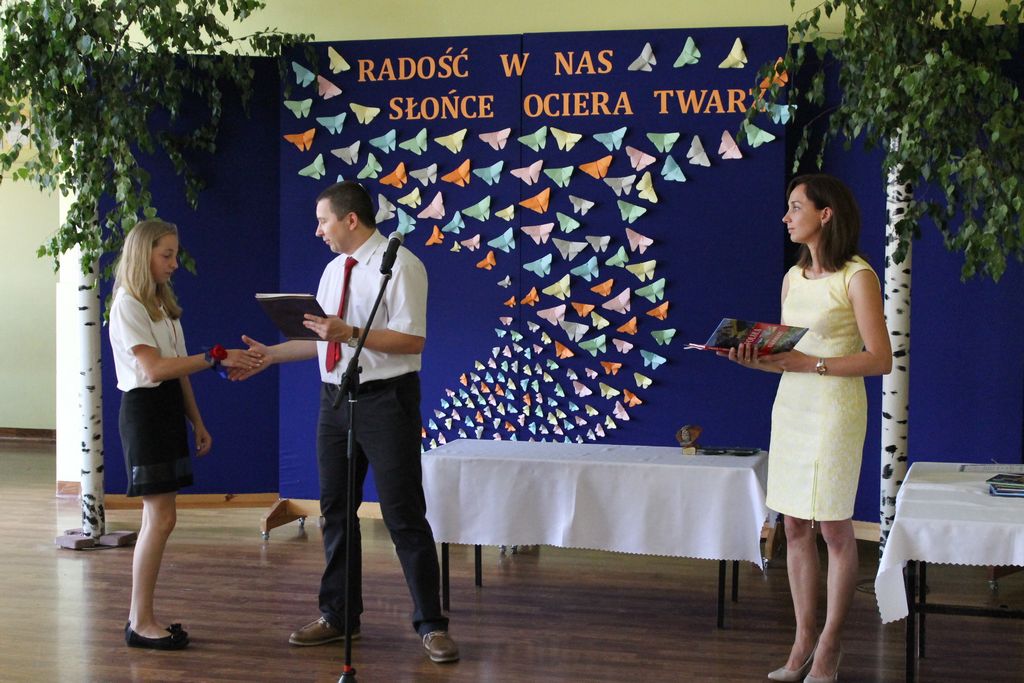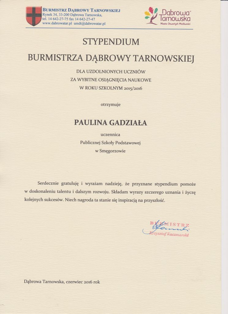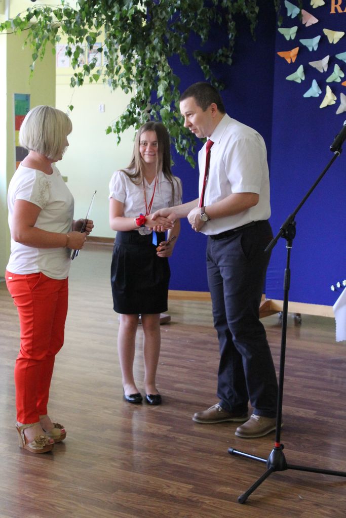 Najwyższe trofeum przypadło jednakże najlepszym absolwentom (absolwentkom). Nasza finalistka Małopolskiego Konkursu Humanistycznego – Paulina Gadziała – otrzymała stypendium Burmistrza Dąbrowy Tarnowskiej dla uzdolnionych uczniów za wybitne osiągnięcia naukowe w roku szkolnym 2015/2016”. Natomiast nasze najlepsze uczennice, z najwyższą średnią ocen (taką samą) – Julka Kowal i Monika Ryczek – otrzymały od Burmistrza Dąbrowy Tarnowskiej statuetki dla najlepszych uczniów w szkole.