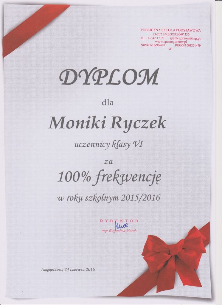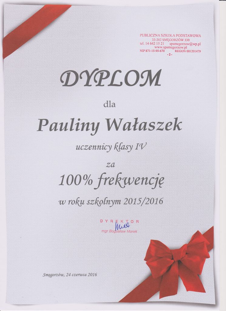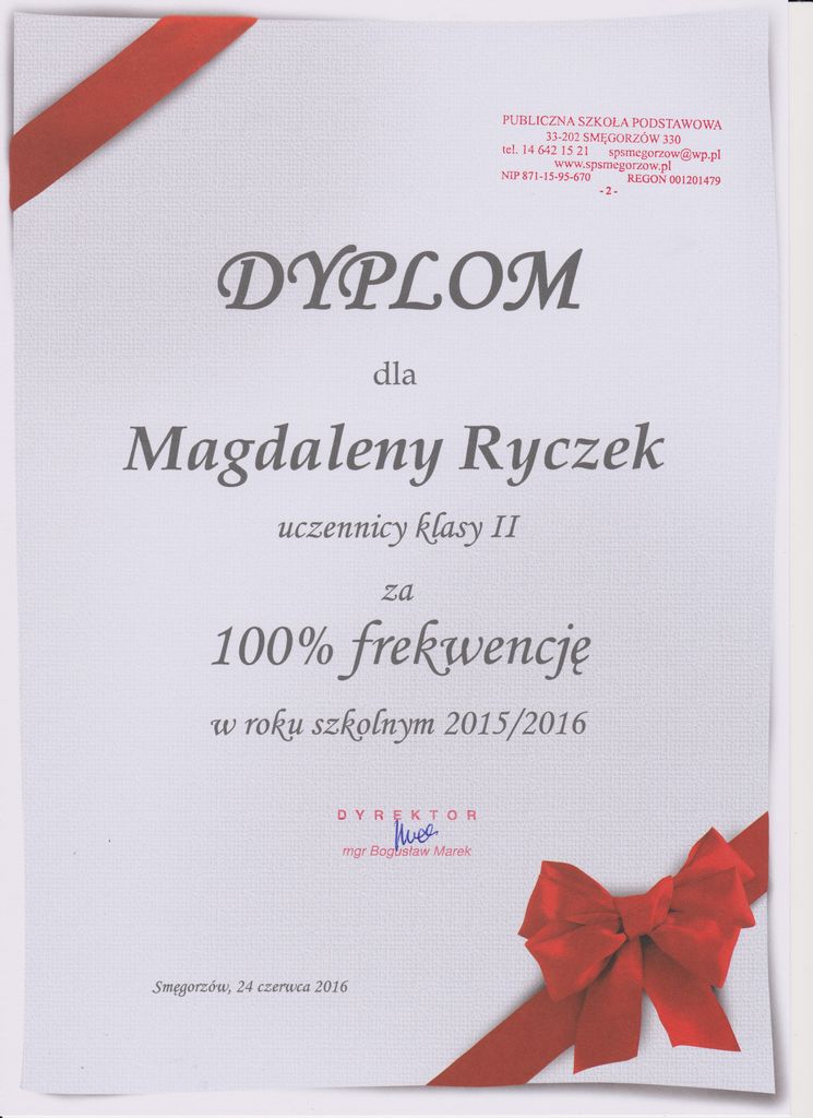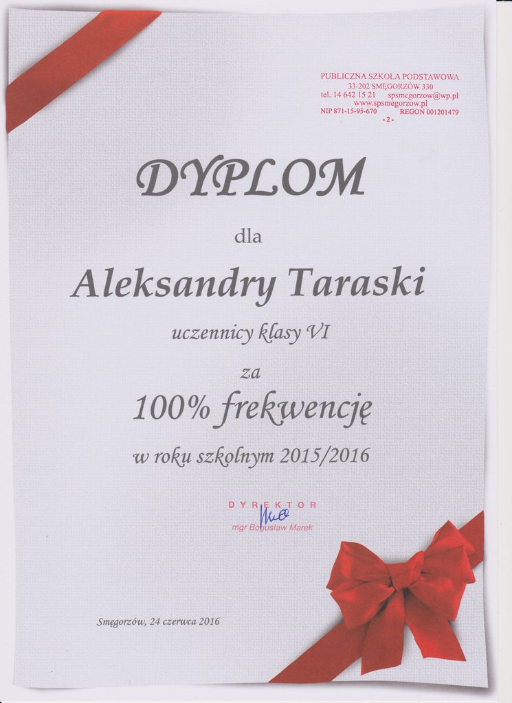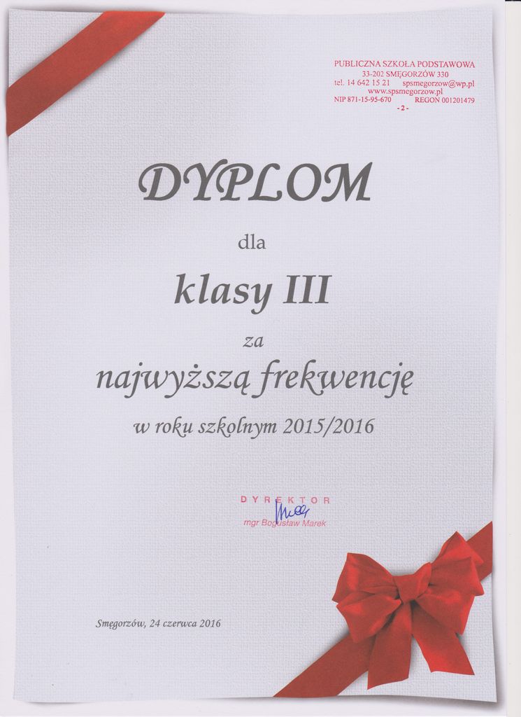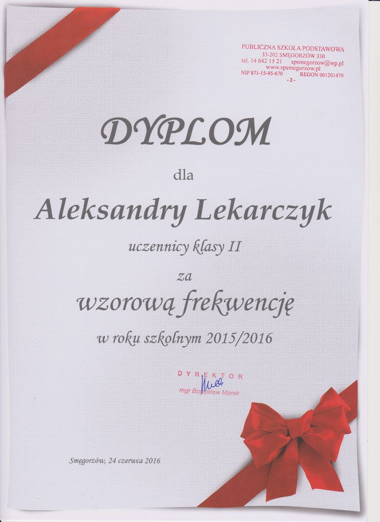 Dyrektor szkoły wręczył również dyplomy za wzorową frekwencję. Takie wyróżnienie otrzymali: