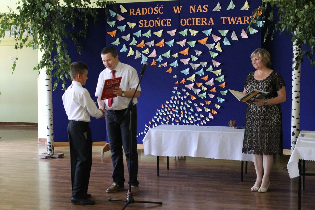 Po części artystycznej przystąpiono do wręczania świadectw, nagród, itd… Rozpoczęło się od podsumowania Konkursu Plastycznego „BOHATER KSIĄŻKI KORNELA MAKUSZYŃSKIEGO”, które zostanie opisane w osobnym artykule.