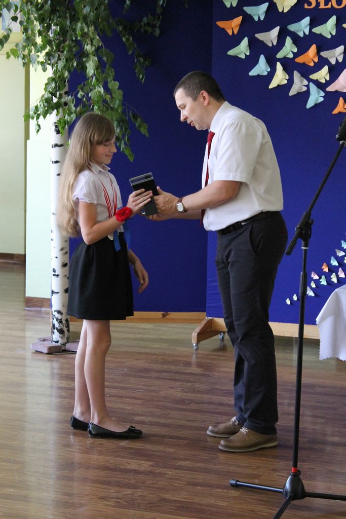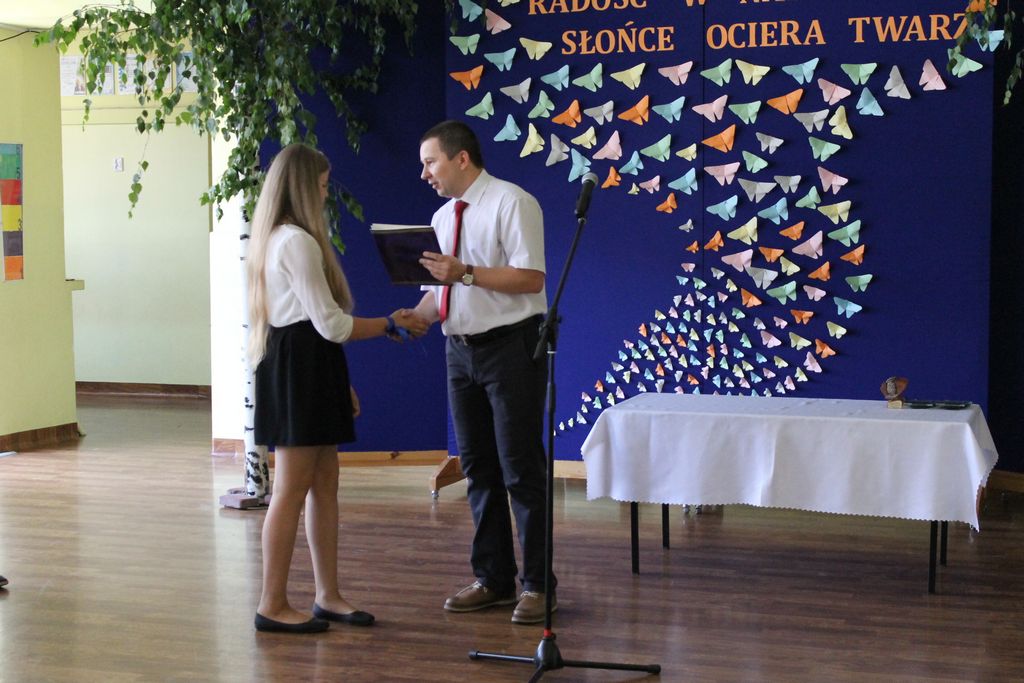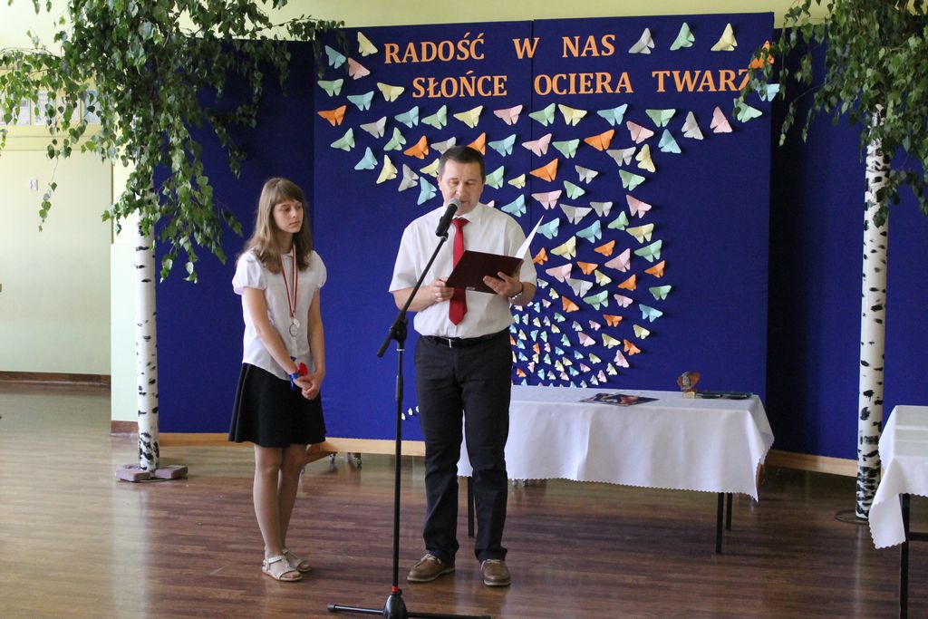 Dyrektor poinformował również, że na zasłużoną emeryturę odeszła długoletnia nauczycielka p. Czesława Obara, która ze względów osobistych nie mogła uczestniczyć w uroczystości. W imieniu całej społeczności p. Dyrektor wyraził wdzięczność za jej pełną poświęcenia pracę. Wspomniał też o jej wielkim zaangażowaniu w przygotowywanie uczniów do konkursów BRD i „Odblaskowa szkoła”.