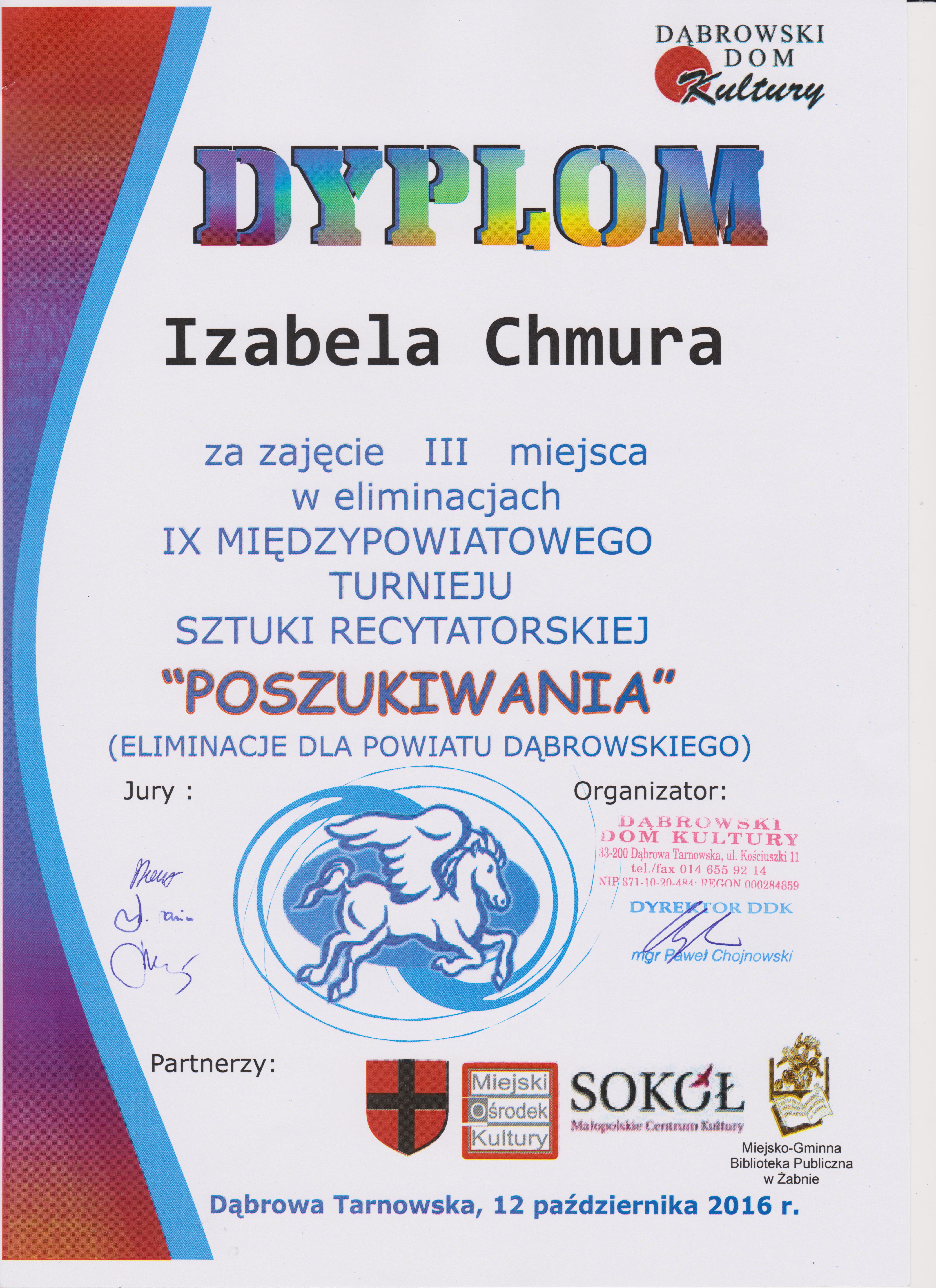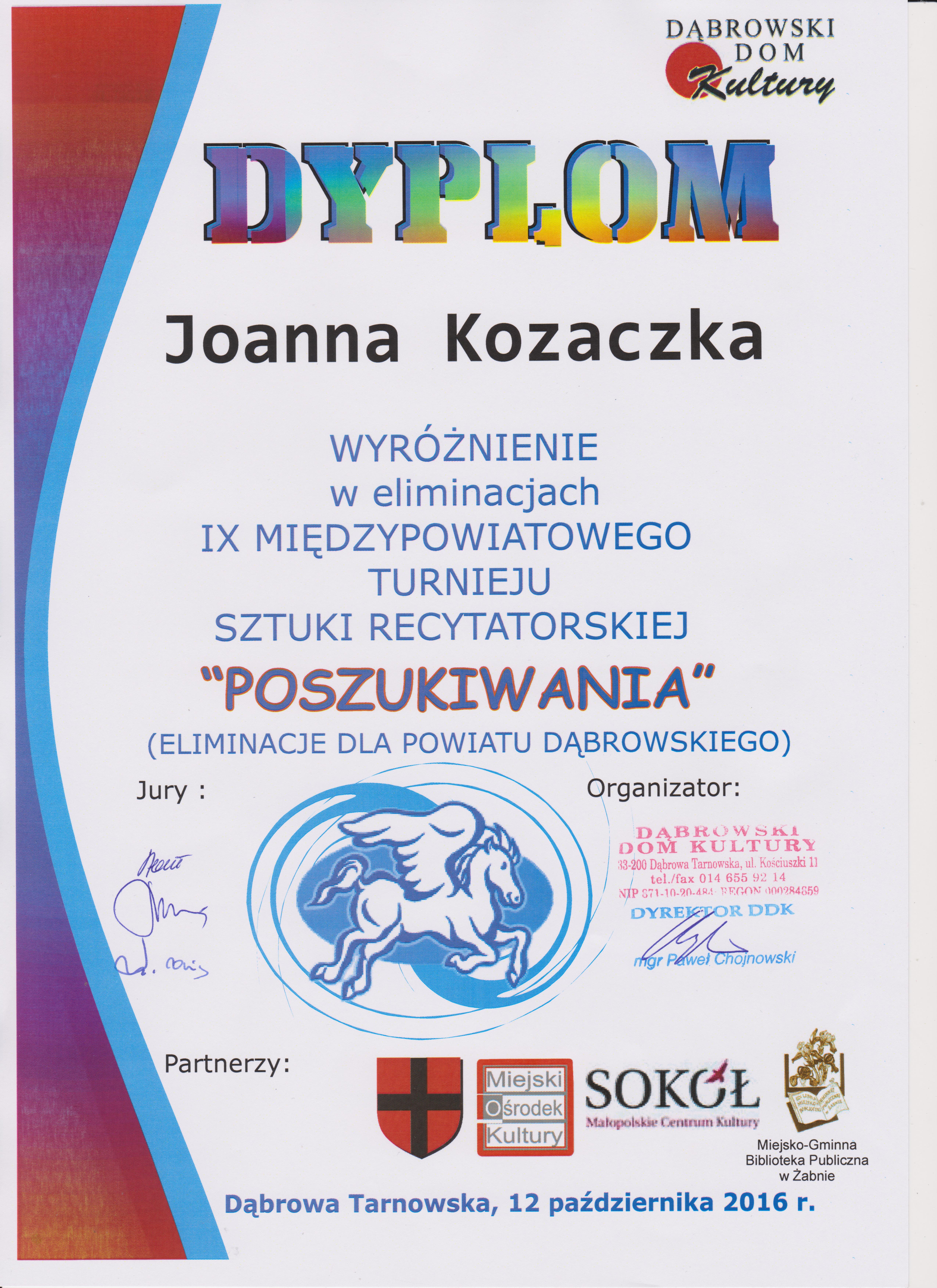 12 października br. w Dąbrowskim Domu Kultury odbyły się eliminacje IX Międzypowiatowego Turnieju Sztuki Recytatorskiej „POSZUKIWANIA”. Jest to jeden z ważniejszych konkursów, w którym zmagają się najlepsi recytatorzy powiatów: brzeskiego, żabieńskiego i dąbrowskiego. Jego organizatorami są: DDK, Małopolskie Centrum Kultury „Sokół” w Nowym Sączu, Miejsko-Gminna Biblioteka Publiczna w Żabnie oraz Miejski Ośrodek Kultury w Brzesku.