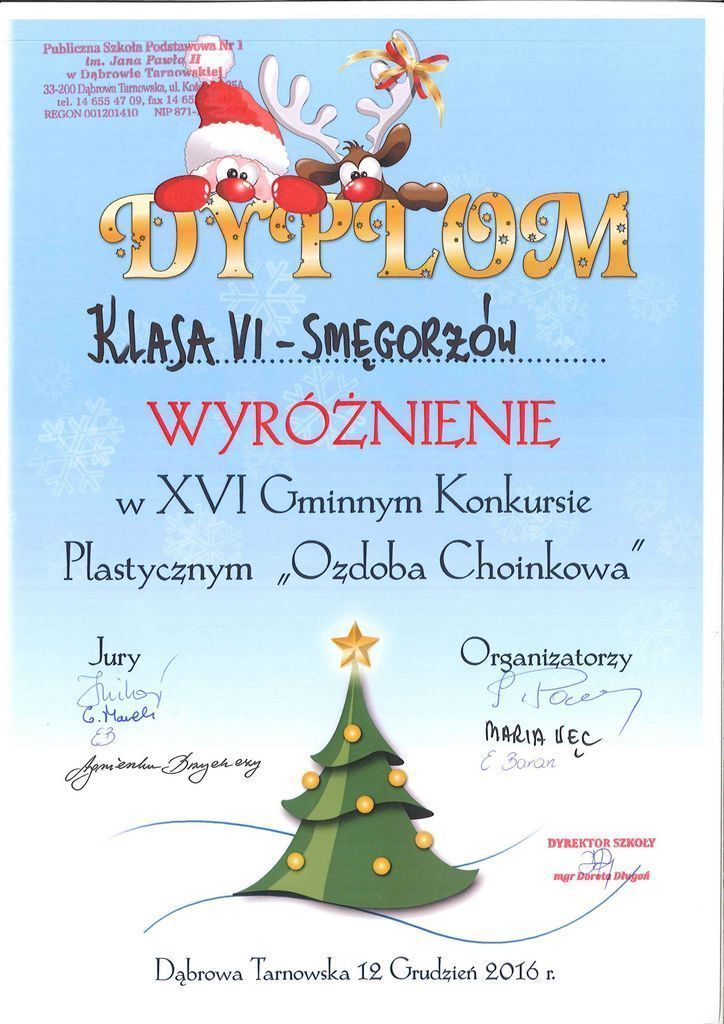 12 XII o godz. 13 w Szkole Podstawowej nr 1 im. Jana Pawła II w Dąbrowie Tarnowskiej ogłoszone zostały wyniki XVI Międzyszkolnego Konkursu Plastycznego „Ozdoba Choinkowa”. Nasza szkoła zdobyła dużą część nagród i wyróżnień. A konkurencja była bardzo duża – na konkurs wpłynęło 1650 prac w 7 kategoriach.