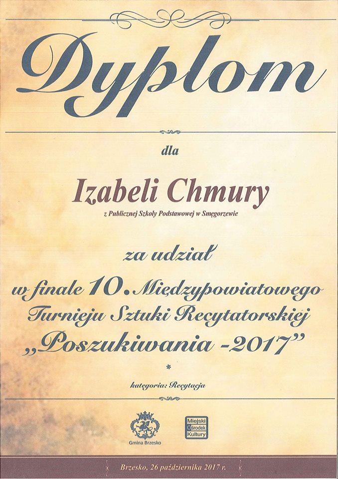 26 października uczennica naszej szkoły Izabela Chmura wzięła udział w finale 10. Międzypowiatowego Turnieju Sztuki Recytatorskiej „Poszukiwania 2017”.