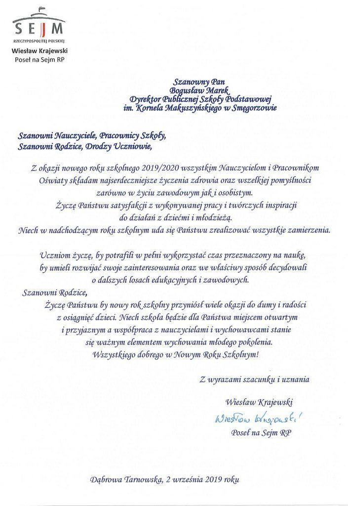Po odśpiewaniu hymnu, Dyrektor odczytał listy skierowane do całej społeczności szkolnej przez Posła na Sejm RP – p. Wiesława Krajewskiego oraz przez Burmistrza Dąbrowy Tarnowskiej – p. Krzysztofa Kaczmarskiego.