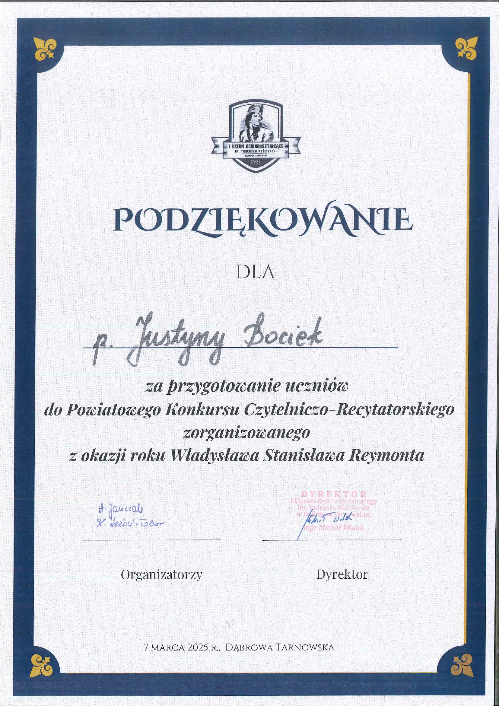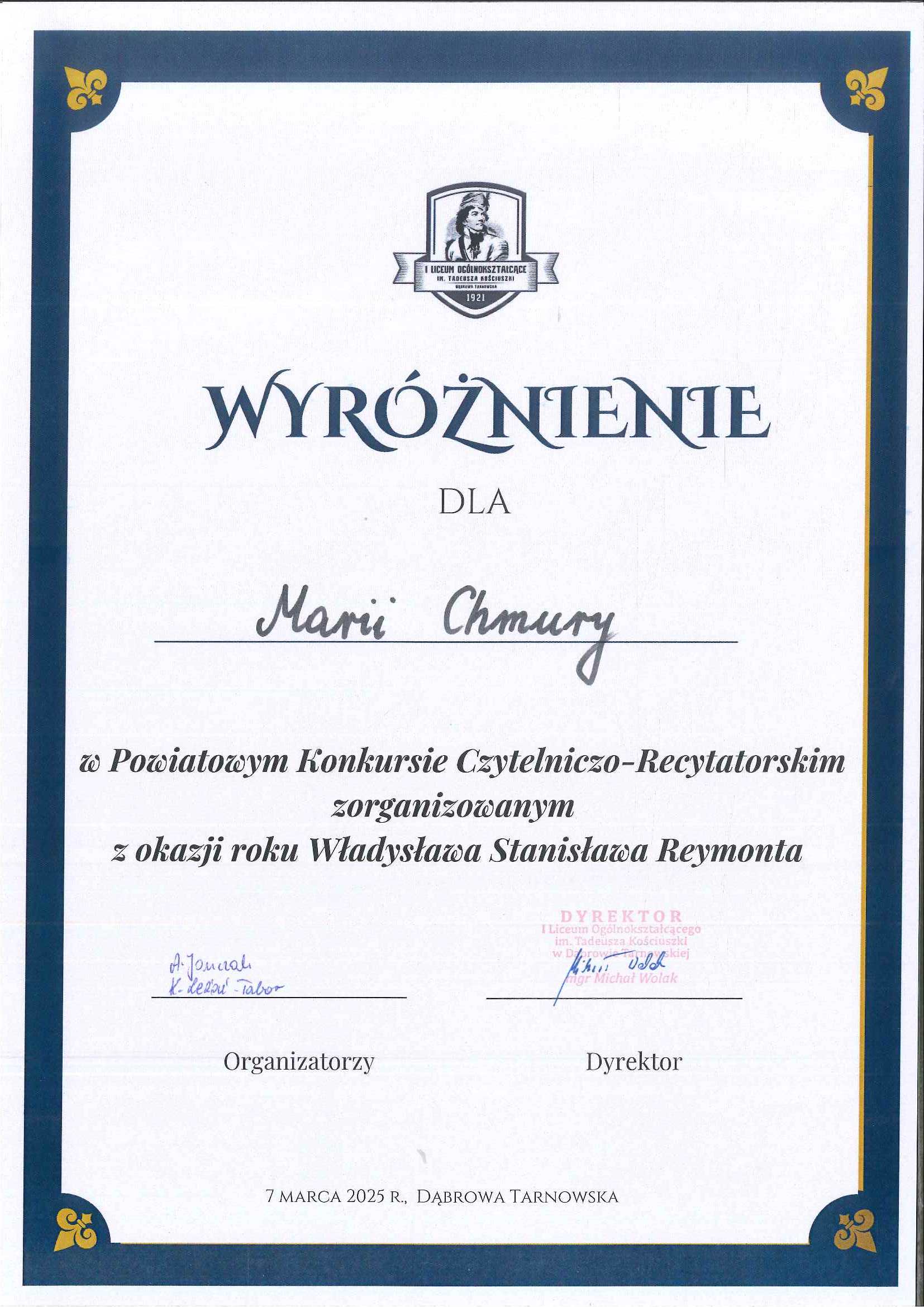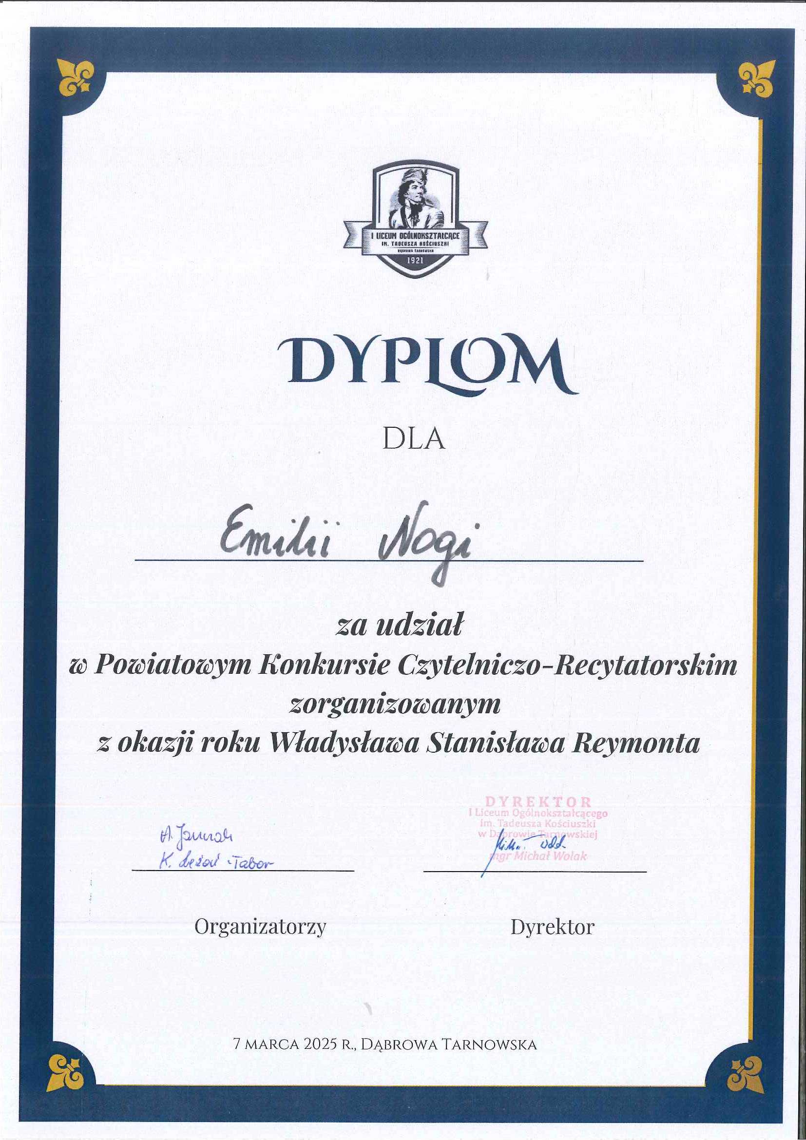 7 marca w I Liceum Ogólnokształcącym im. T. Kościuszki w Dąbrowie Tarnowskiej odbył się Powiatowy Konkurs Czytelniczo-Recytatorski zorganizowany z okazji roku Władysława Stanisława Reymonta. W rywalizacji wzięły udział dwie uczennice klasy VI – Emilia Noga i Maria Chmura.