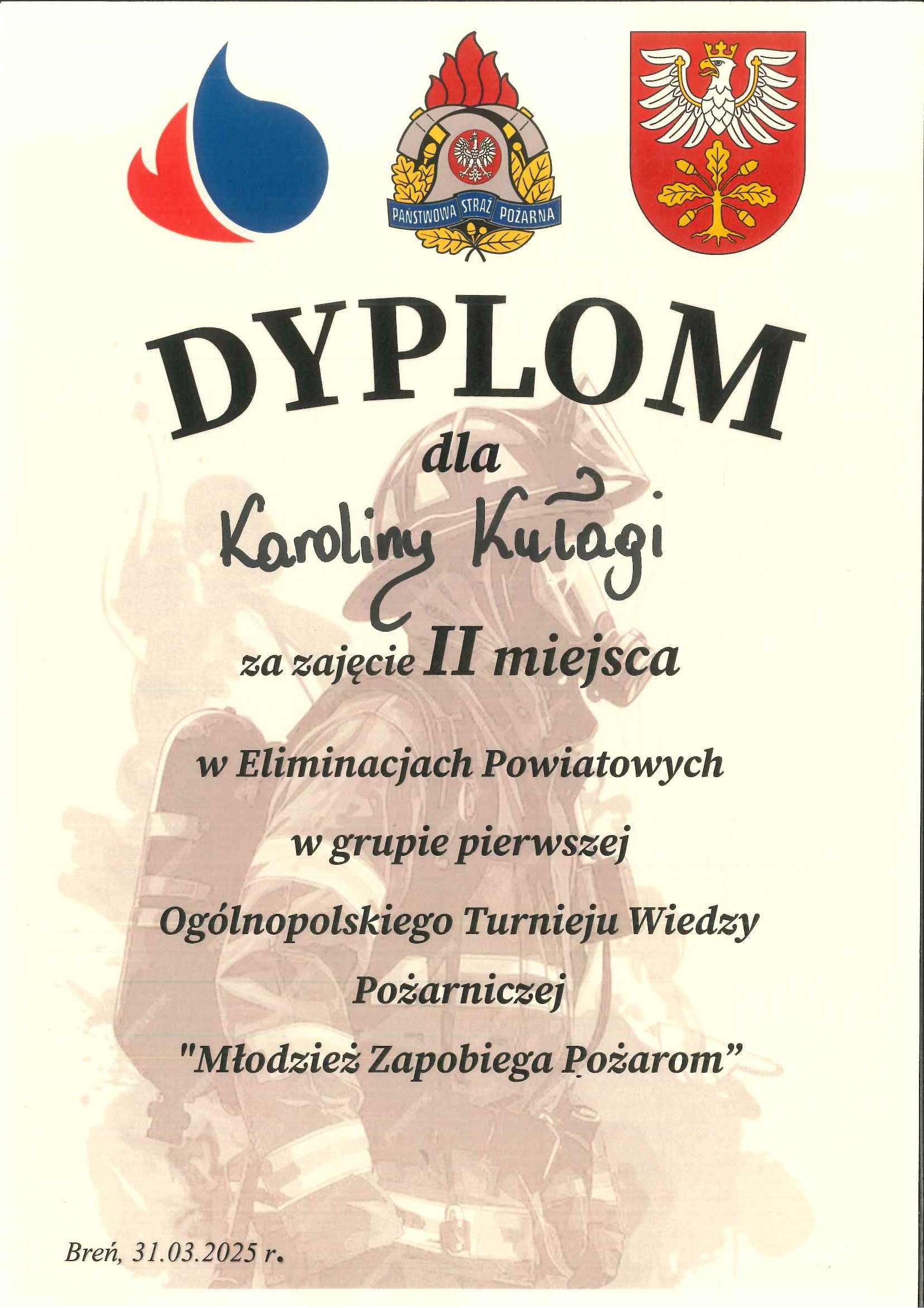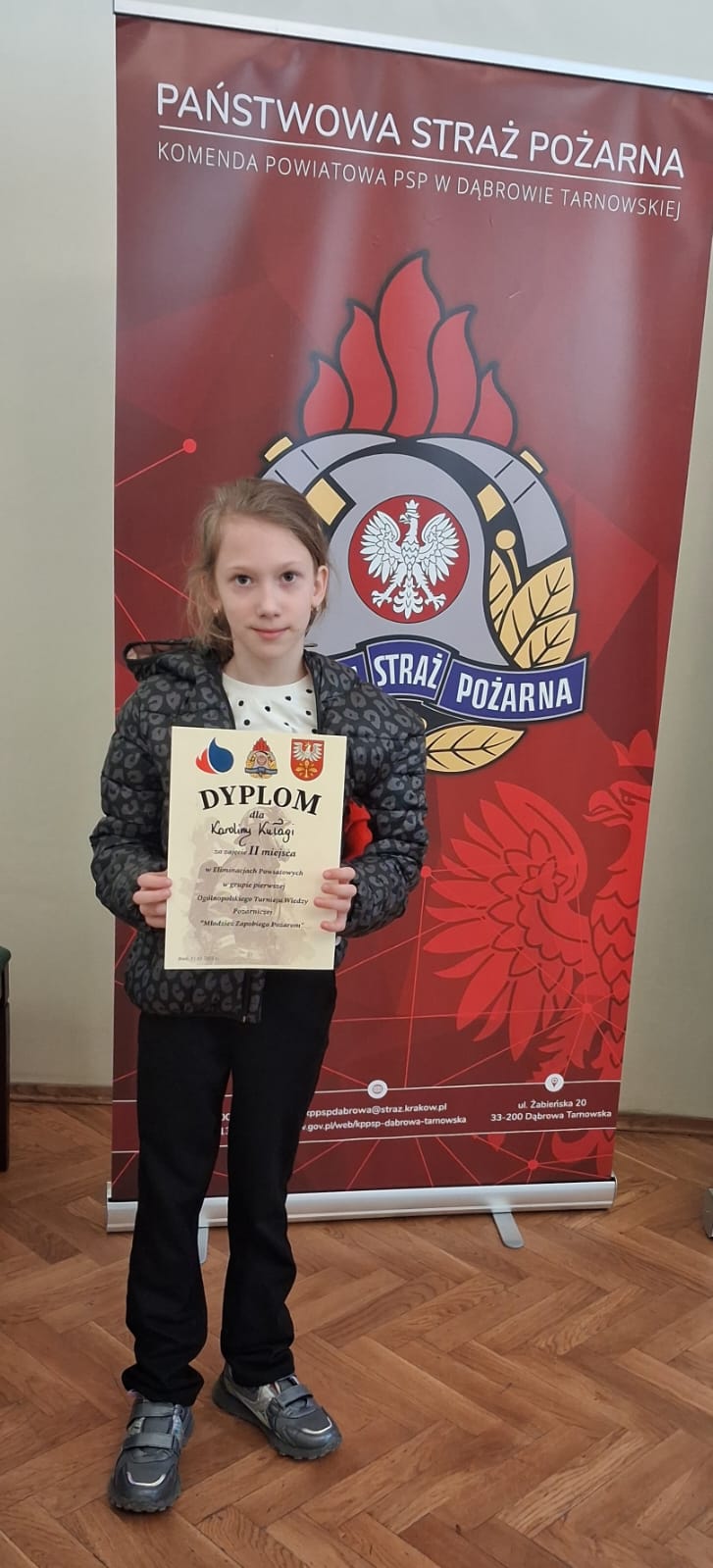 Z ogromną dumą informujemy, że nasza uczennica Karolina Kułaga zajęła 2. miejsce w powiatowych eliminacjach Ogólnopolskiego Turnieju Wiedzy Pożarniczej (OTWP)! Dzięki swojemu zaangażowaniu i wiedzy będzie reprezentować powiat dąbrowski na etapie wojewódzkim!