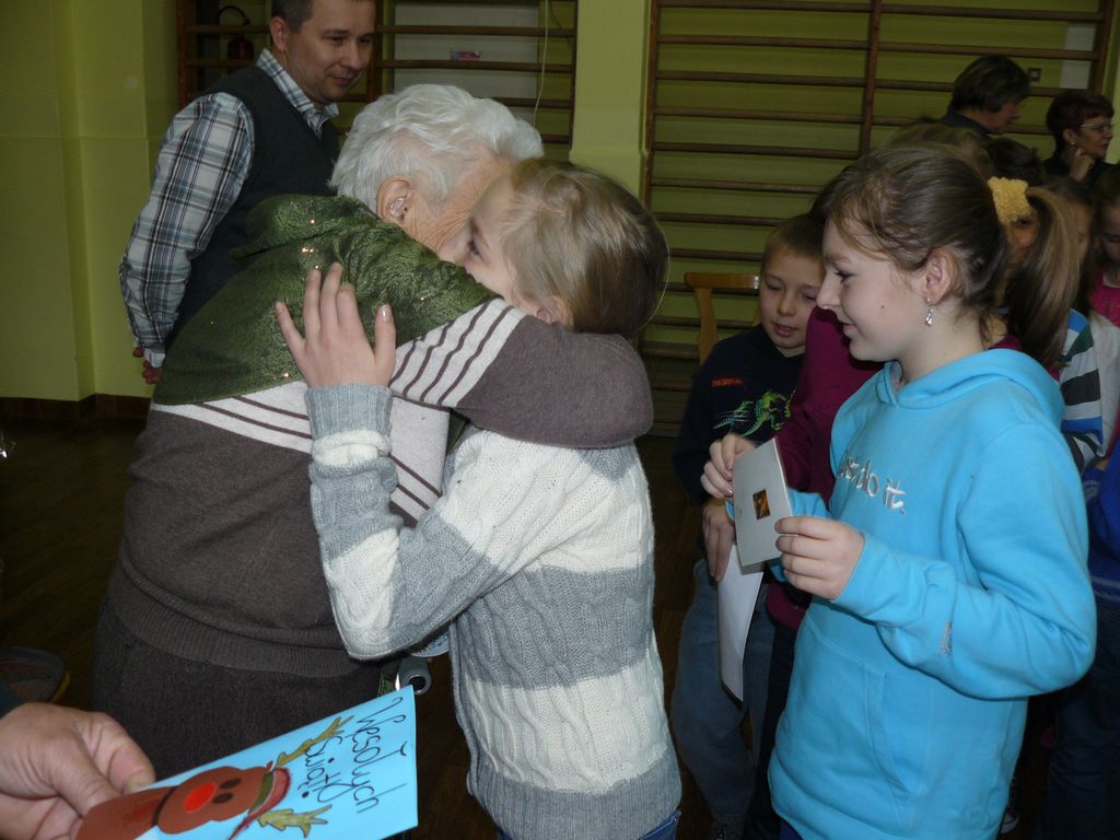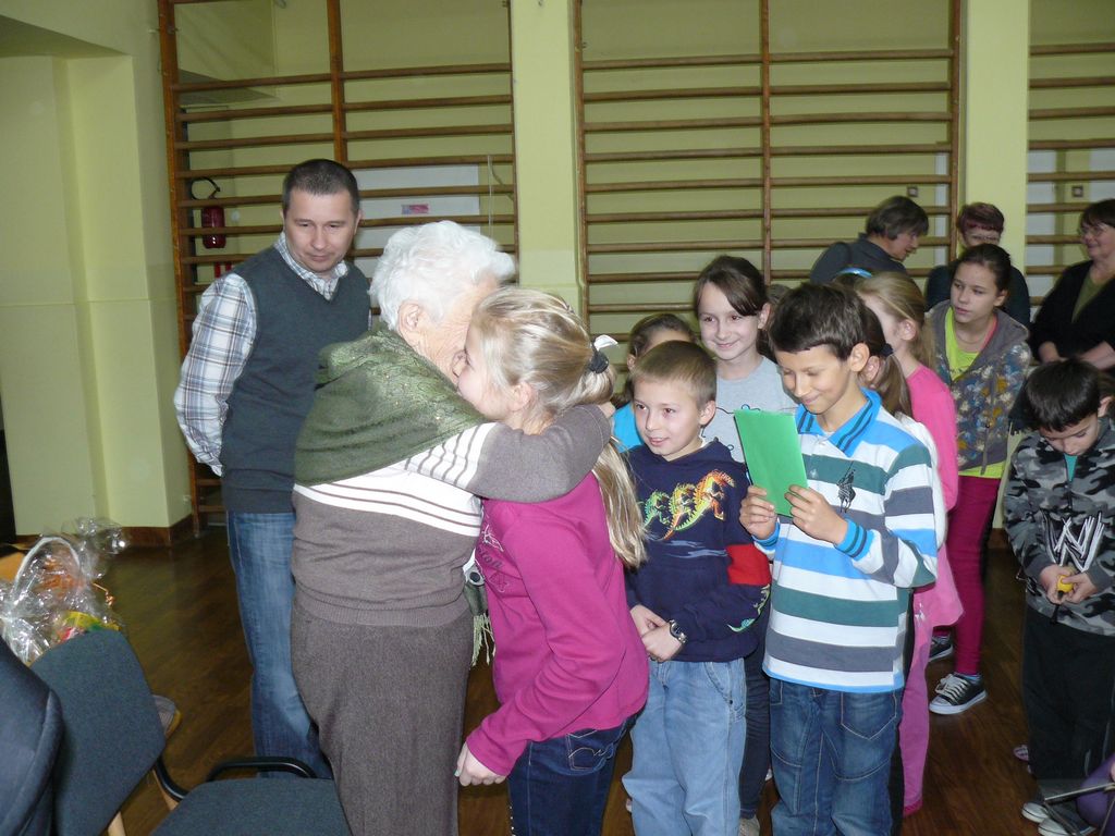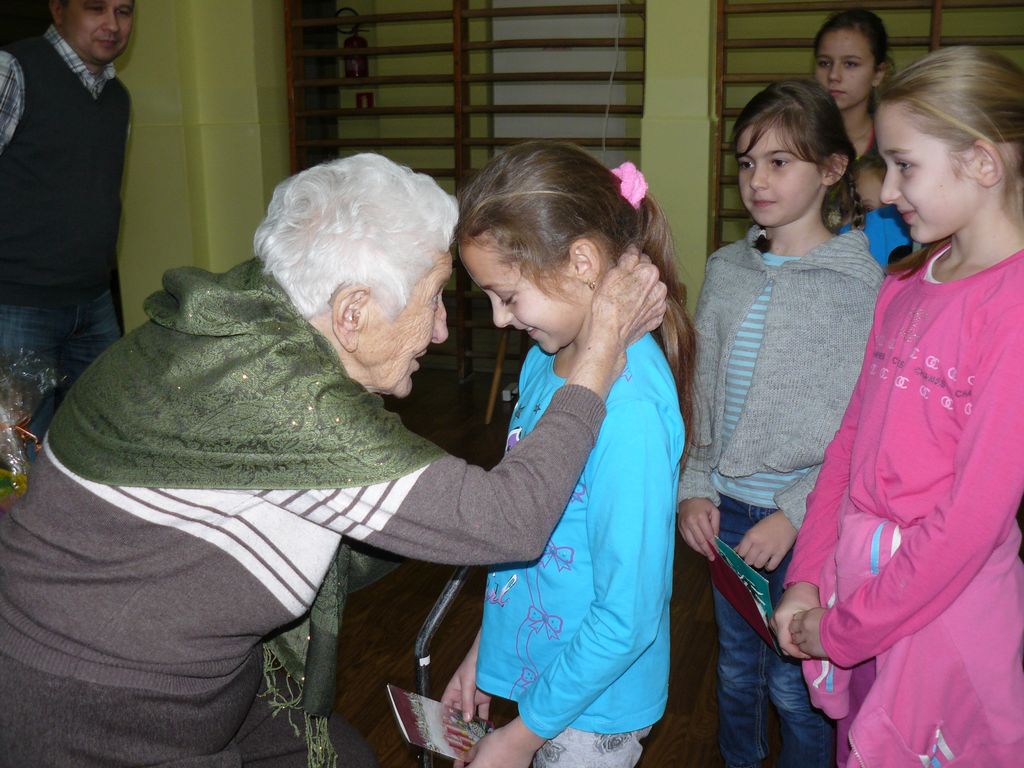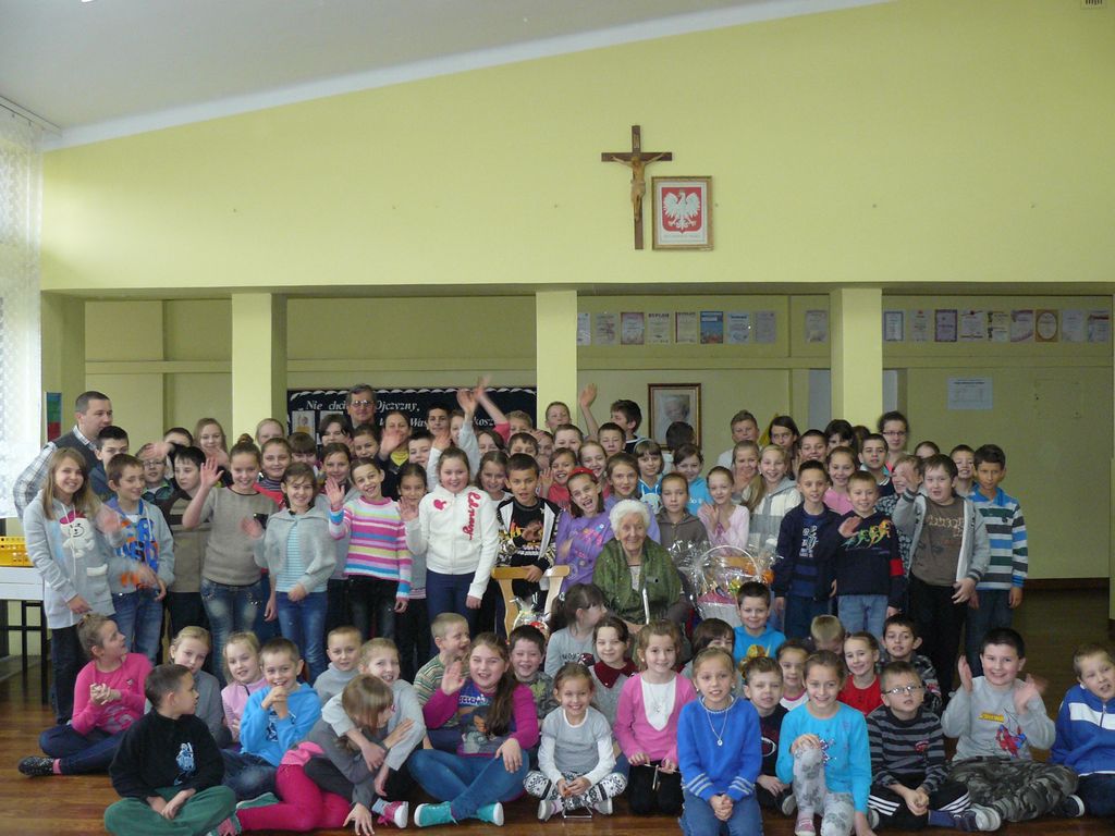Po wstępnych powitaniach z dyrektorem p. Bogusławem Markiem i nauczycielami, odbyło się spotkanie z wszystkimi uczniami, w trakcie którego osobiście przedstawili się pierwszoklasiści. Następnie zaśpiewali dla swojej nowopoznanej babci – kolędę, którą przygotowują na spotkanie wigilijne. Wszyscy uczniowie wręczyli Jej przygotowane laurki i upominki, a otrzymali słodycze.