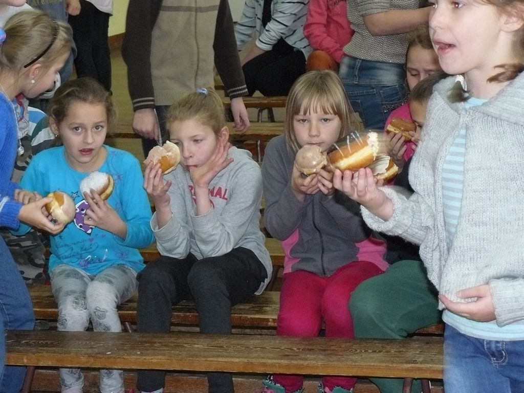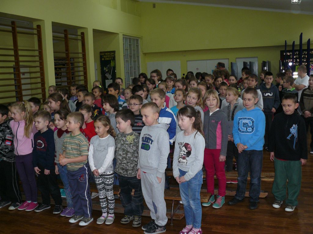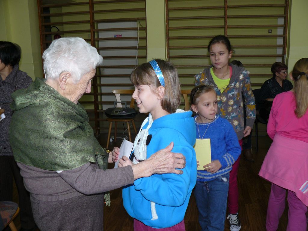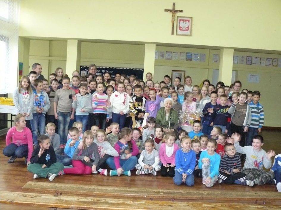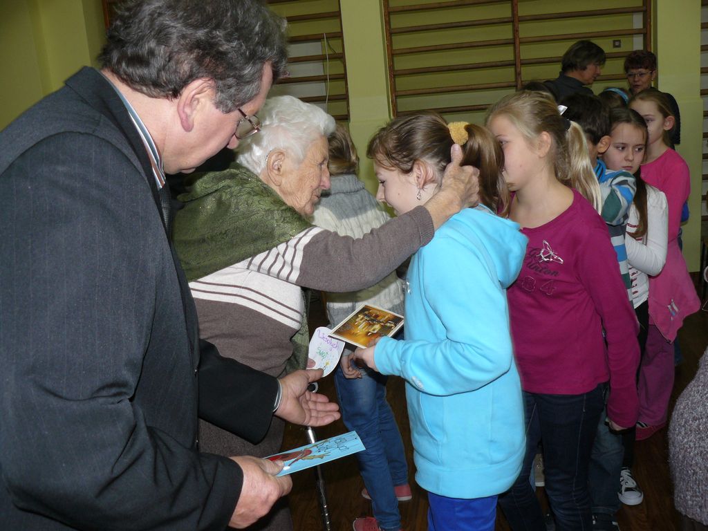 Po wstępnych powitaniach z dyrektorem p. Bogusławem Markiem i nauczycielami, odbyło się spotkanie z wszystkimi uczniami, w trakcie którego osobiście przedstawili się pierwszoklasiści. Następnie zaśpiewali dla swojej nowopoznanej babci – kolędę, którą przygotowują na spotkanie wigilijne. Wszyscy uczniowie wręczyli Jej przygotowane laurki i upominki, a otrzymali słodycze.