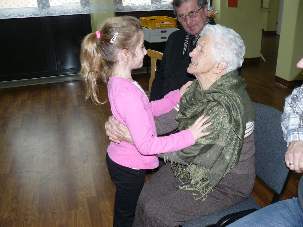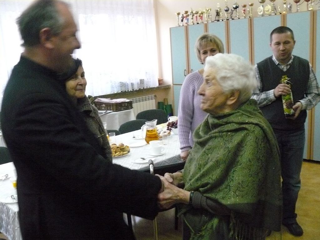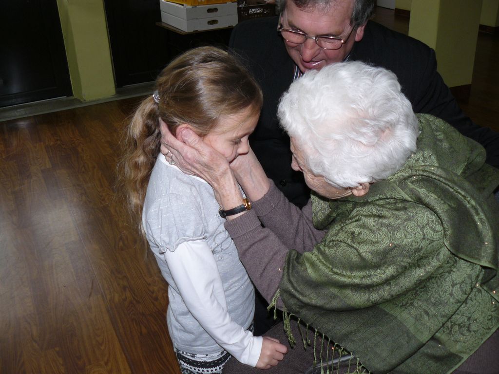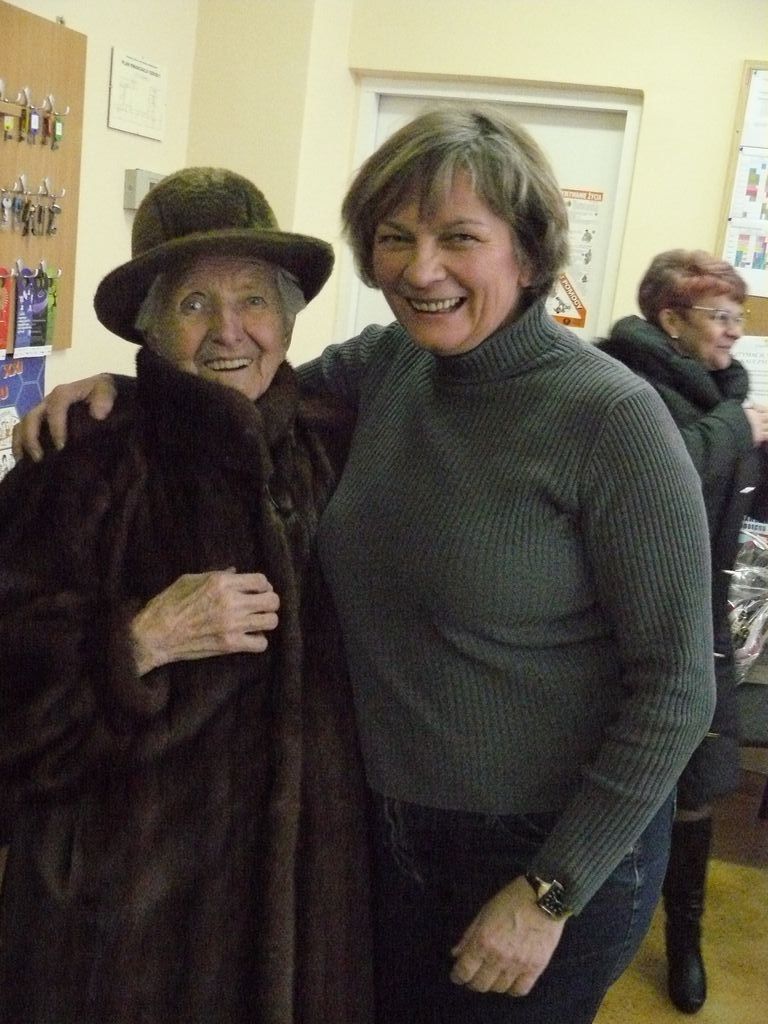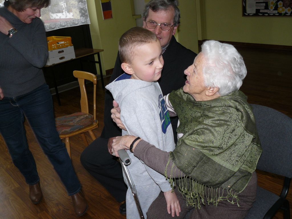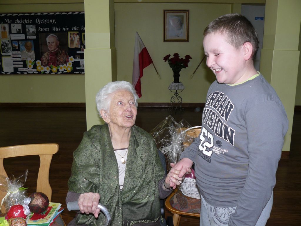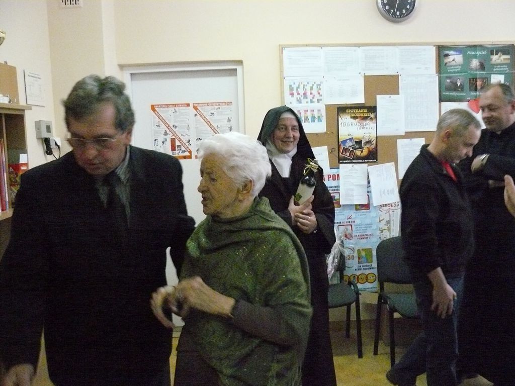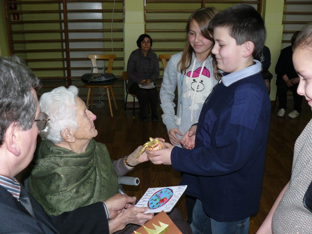 Gdy 5 grudnia rano dowiedzieliśmy się, że za dwie godziny będzie u nas Pani Stefania, w szkole wybuchło spore zamieszanie. Zwykle wcześniej byliśmy powiadamiani o Jej odwiedzinach i mogliśmy się do nich przygotować. Tutaj nie było na to czasu i wszystko odbywało się spontanicznie. Mimo takiego zaskoczenia, udało się nam trochę do tej wizyty – niespodzianki przygotować. W klasach uczniowie wykonywali kolorowe laurki, które Pani Stefania kolekcjonuje, i – jak sama mówiła – przegląda i czyta, gdy tęskni za swoimi wnuczętami ze Smęgorzowa. Pani Dulembowa razem z siostrą Klarissą i towarzyszącą Jej panią pielęgniarką, zjawiły się w naszej szkole przed południem.