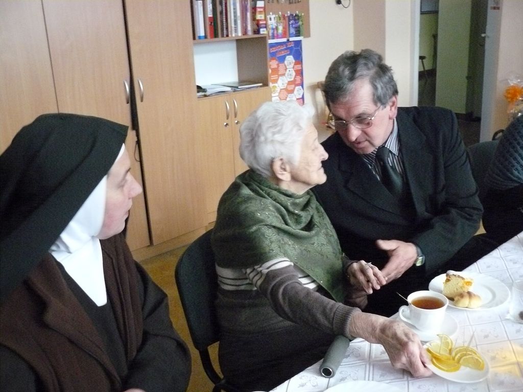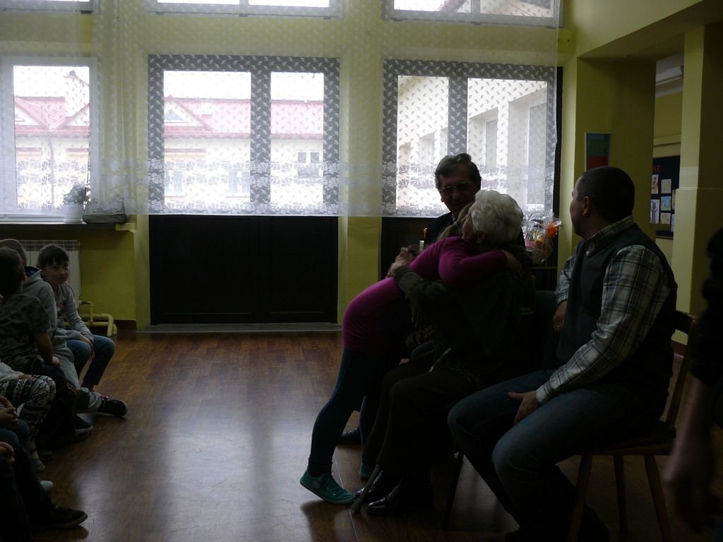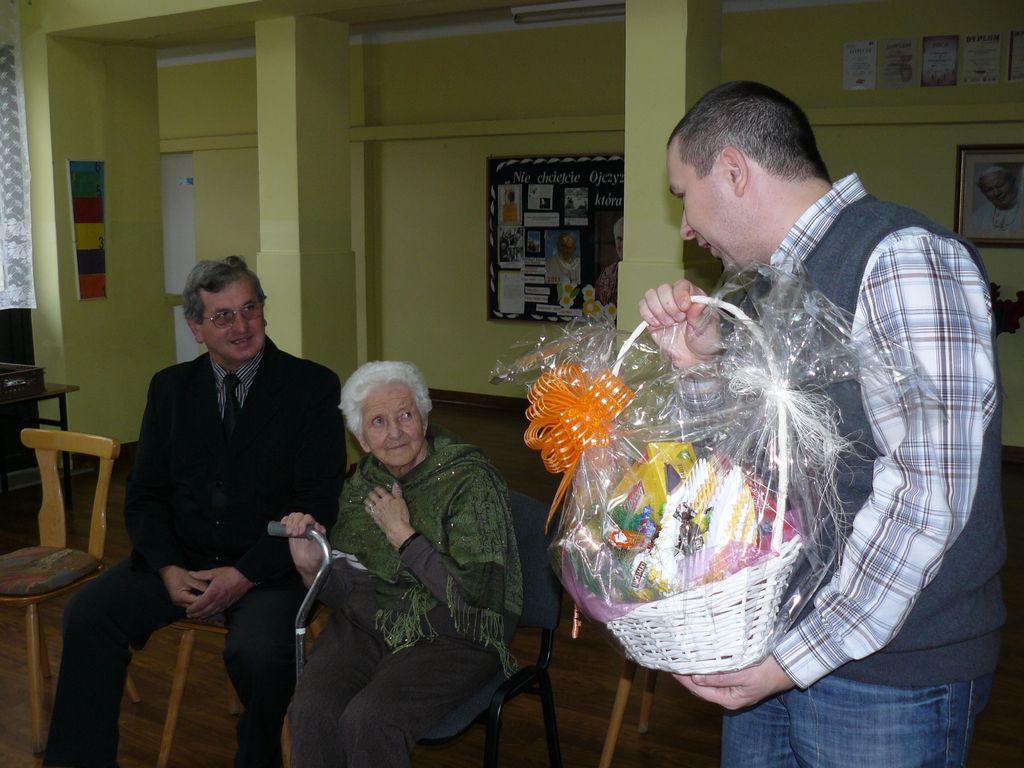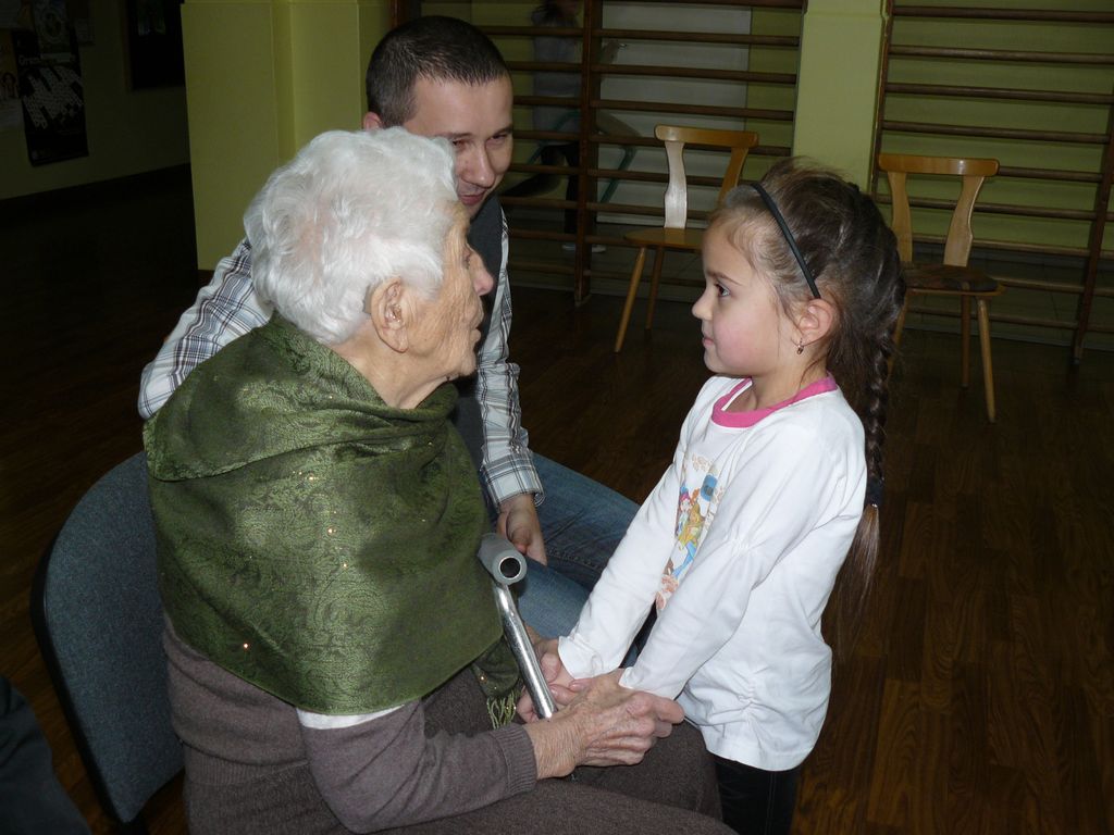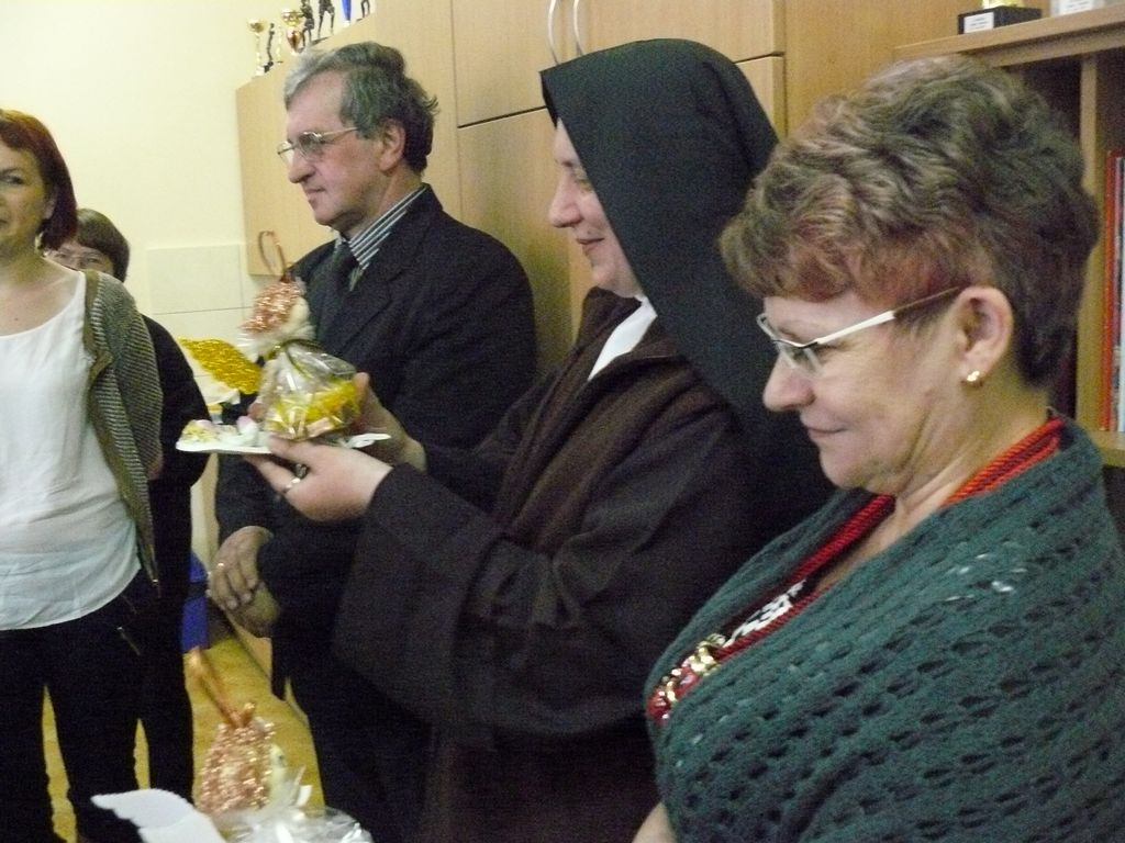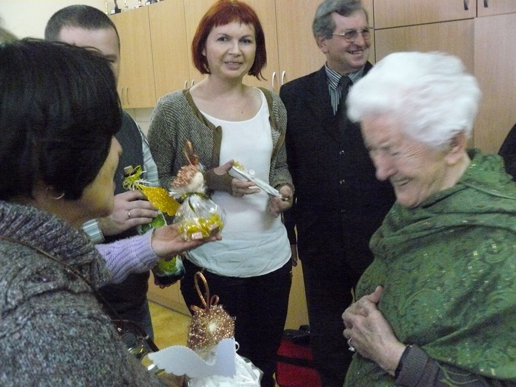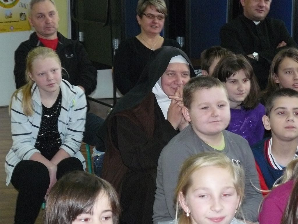 Gdy 5 grudnia rano dowiedzieliśmy się, że za dwie godziny będzie u nas Pani Stefania, w szkole wybuchło spore zamieszanie. Zwykle wcześniej byliśmy powiadamiani o Jej odwiedzinach i mogliśmy się do nich przygotować. Tutaj nie było na to czasu i wszystko odbywało się spontanicznie. Mimo takiego zaskoczenia, udało się nam trochę do tej wizyty – niespodzianki przygotować. W klasach uczniowie wykonywali kolorowe laurki, które Pani Stefania kolekcjonuje, i – jak sama mówiła – przegląda i czyta, gdy tęskni za swoimi wnuczętami ze Smęgorzowa. Pani Dulembowa razem z siostrą Klarissą i towarzyszącą Jej panią pielęgniarką, zjawiły się w naszej szkole przed południem.