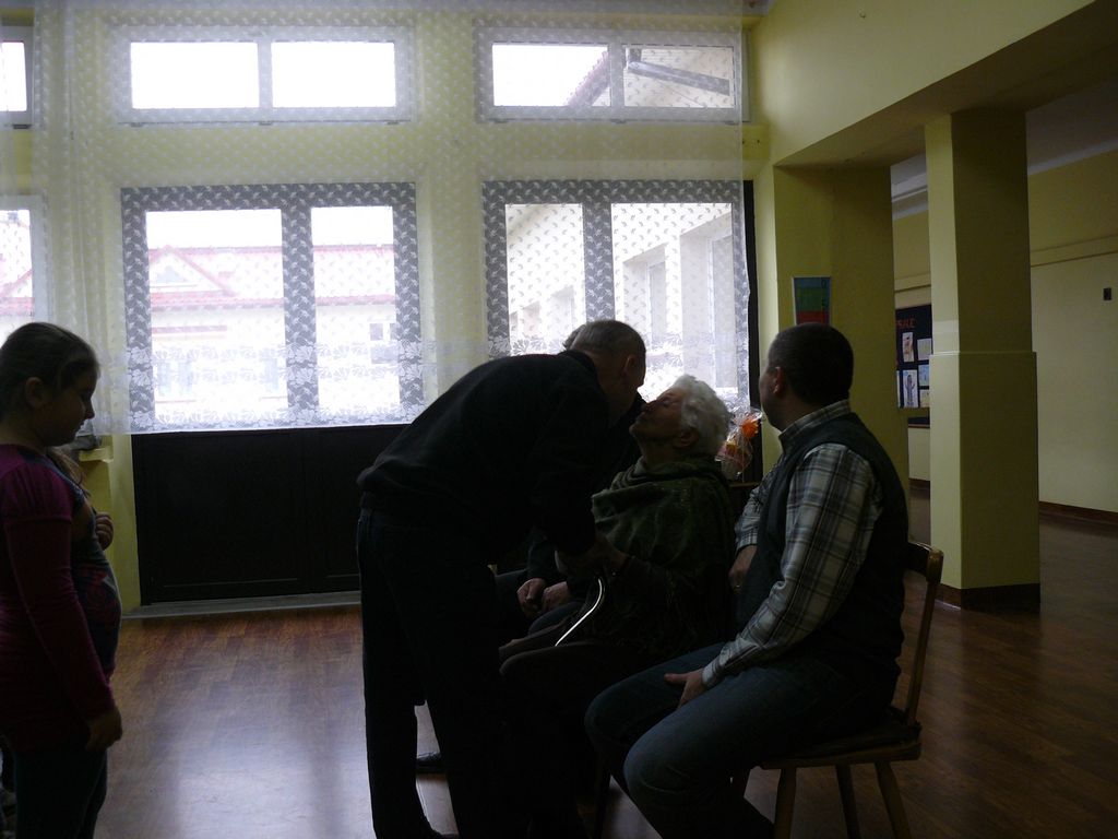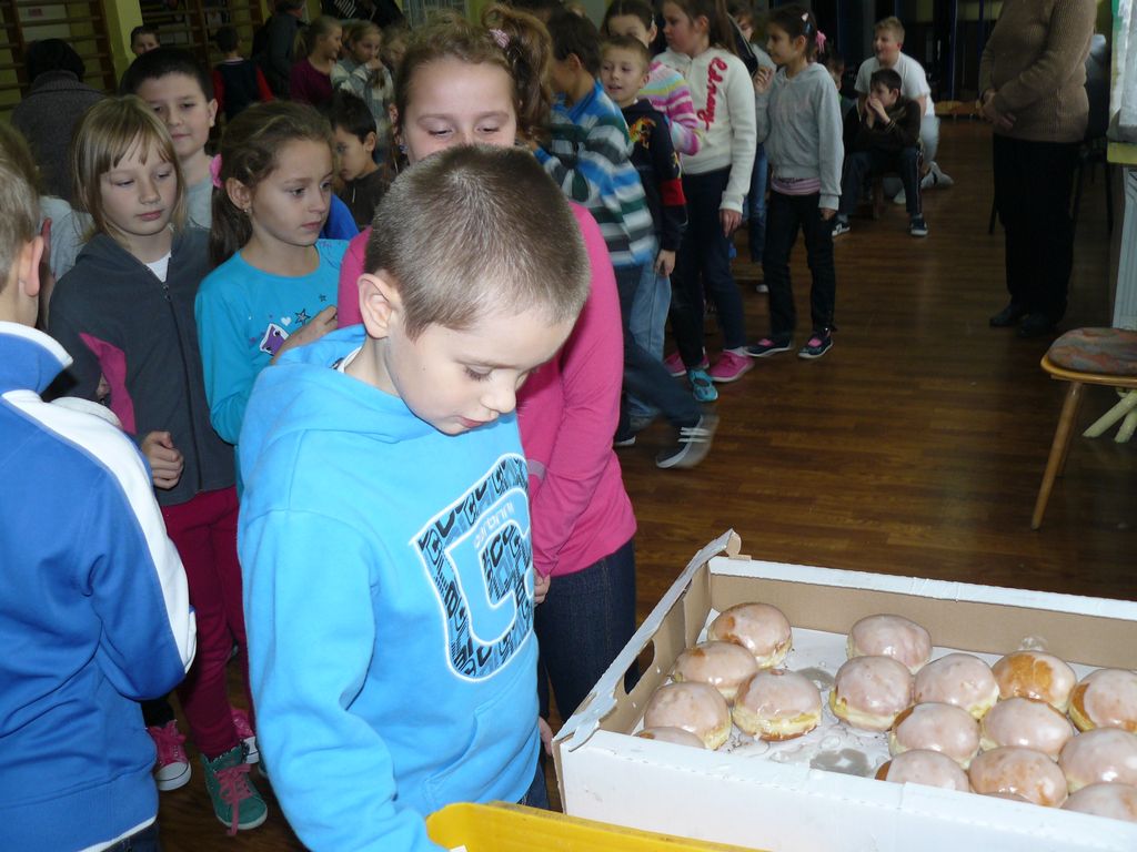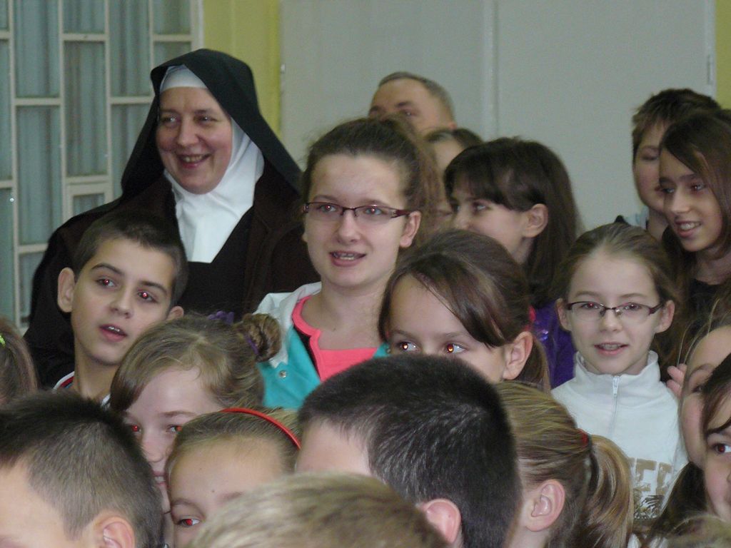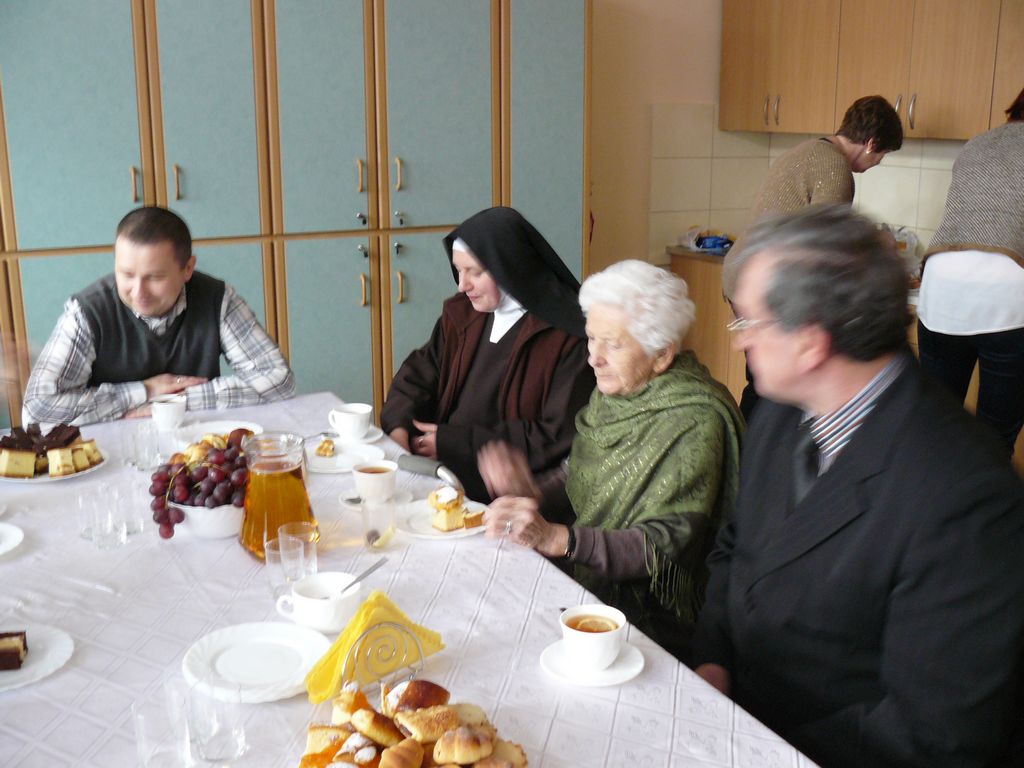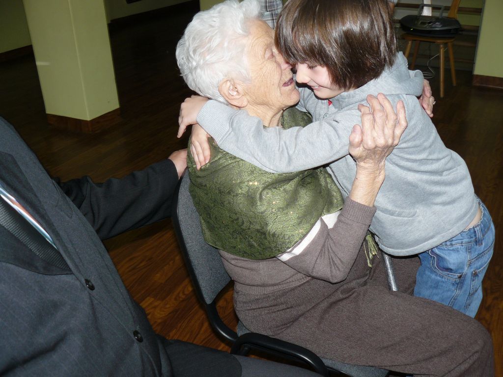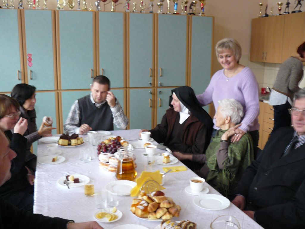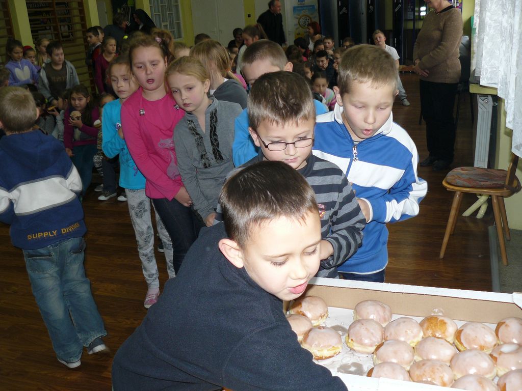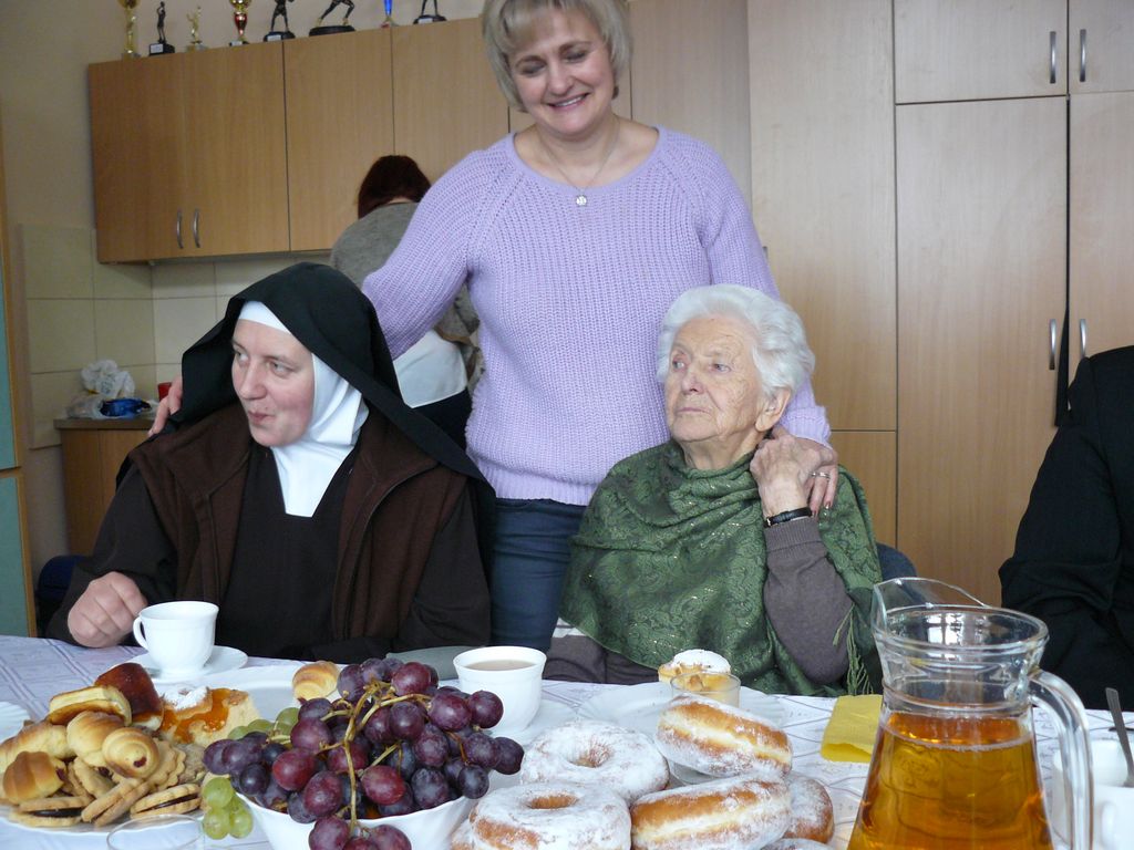 Gdy 5 grudnia rano dowiedzieliśmy się, że za dwie godziny będzie u nas Pani Stefania, w szkole wybuchło spore zamieszanie. Zwykle wcześniej byliśmy powiadamiani o Jej odwiedzinach i mogliśmy się do nich przygotować. Tutaj nie było na to czasu i wszystko odbywało się spontanicznie. Mimo takiego zaskoczenia, udało się nam trochę do tej wizyty – niespodzianki przygotować. W klasach uczniowie wykonywali kolorowe laurki, które Pani Stefania kolekcjonuje, i – jak sama mówiła – przegląda i czyta, gdy tęskni za swoimi wnuczętami ze Smęgorzowa. Pani Dulembowa razem z siostrą Klarissą i towarzyszącą Jej panią pielęgniarką, zjawiły się w naszej szkole przed południem.