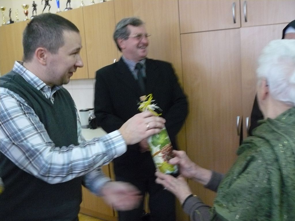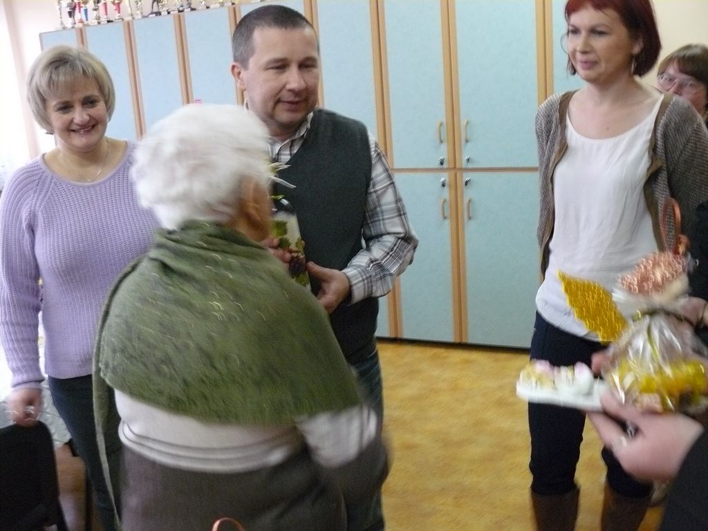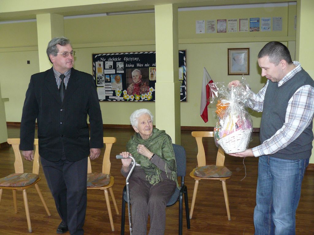 Pan dyrektor podarował naszemu Gościowi kosz upominkowy od rodziców, który czekał na Panią Stefanię od Dnia Edukacji Narodowej. Wtedy nie mogła przyjechać, ze względu na stan zdrowia. Pani Dulembowa życzyła wszystkim uczniom zapału do nauki i samych piątek i szóstek, a nauczycielom wytrwałości i satysfakcji z pracy. Uczniowie na pożegnanie odśpiewali swojej babci tradycyjne „Dwieście lat…”.