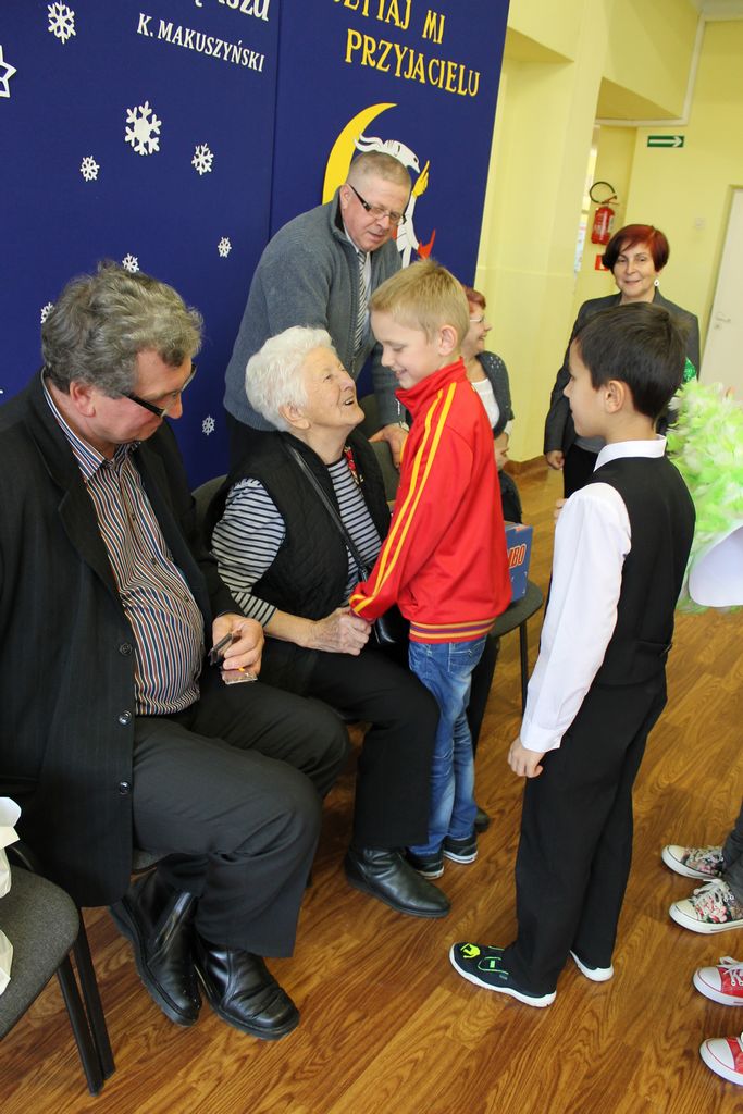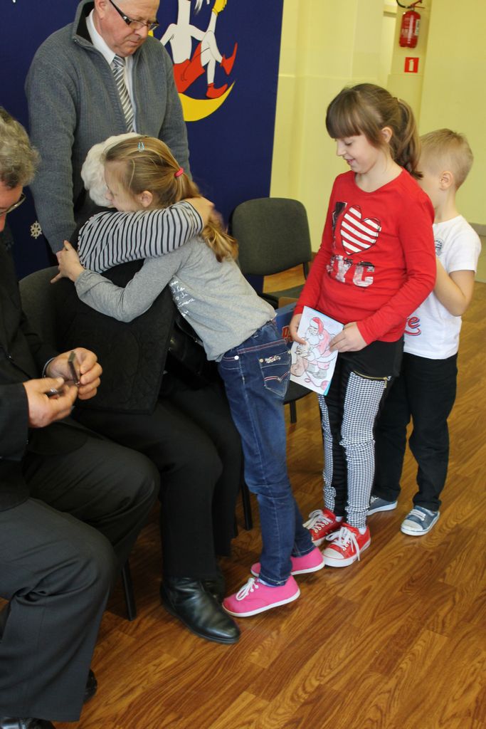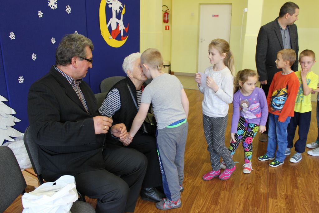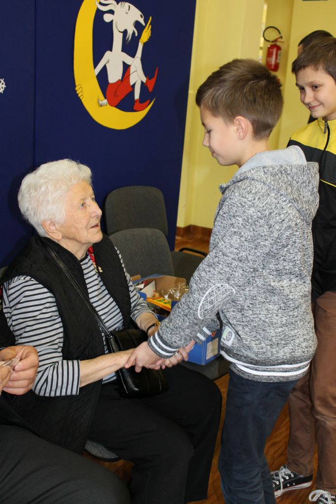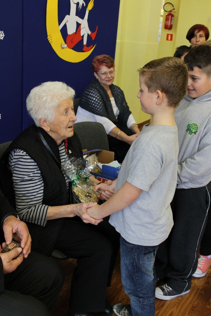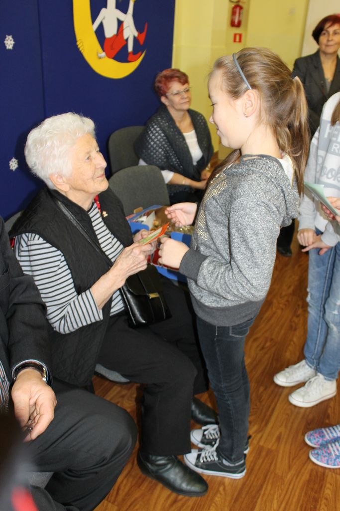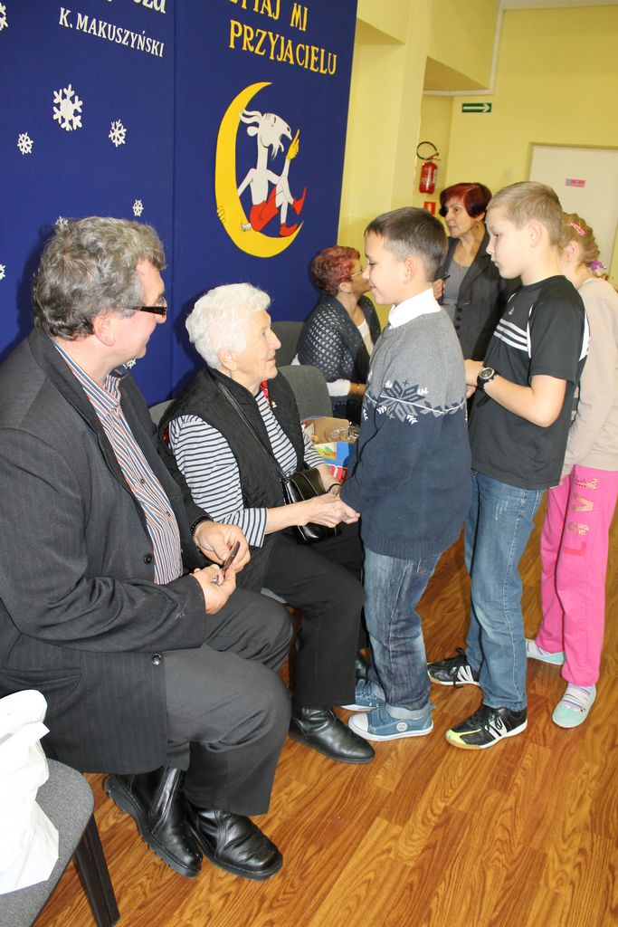 Wszyscy uczniowie indywidualnie składali pani Stefanii życzenia świąteczne oraz wręczali własnoręcznie wykonane laurki i upominki, a pani Stefania obdarowała ich słodkościami. Wzbogaciła również szkolną bibliotekę w wiele cennych woluminów. Ostatnim punktem wizyty było spotkanie z personelem szkoły.