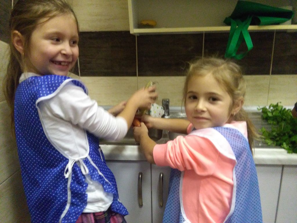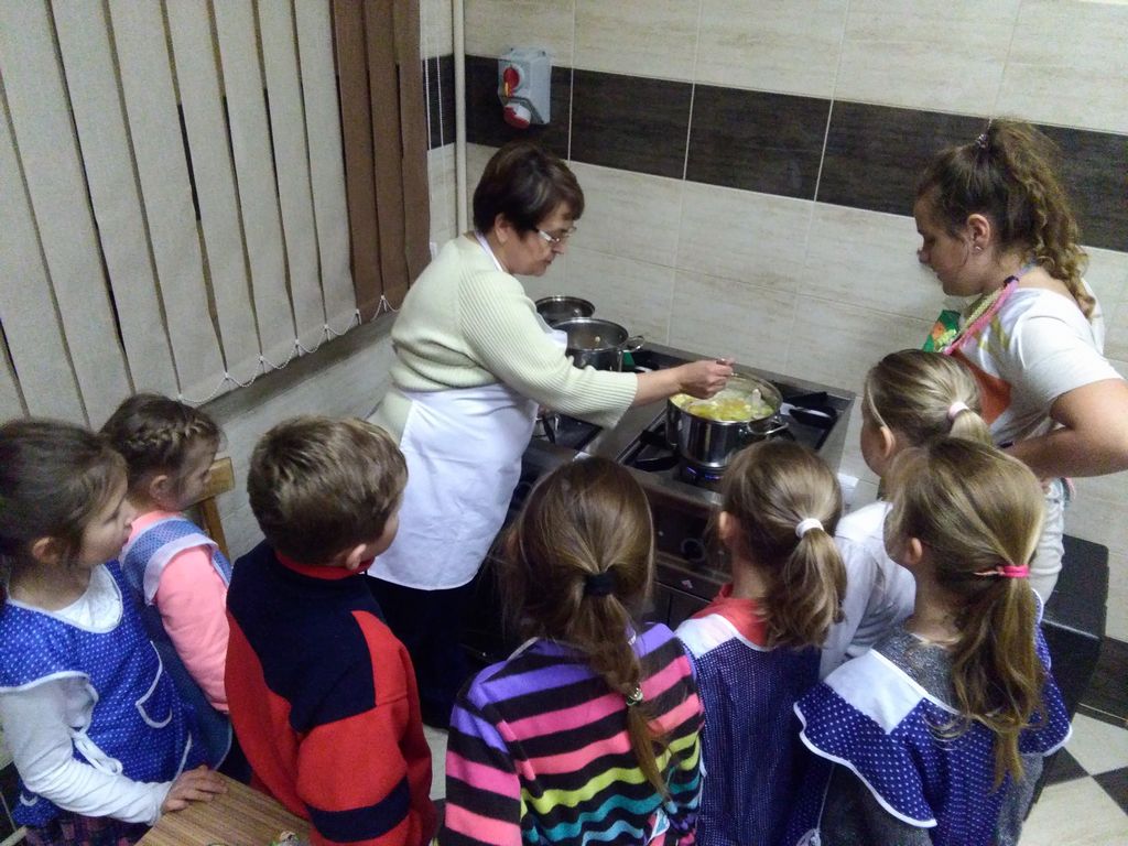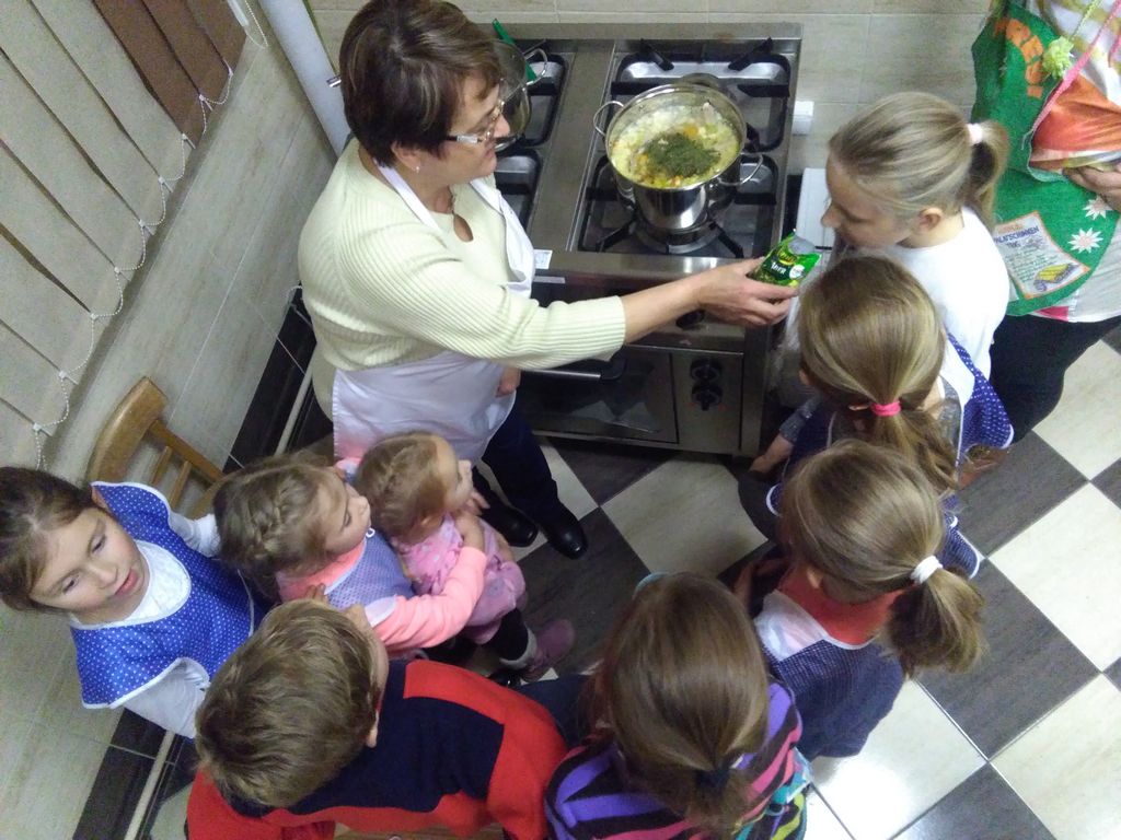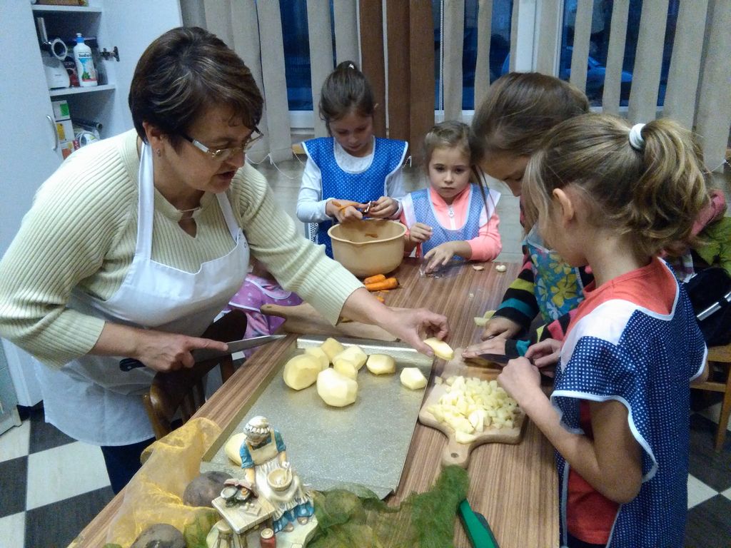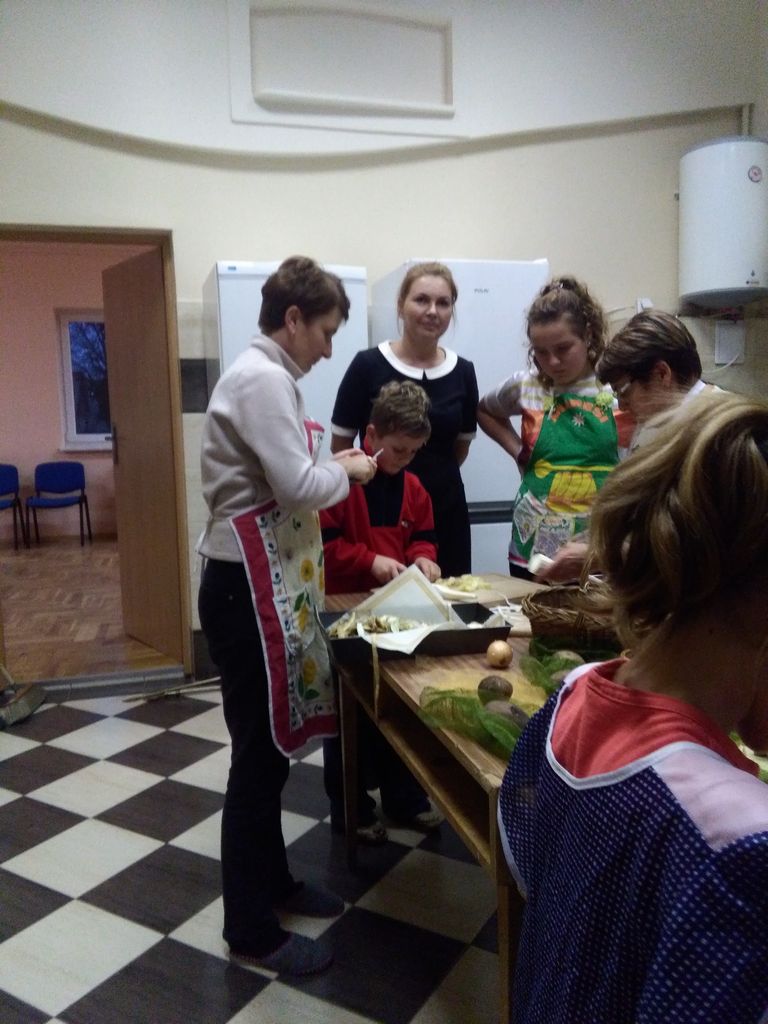 Uczestnicy spotkania z dużym zaangażowaniem pracowali: obierali warzywa, kroili je, łączyli znane i mniej znane smaki. Zadbali, aby zupa była ładnie podana i skonsumowana w pięknej sali. Zupa o nazwie „rzodkie zimnioki” zniknęła w jednej chwili, była tak pyszna.