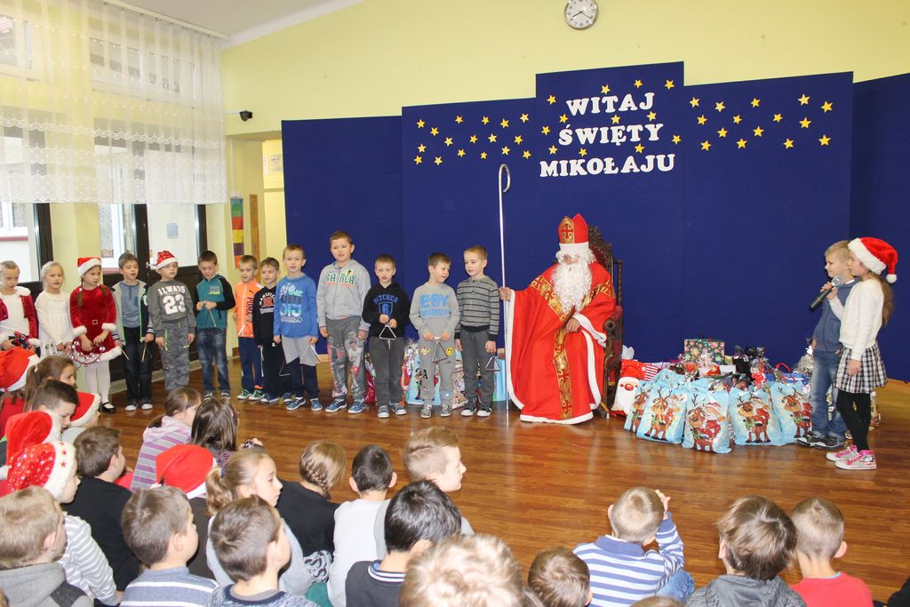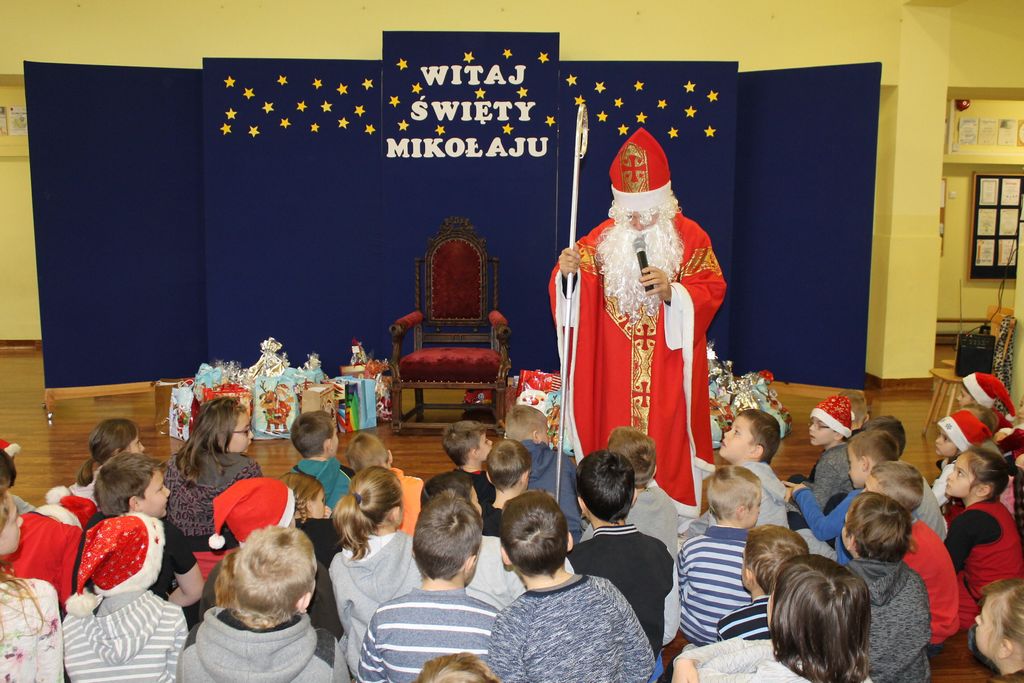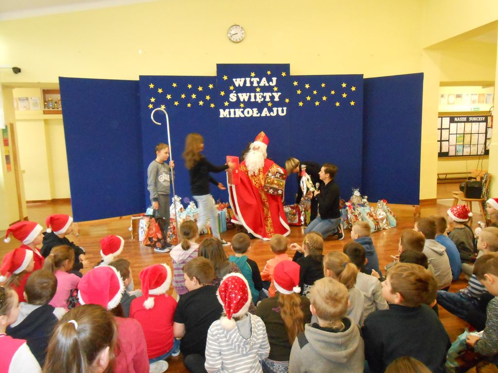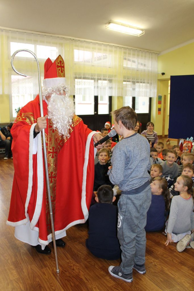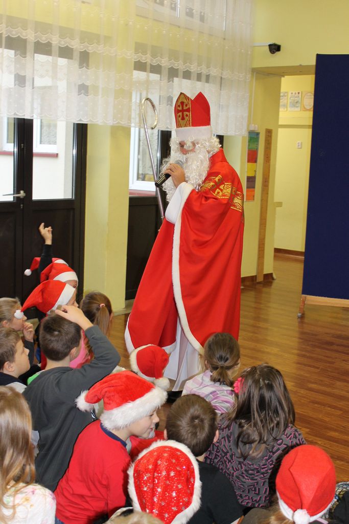 Dzisiaj, 6 grudnia, św. Mikołaj odwiedził naszą szkołę. Już kilka minut po godz. 8 zjawił się na holu, gdzie czekali na Niego wszyscy uczniowie, nauczyciele i rodzice. Na powitanie Mikołaj wysłuchał piosenki, którą przygotowały dzieci z I klasy. Później rozmawiał z uczniami i odpowiadał na ich pytania.