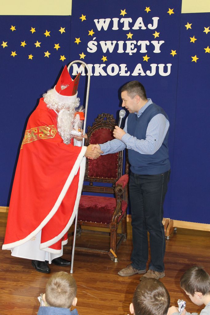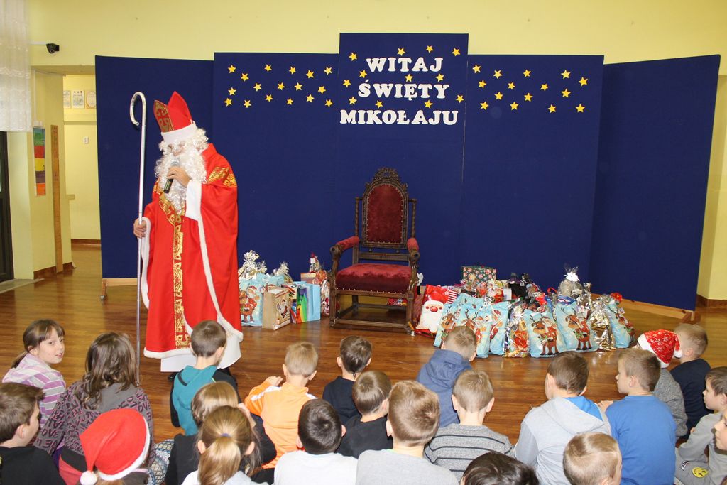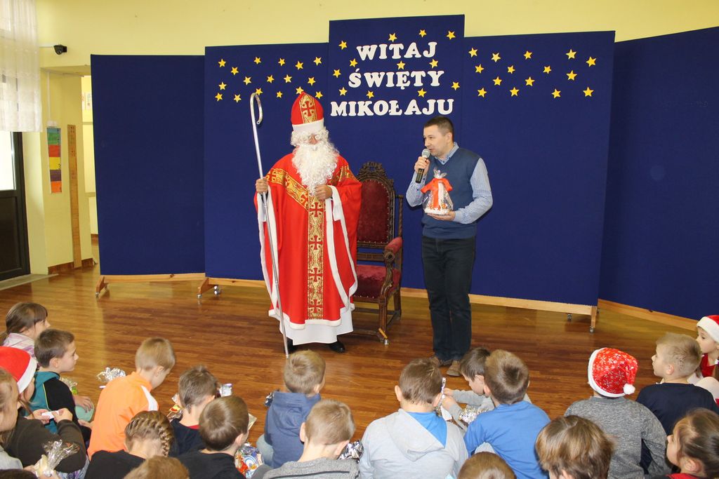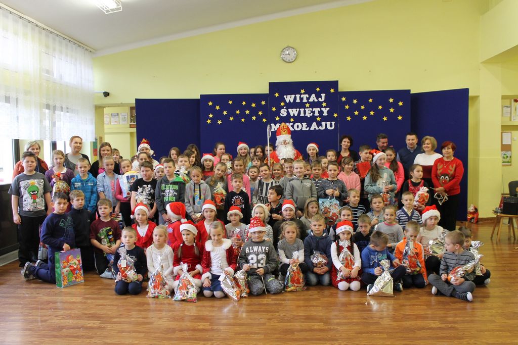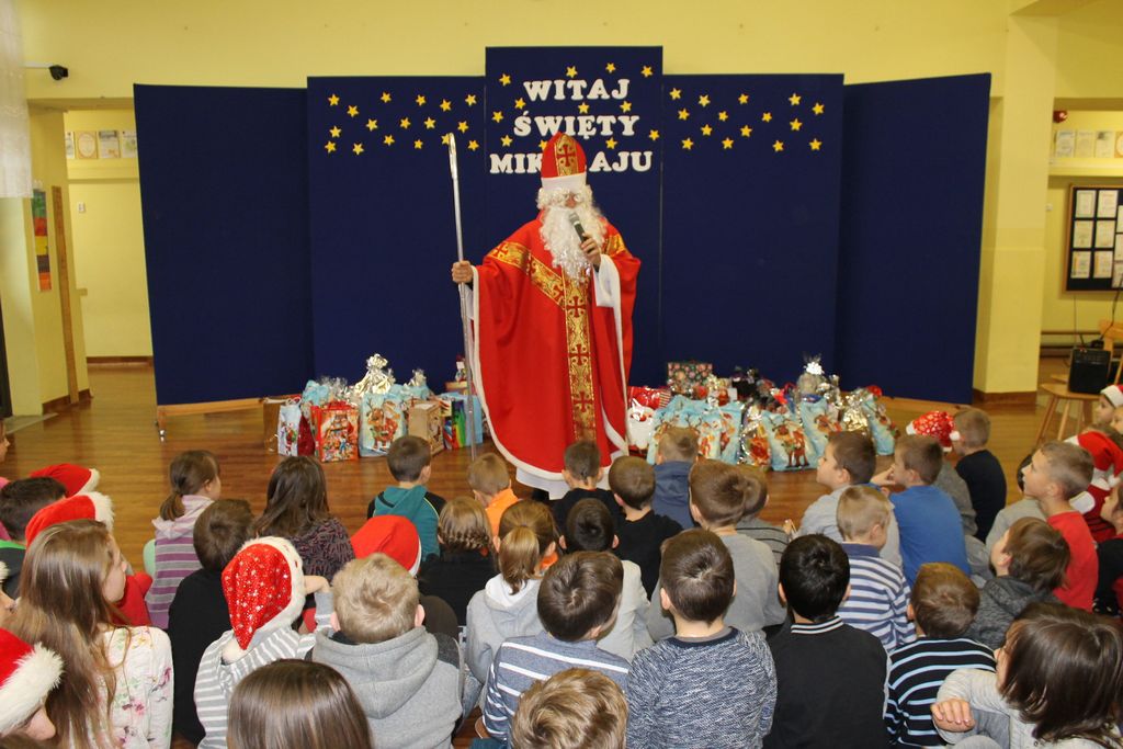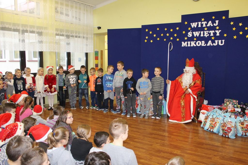 Dzisiaj, 6 grudnia, św. Mikołaj odwiedził naszą szkołę. Już kilka minut po godz. 8 zjawił się na holu, gdzie czekali na Niego wszyscy uczniowie, nauczyciele i rodzice. Na powitanie Mikołaj wysłuchał piosenki, którą przygotowały dzieci z I klasy. Później rozmawiał z uczniami i odpowiadał na ich pytania.