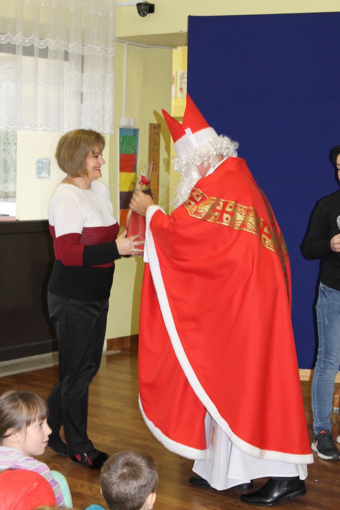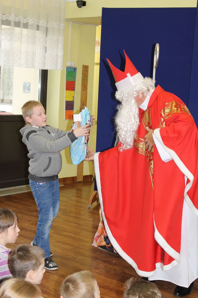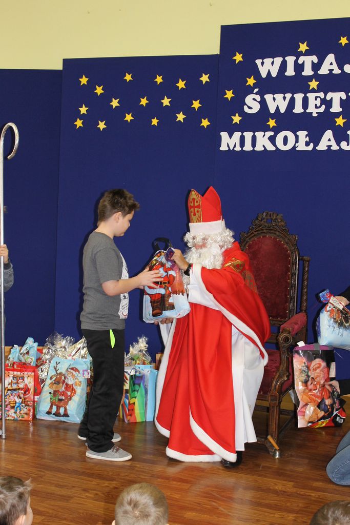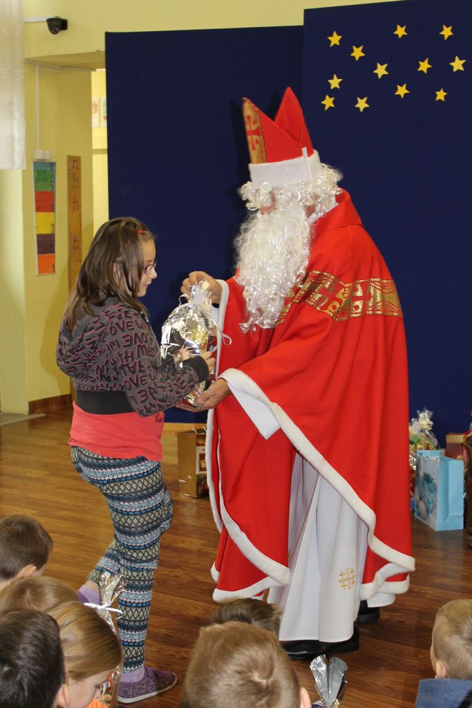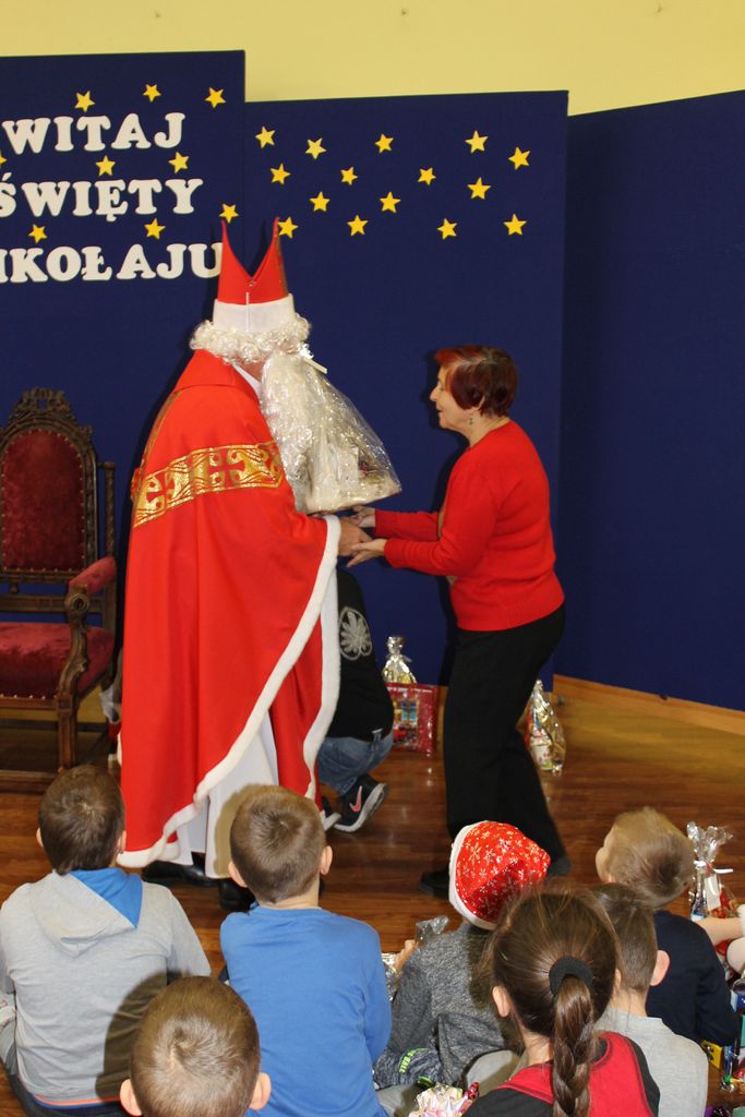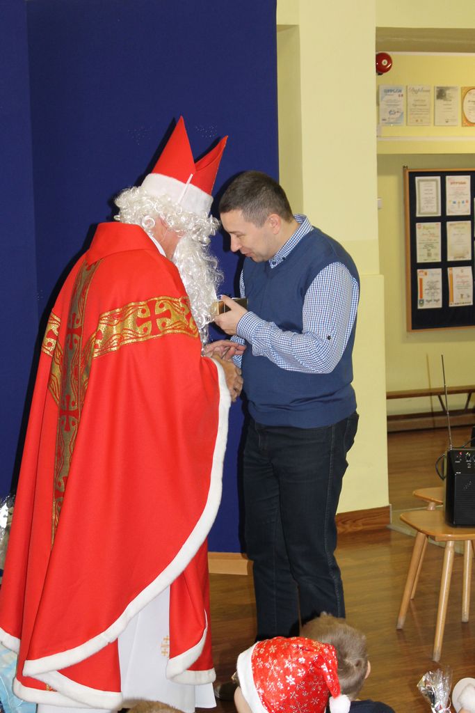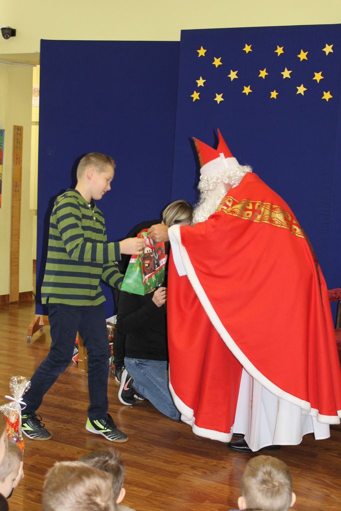 Wszystkie dzieci otrzymały prezenty, a Mikołaj nie zapomniał również o nauczycielach. Na koniec, żeby Mikołaj pamiętał o naszej szkole w następnym roku, dyrektor w imieniu wszystkich uczniów i pracowników wręczył mu drobny upominek. Wizytę zakończyło wspólne zdjęcie.