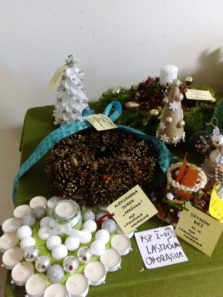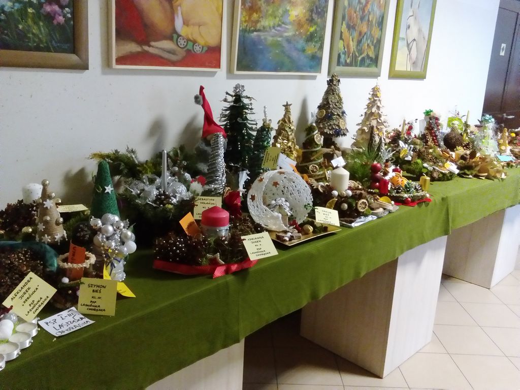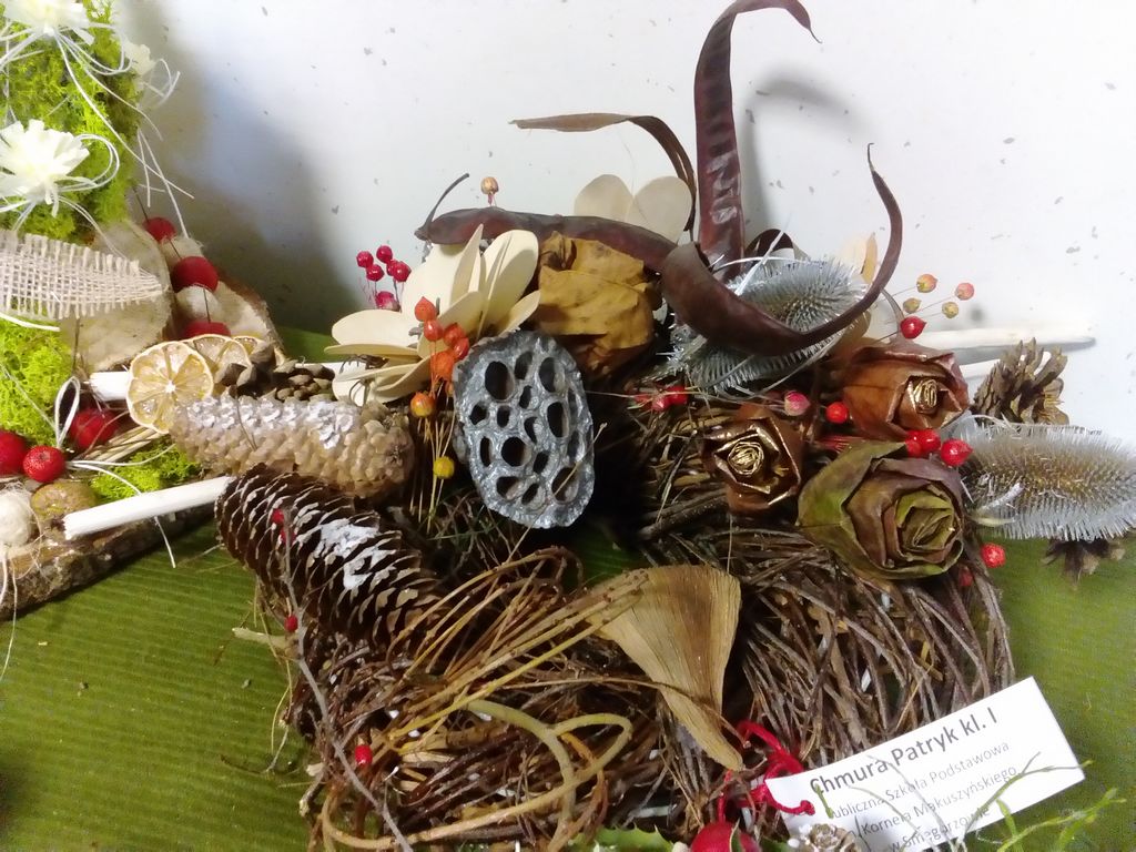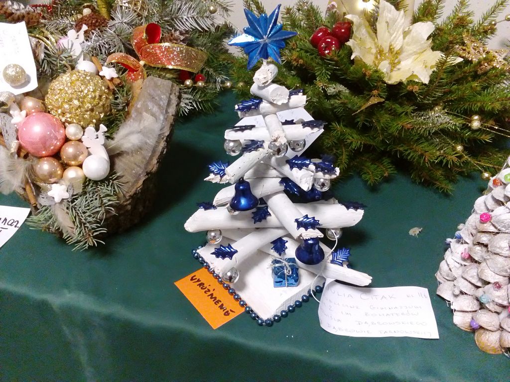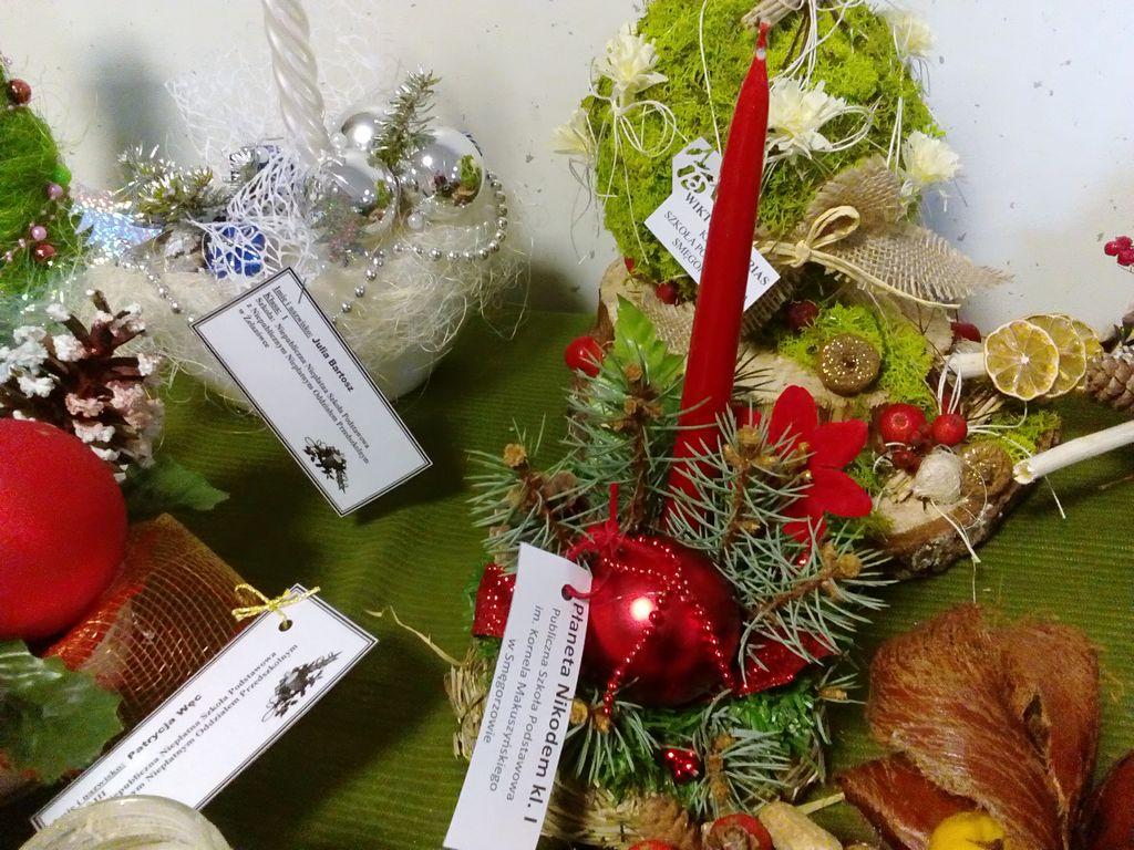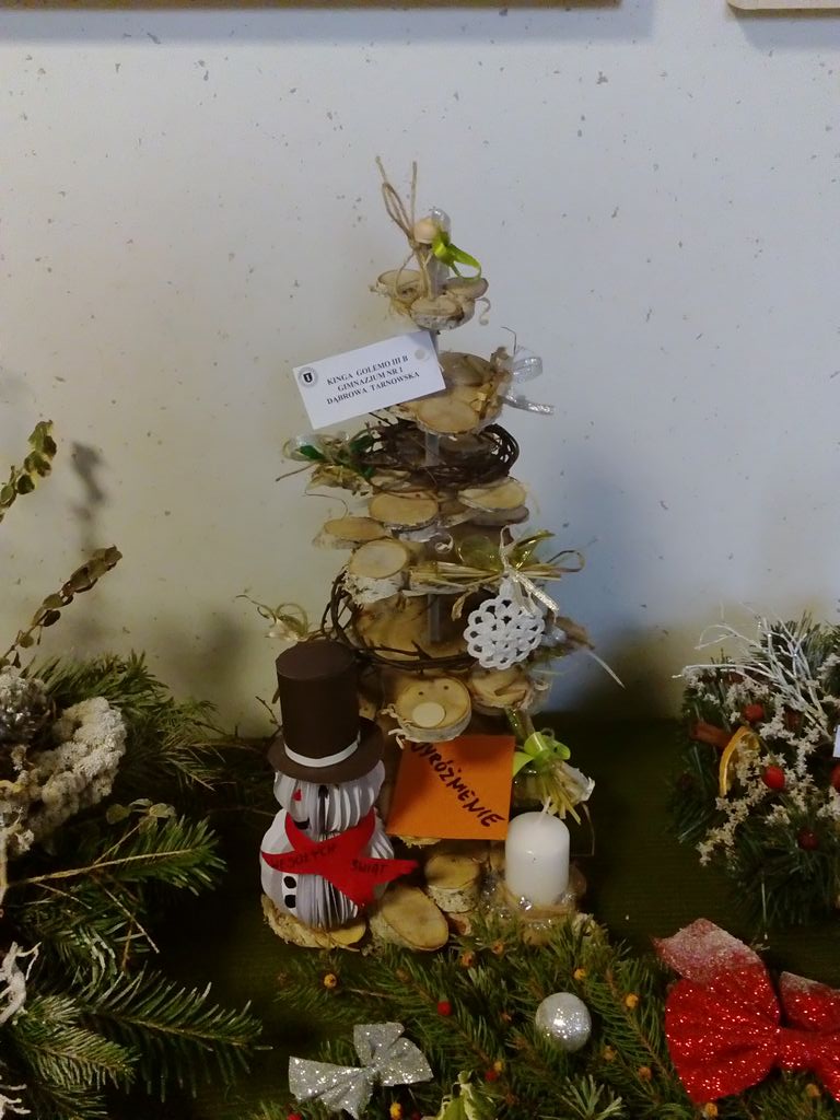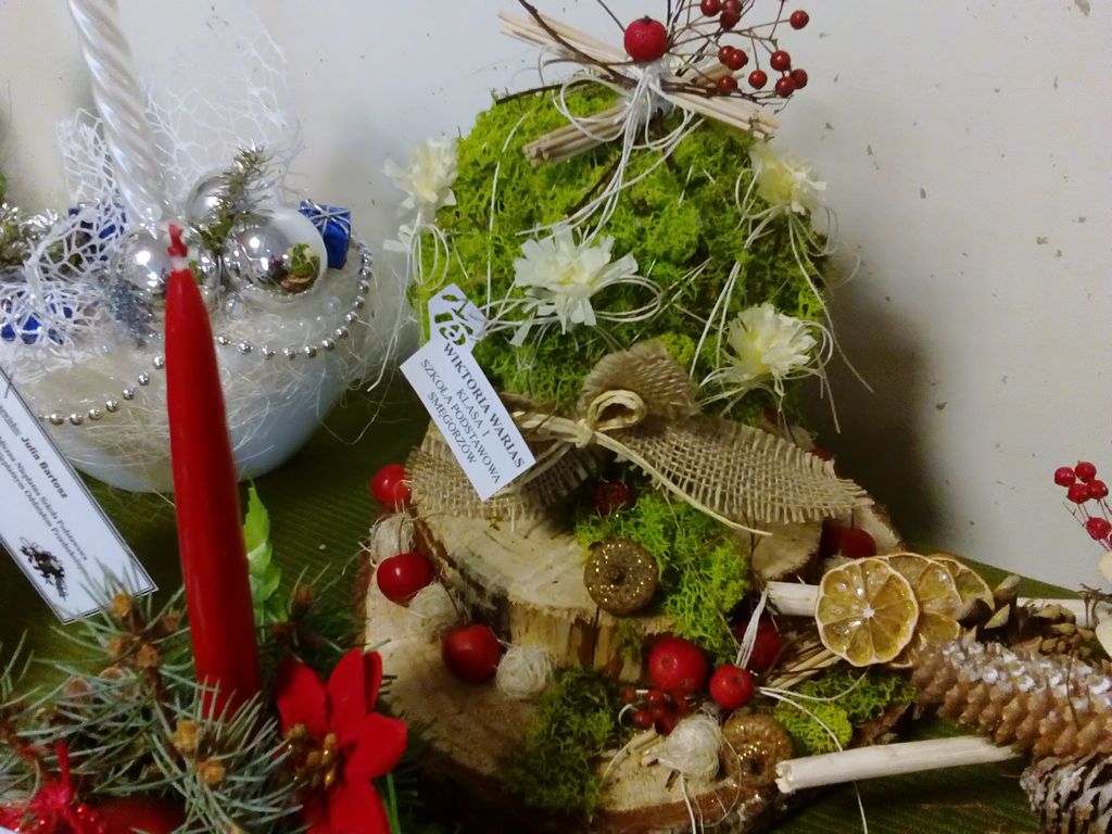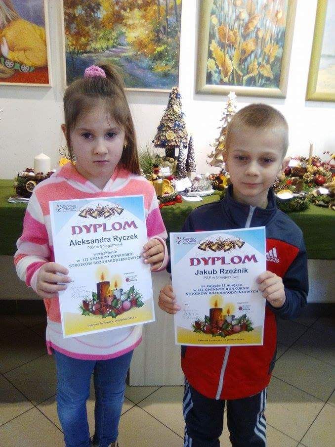 Boże Narodzenie i czas przygotowania do świąt to najpiękniejszy okres w całym roku. W tym czasie dzieci z naszej szkoły wraz z rodzicami z wielką radością wykonywały nie tylko ozdoby choinkowe ale także stroiki świąteczne. Byli to następujący uczniowie z klasy I: Patryk Chmura, Julia Klich, Aleksandra Ryczek, Wiktoria Warias, Nikodem Płaneta, Mateusz Taraska, Jakub Rzeźnik. Wszyscy oni wykonali bardzo pomysłowe i oryginalne prace. Na zorganizowany przez Dąbrowski Dom Kultury konkurs wpłynęło wiele pięknych prac, dlatego też organizatorzy mieli bardzo trudne zadanie, by wybrać najładniejsze prace. W kategorii dzieci młodszych wśród nagrodzonych znalazł się Jakub Rzeźnik, któremu przyznano II miejsce. Wyróżnienie zdobyła Aleksandra Ryczek. Otwarcie wystawy oraz rozdanie nagród odbyło się 16 grudnia 2016 r. Prace plastyczne naszych uczniów wzbudziły duże zainteresowanie wśród oglądających i wyróżniały się tym, że wykonane były z naturalnych materiałów przyrodniczych.