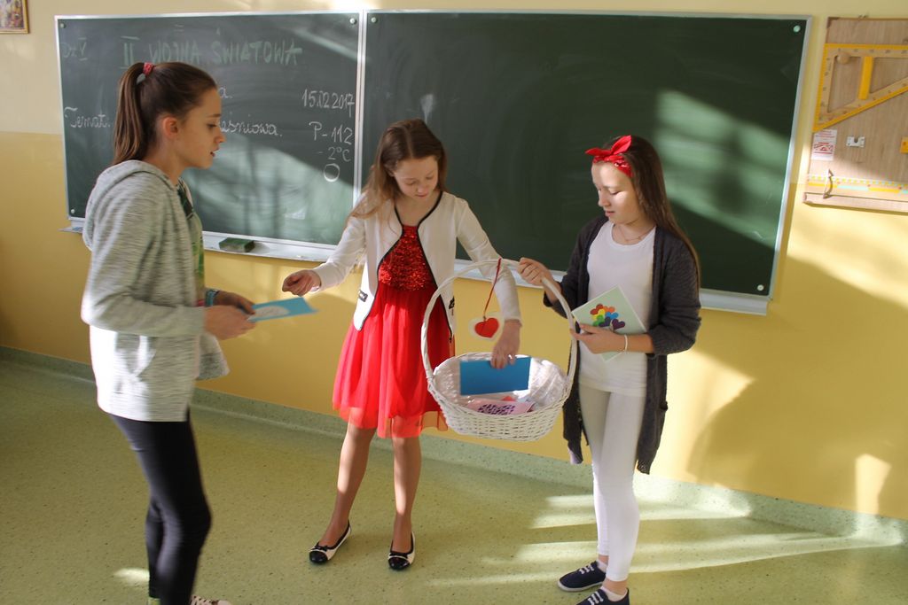 W tym roku walentynki zaczęliśmy jeszcze przed feriami, ponieważ już wtedy Samorząd Uczniowski uruchomił pocztę walentynkową. W dniu 14 lutego na szkolnych korytarzach dominował kolor czerwony, a 15 lutego Klaudia Bork i Karolina Przybyło wcieliły się w rolę listonoszek i dostarczyły walentynki do adresatów. Rekordzistką w tym dniu została Oliwia Kardaś z klasy II, która otrzymała aż 12 walentynkowych kartek. Gratulujemy! A listonoszkom z klasy VI bardzo dziękujemy za przygotowanie i sprawne zorganizowanie tego święta w naszej szkole.