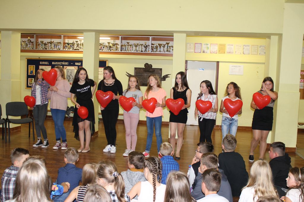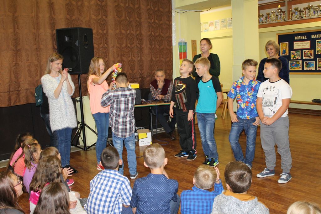 Dnia 05.10.2017 r. odbyła się dyskoteka szkolna zorganizowana przez Samorząd Uczniowski z okazji Dnia Chłopaka. We wspólnej zabawie uczestniczyli uczniowie z klas III–VII. W trakcie dyskoteki zostały przeprowadzone zabawne konkursy. Z każdej klasy wybrano po dwóch reprezentantów, którzy zmagali się m.in. z wiązaniem krawata, śpiewaniem przepisu na ciasto, robieniem pompek, tańcem z dziewczyną czy znajomością narzędzi do majsterkowania. Jury w składzie: p. Irena Golonka, p. Anna Kaczówka i Klaudia Bork wybrało trzech chłopców, którzy najlepiej poradzili sobie z wylosowanymi zadaniami. Miano najsympatyczniejszego chłopaka w naszej szkole otrzymali: Kacper Kupiec z klasy III, Kacper Rachwał z klasy IV i Dominik Panek z klasy V. Wszyscy chłopcy za odwagę otrzymali gromkie brawa i uśmiechy koleżanek, a za wykonanie zadania słodki upominek. Oczywiście świetnej zabawy nie byłoby bez muzyki, za którą serdecznie dziękujemy p. Stanisławowi Jarmule. Na zakończenie wieczoru nie zabrakło stałego akcentu szkolnych dyskotek – wspólnego tańca belgijskiego. Wychodzi nam on coraz lepiej.
