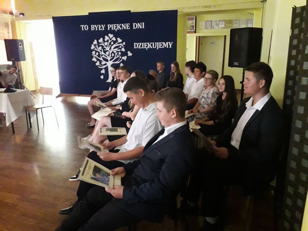 Kolejnym punktem programu było obejrzenie prezentacji przedstawiającej fotografie naszych absolwentów z całego okresu szkolnego. Przypomniała ona minione chwile i wzbudziła miłe wzruszenia. Aby troszkę osuszyć łzy i przywołać miłe wspomnienia uczniowie klasy VII przygotowali zabawny występ podsumowujący cudowne chwile w szkole naszych absolwentów. Po przedstawieniu prowadząca Angelika Garstka zaprosiła wszystkich do obejrzenia filmiku – podziękowań przygotowanych przez klasę 8. W ten sposób uczniowie klasy 8 chcieli wyrazili swoje podziękowania dyrekcji, wychowawcom, całemu gronu pedagogicznemu oraz rodzicom za trud włożony w edukację i wychowanie.