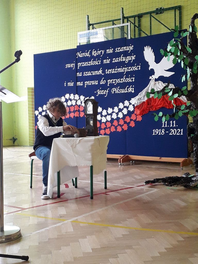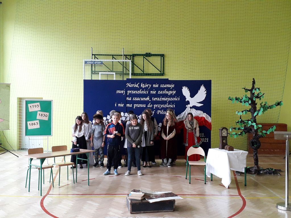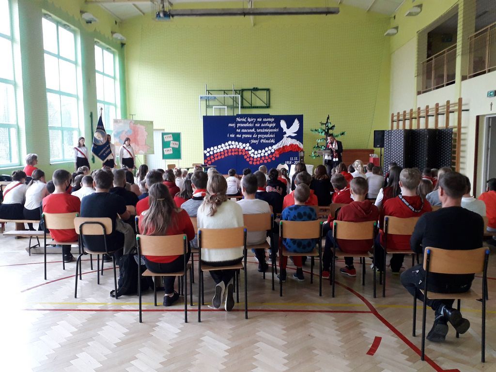 Szkolna akademia z okazji 103. rocznicy odzyskania przez Polskę niepodległości rozpoczęła się od uroczystego odśpiewania hymnu – Mazurka Dąbrowskiego. Następnie głos zabrał Pan Dyrektor – Bogusław Marek, który przytoczył kilka ciekawostek z historii lokalnej. Niedaleko nas ustanowiono granicę między zaborem rosyjskim i austriackim. Nasz region należał do zaboru austriackiego. Mieszkańcy Galicji mogli się tu cieszyć pewnymi swobodami obywatelskimi, których nie posiadali mieszkańcy, np. zaboru rosyjskiego. Akt symbolicznego zespolenia ziem rozdartych przez zabory miał miejsce w Szczucinie, na prowizorycznym moście na Wiśle, gdzie spotkały się uroczyste pochody mieszkańców Galicji i Królestwa. Znajomość historii jest bardzo ważna dla przyszłych pokoleń. Cytując marszałka Józefa Piłsudskiego – Naród, który nie szanuje swej przeszłości nie zasługuje na szacunek teraźniejszości i nie ma prawa do przyszłości.