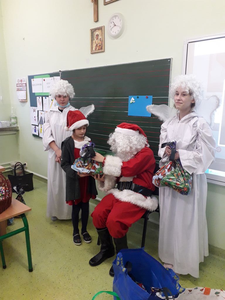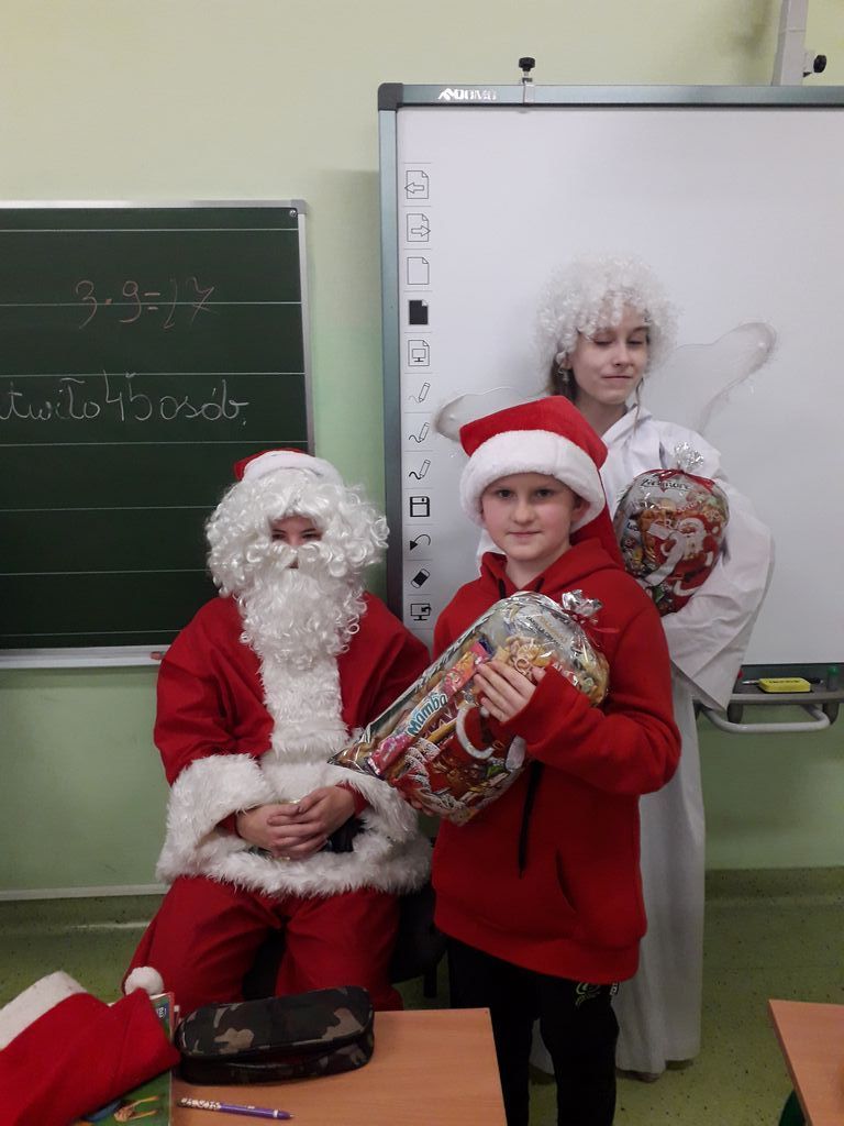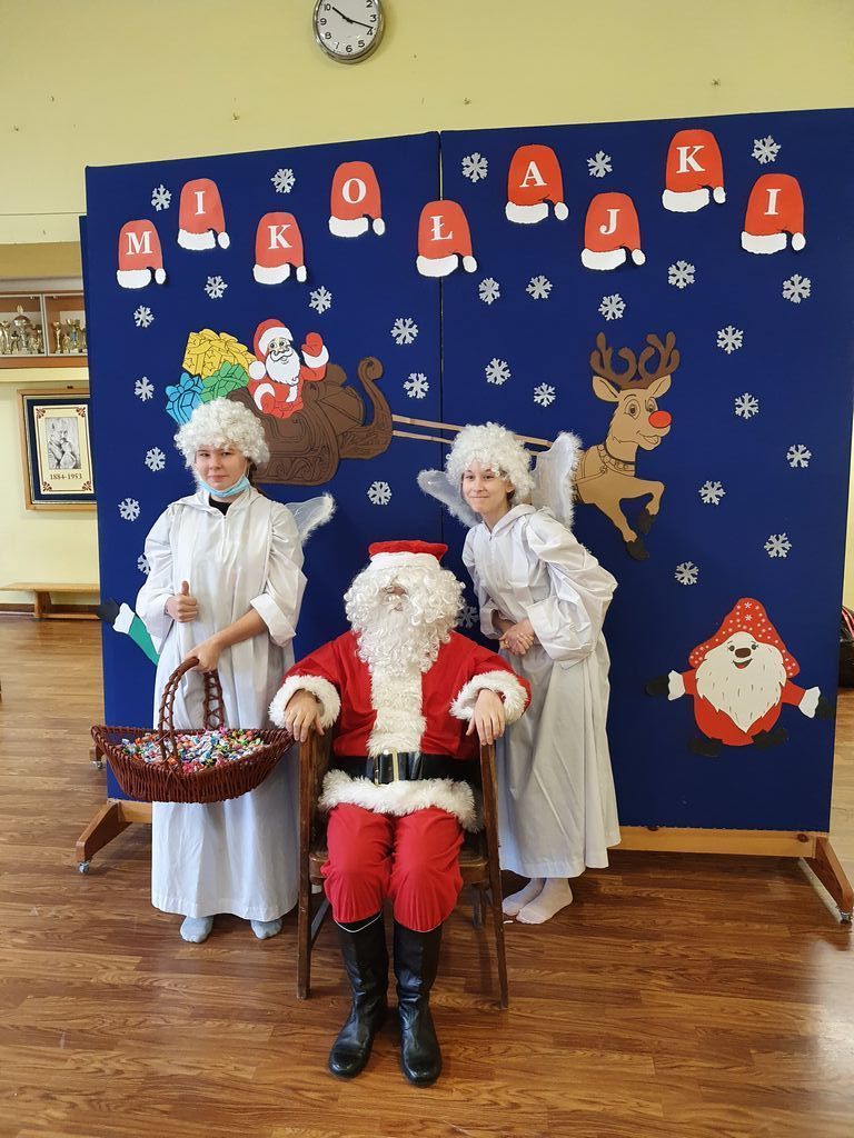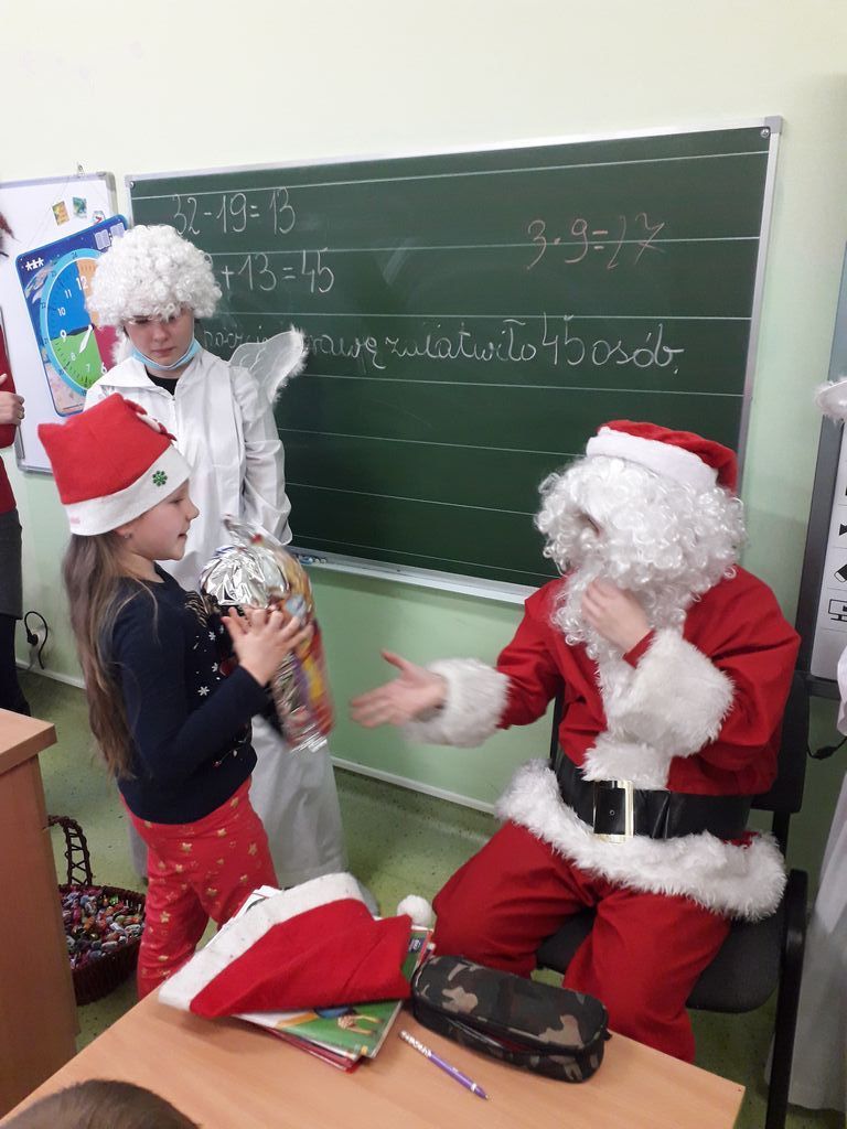 6 grudnia w progi naszej szkoły zawitał Święty Mikołaj wraz z obstawą. Na ten dzień czekali z niecierpliwością wszyscy, jednak szczególnie najwięcej emocji i radości „niecodzienna wizyta” wzbudziła w najmłodszych klasach. Wszystkim dopisywały doskonałe humory. W podziękowaniu za prezenty i kosz pełen słodyczy dzieci śpiewały piosenki i recytowały piękne wiersze. Odważniejsi uczniowie próbowali nawet Mikołaja szarpnąć za brodę, żeby sprawdzić czy prawdziwa. Była również okazja do zrobienia sobie pamiątkowych zdjęć ze Świętym Mikołajem.