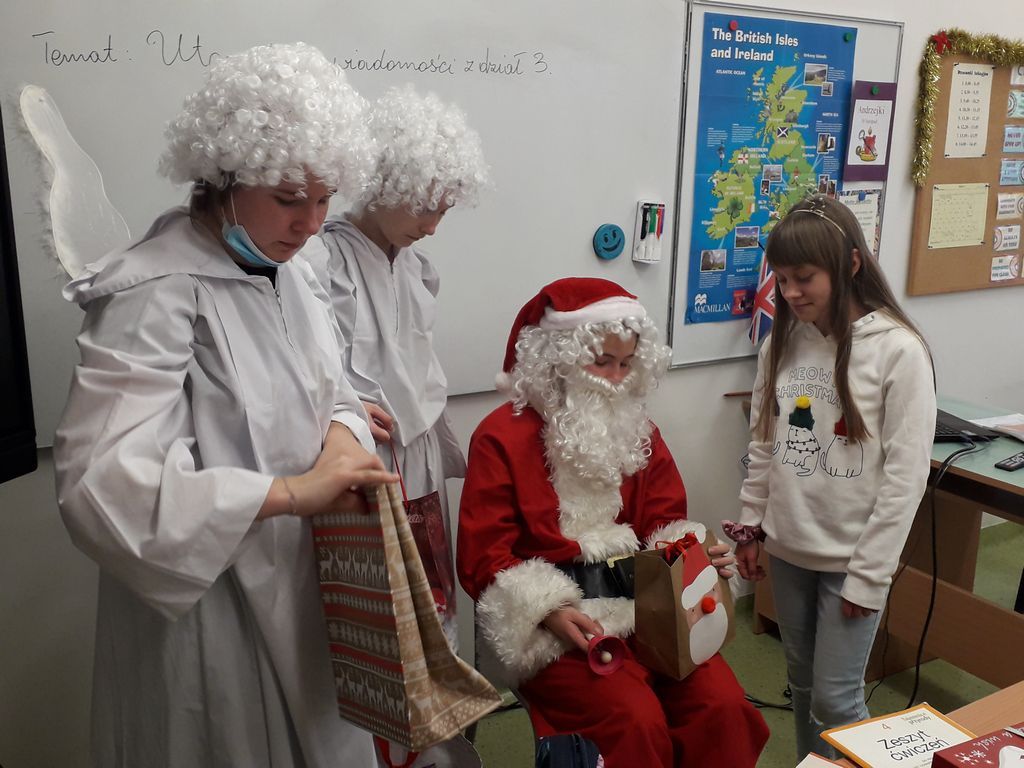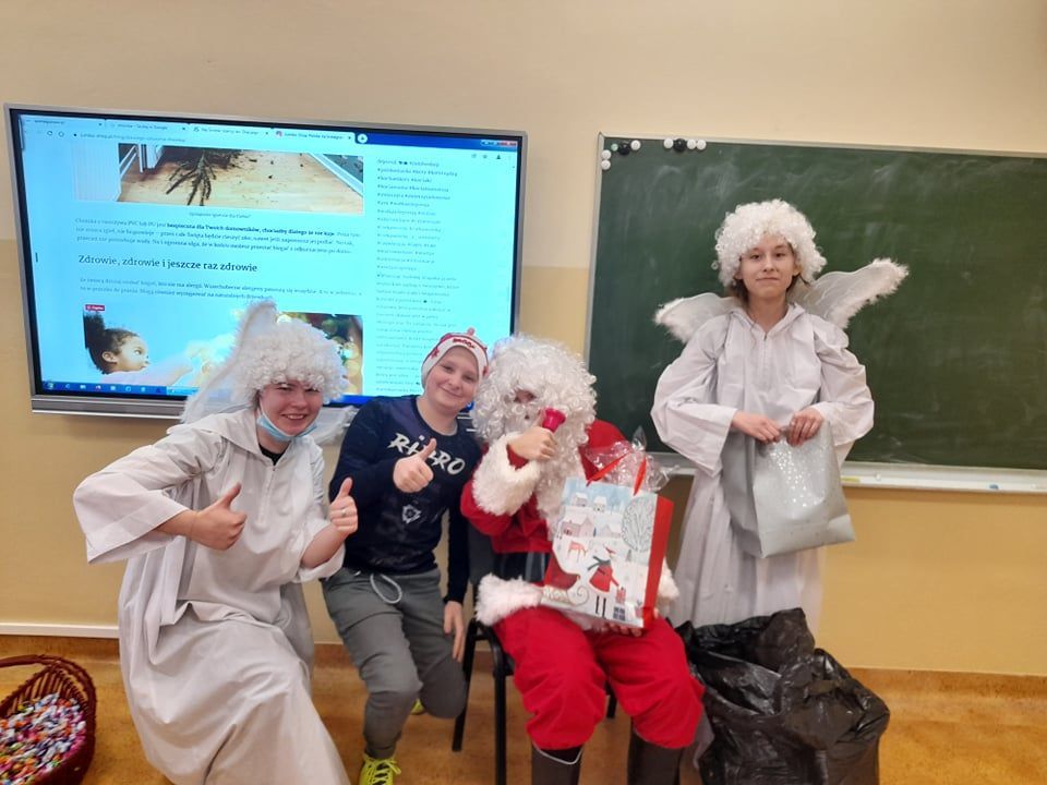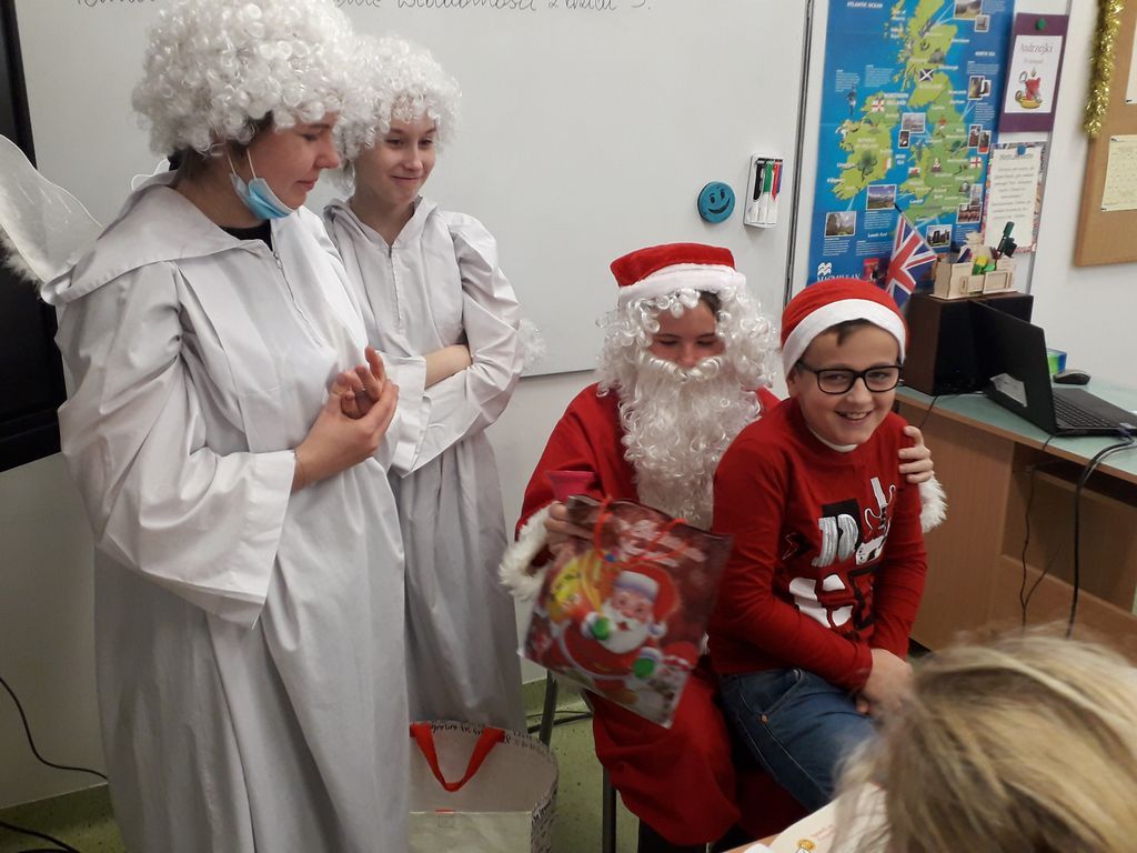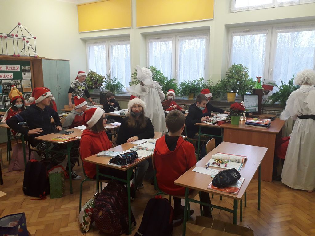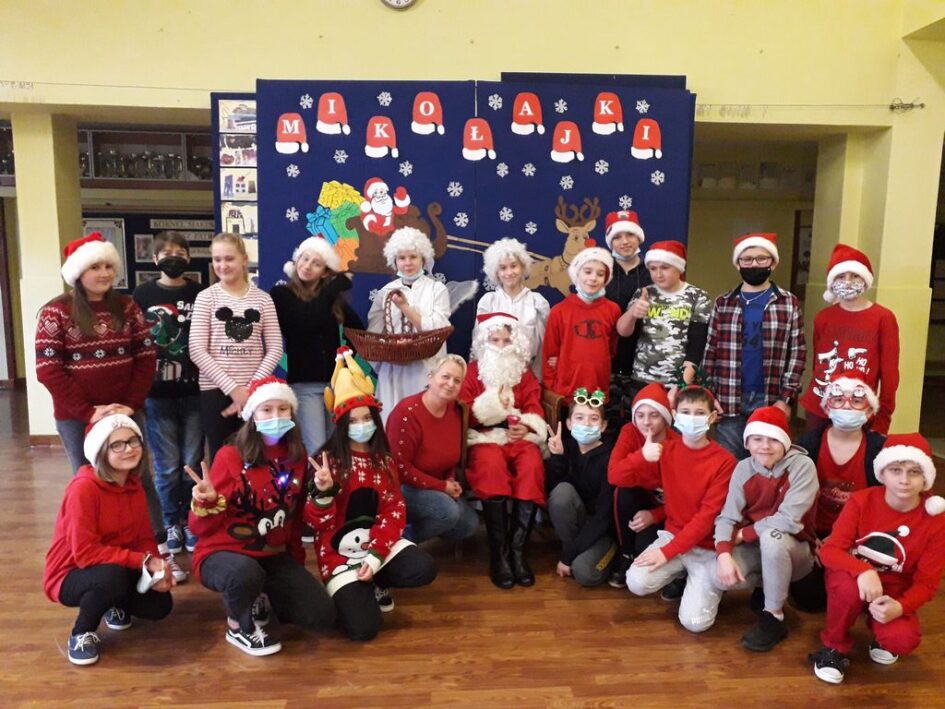 Ponadto, w tym dniu na korytarzu szkolnym można było zauważyć mnóstwo czerwonych czapek i czapeczek oraz innych odświętnych strojów. A to wszystko dla Świętego Mikołaja, który ogłosił dodatkowy prezent dla wszystkich w czerwonych czapeczkach „dzień bez pytania”, z którego najbardziej cieszyli się starsi uczniowie.