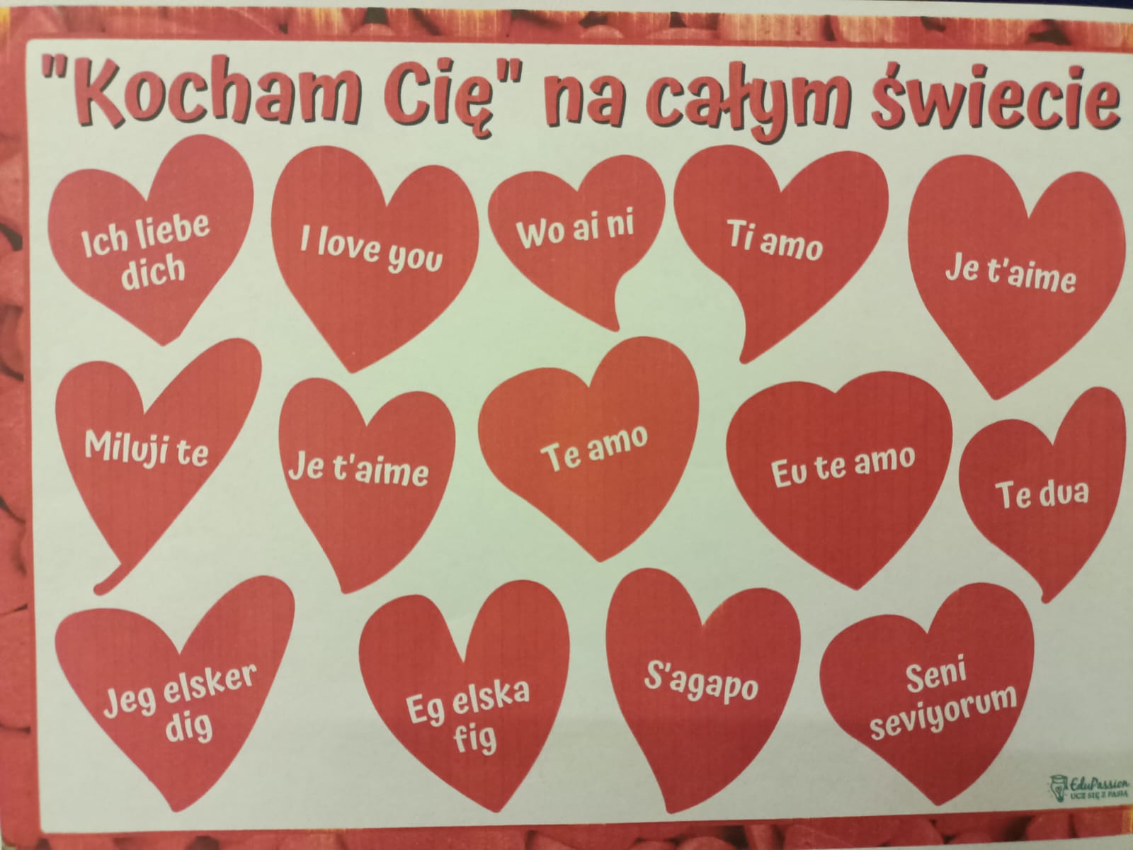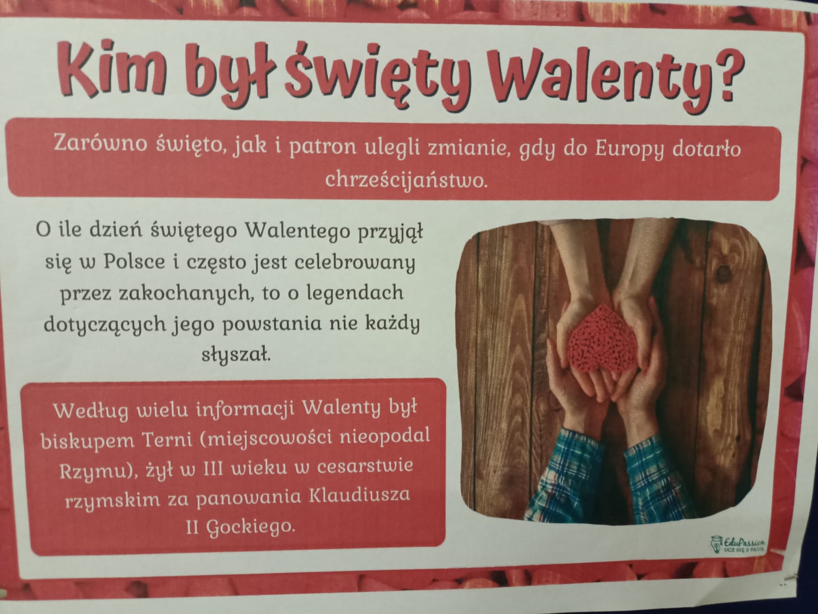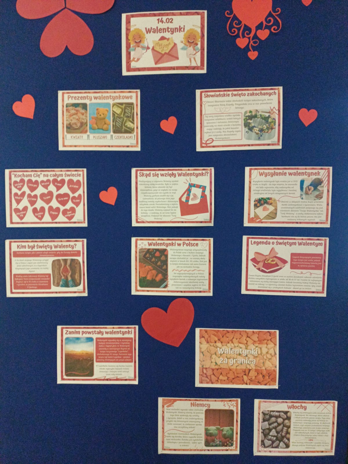 Z okazji Walentynek przygotowano także specjalną dekorację, która nie tylko ozdobiła szkolne korytarze, ale również dostarczyła wielu ciekawych informacji. Uczniowie mogli dowiedzieć się, skąd wzięły się Walentynki, jak brzmi słowo „kocham” w różnych językach oraz zapoznać się z legendą o Świętym Walentym – patronie zakochanych.