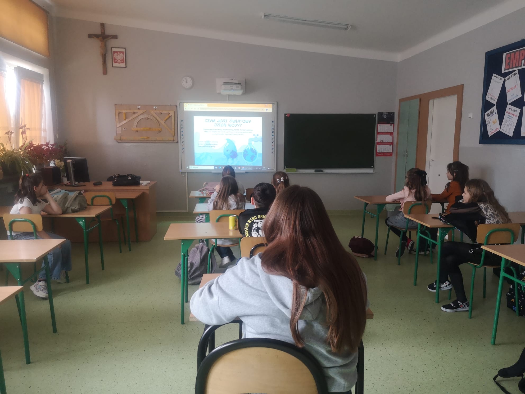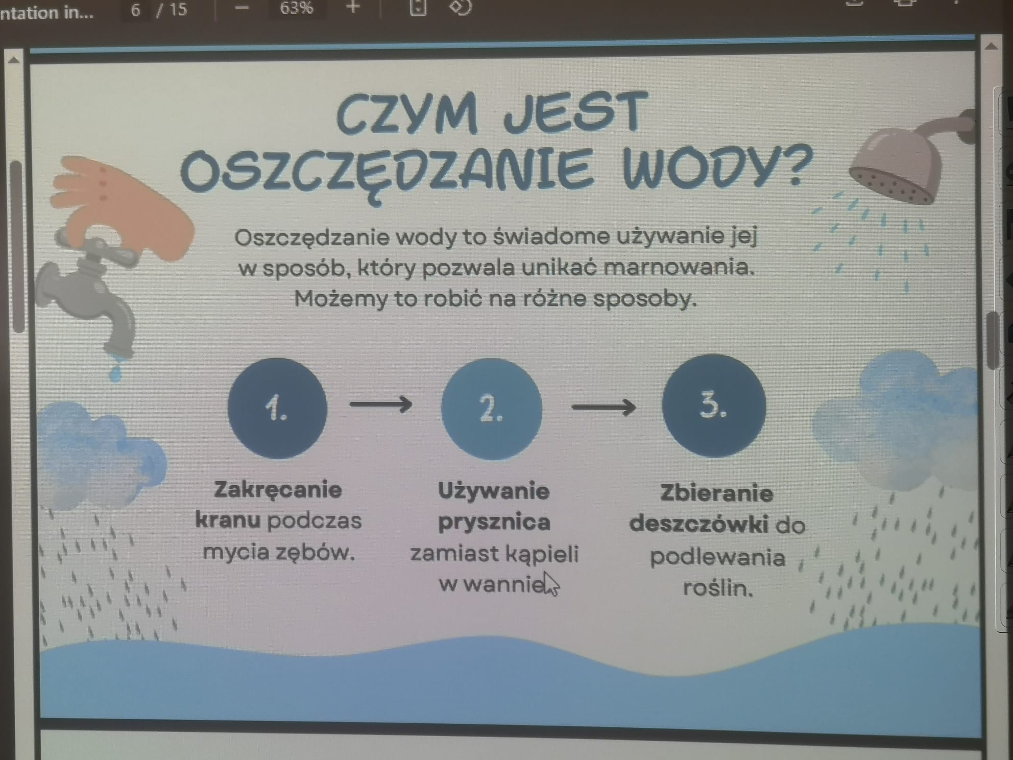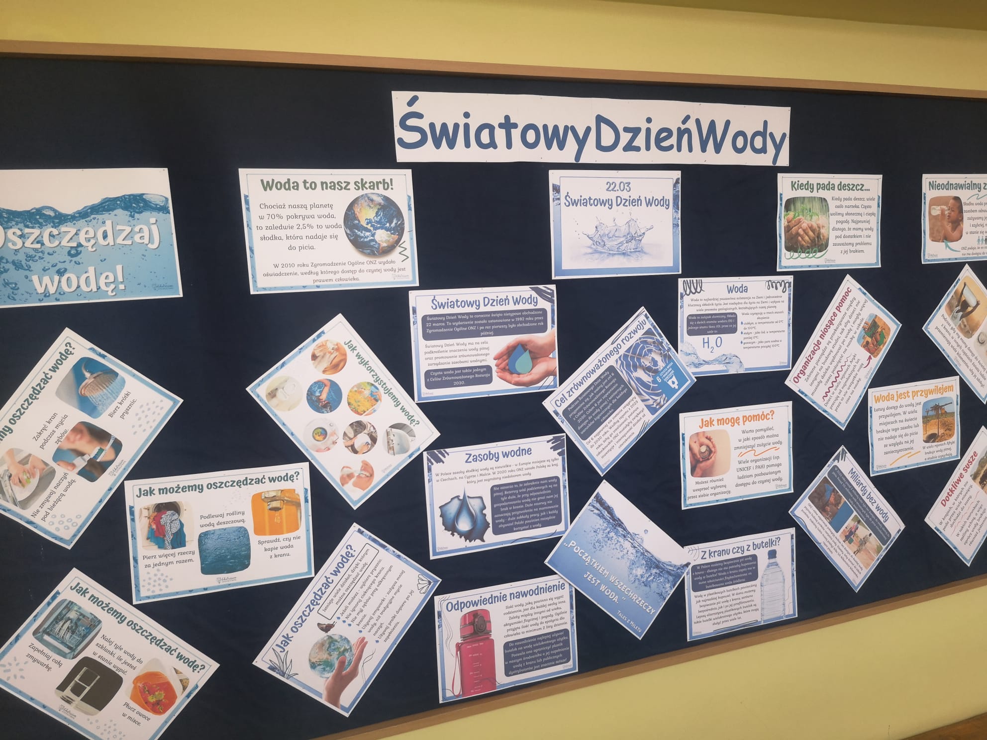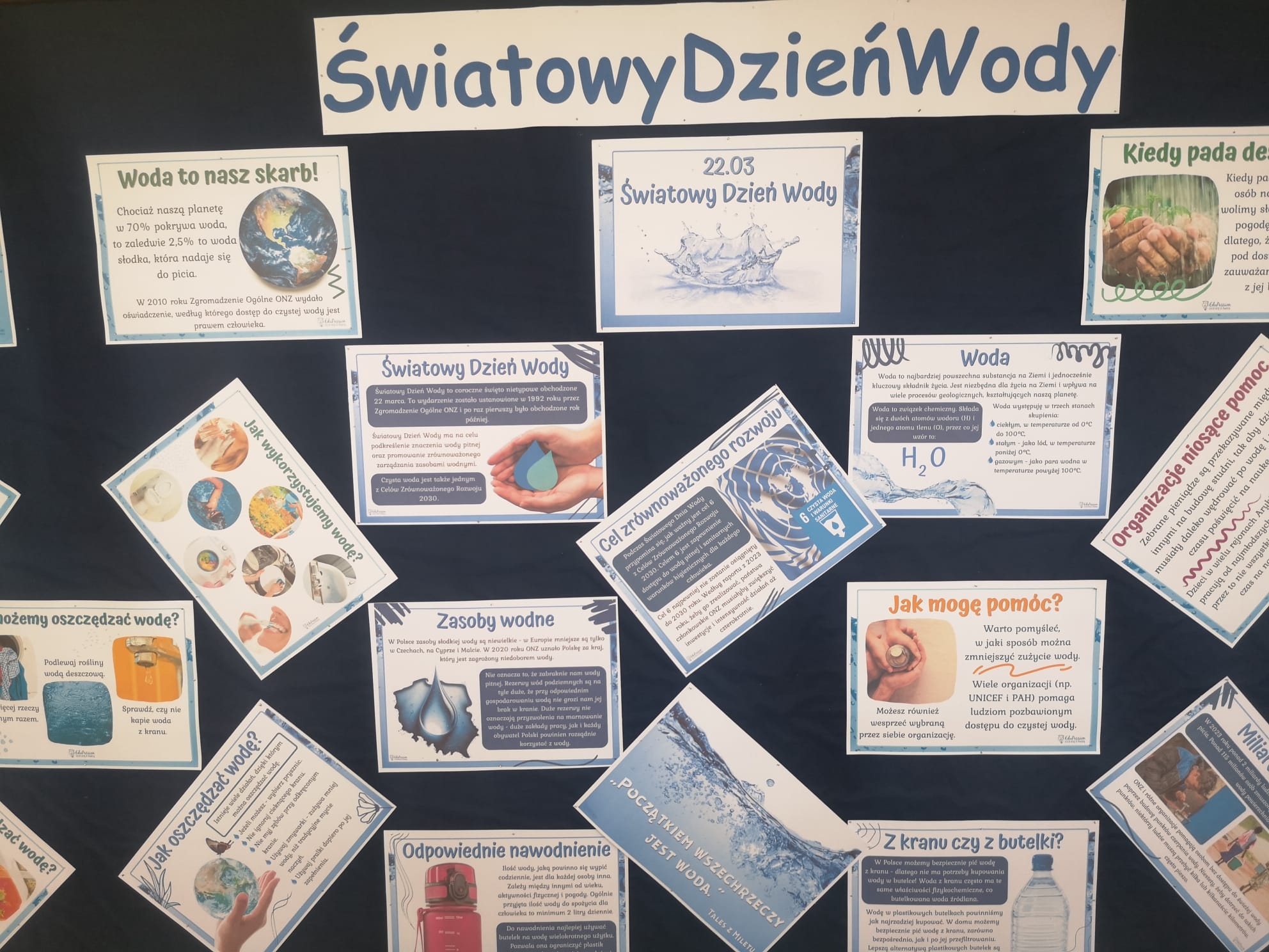 Z tej okazji przygotowaliśmy wiele ciekawych działań, które zaangażowały uczniów i pozwoliły im poszerzyć wiedzę na temat tego cennego zasobu. Już od rana uczniowie mogli podziwiać gazetkę szkolną poświęconą wodzie, na której znalazły się informacje o jej roli w przyrodzie, sposobach oszczędzania oraz ciekawostki dotyczące globalnych problemów związanych z wodą. Następnie w starszych klasach odbyła się prezentacja multimedialna, podczas której uczniowie dowiedzieli się, jak duży wpływ na wodę ma nasze codzienne życie i jak możemy dbać o jej zasoby. Prezentacja wzbudziła duże zainteresowanie i stała się doskonałym wstępem do dalszych działań. Kolejną atrakcją były quizy i zagadki, które sprawdziły wiedzę uczniów na temat wody. Rywalizacja była zacięta, a uczestnicy wykazali się dużą znajomością tematu. Nie zabrakło również twórczych wyzwań – uczniowie mieli okazję układać rymowanki i hasła o wodzie. Powstało wiele kreatywnych i zabawnych utworów, które później zostały zaprezentowane na forum klasy.
