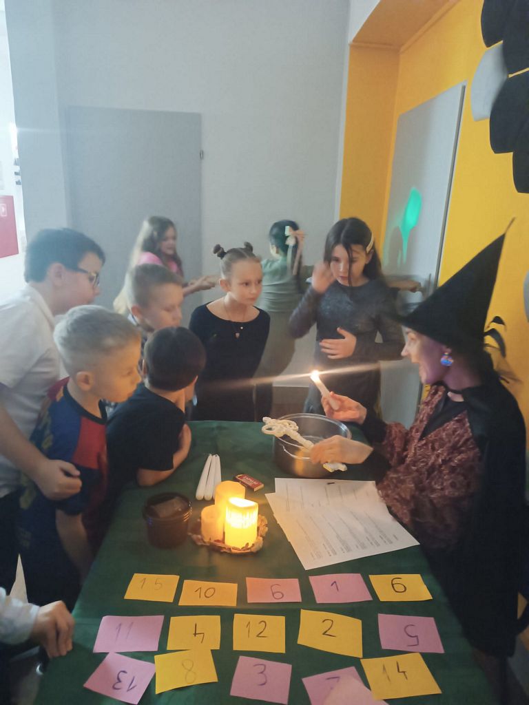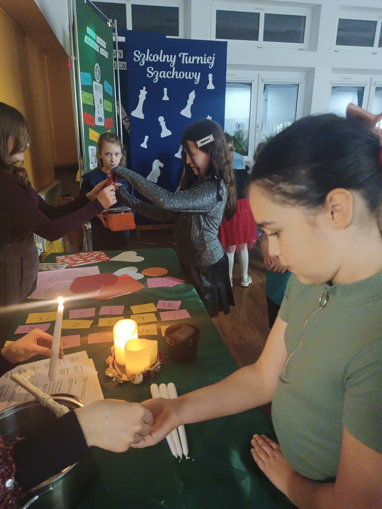 Nie mogło zabraknąć również najbardziej znanej andrzejkowej atrakcji, czyli lania wosku. Pani Karolina – jak co roku – z ogromną cierpliwością dbała o to, aby każdy uczeń mógł zobaczyć, jaki kształt pojawi się na wodzie i co może on oznaczać. Lanie wosku w jej wykonaniu powoli staje się piękną szkolną tradycją.