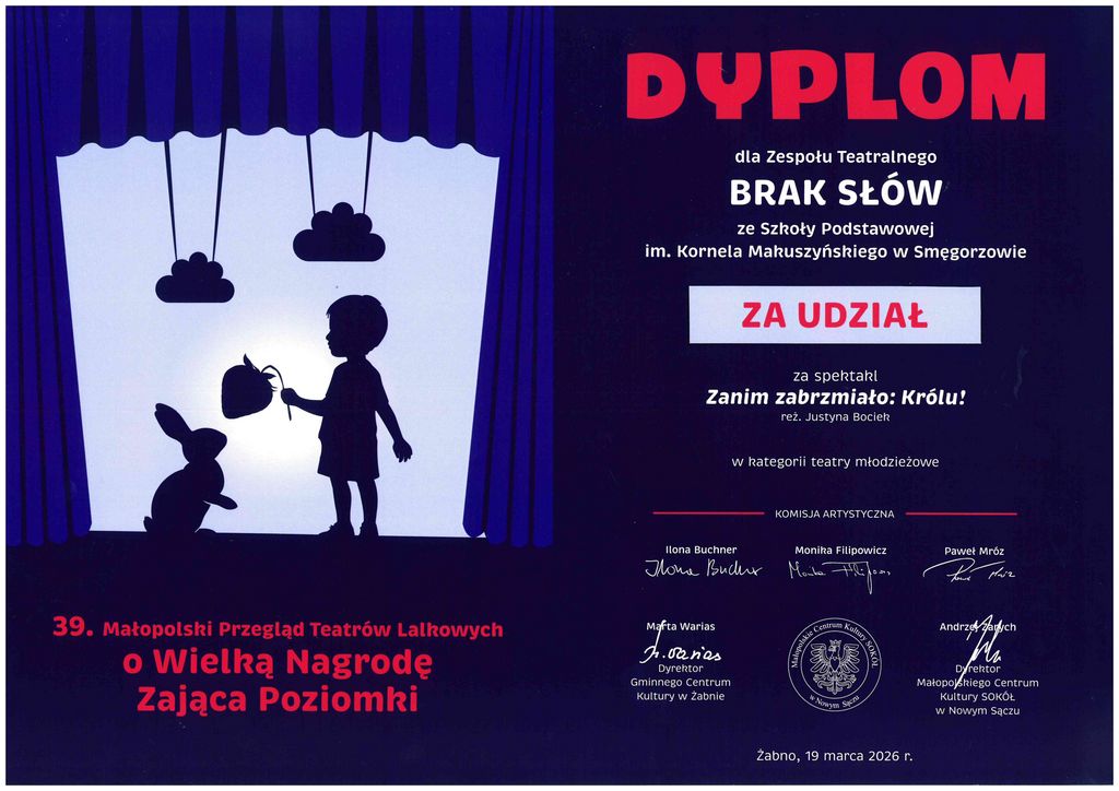 Wśród dziewięciu zespołów nie zabrakło reprezentantów naszej szkoły. Grupa teatralna „Brak Słów” z naszej szkoły zaprezentowała spektakl kukiełkowy pt. „Zanim Zabrzmiało: Królu!” w reżyserii pani Justyny Bociek. Przedstawienie ukazywało dzieje króla Bolesława Chrobrego, przenosząc widzów w świat początków polskiej państwowości. Tworzyło nastrojową, historyczną opowieść z elementami teatralnej symboliki. Spektakl przyciągnął uwagę odbiorców sceniczną wrażliwością oraz umiejętnym połączeniem słowa, ruchu i obrazu.
